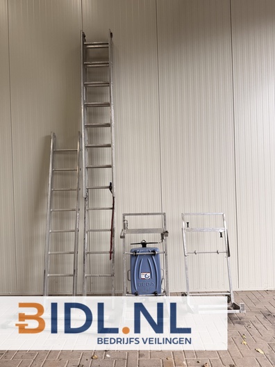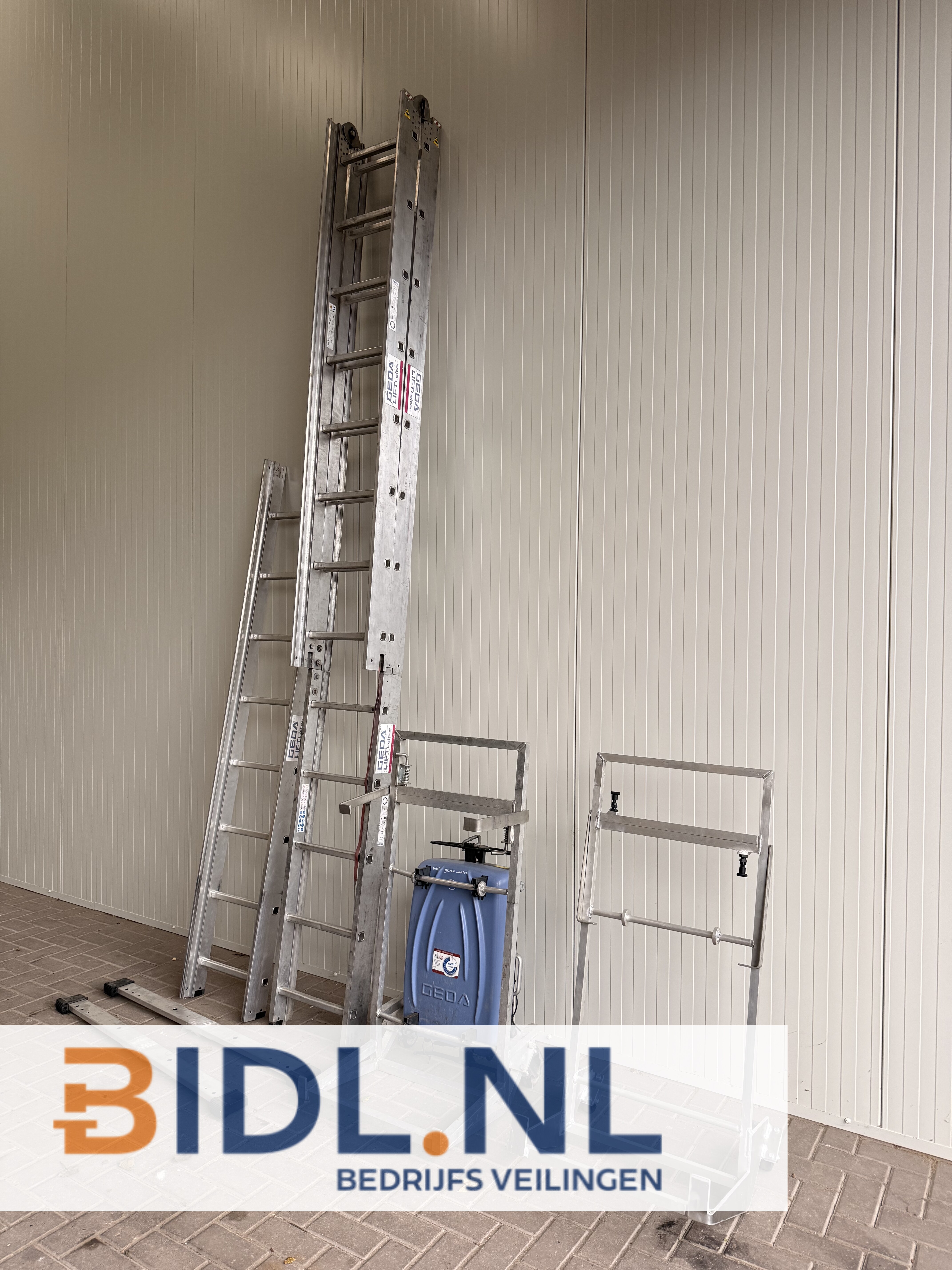 De set bestaat uit meerdere aluminium ladderdelen, een GEDA 250 Comfort lierunit met blauw kunststof motorbehuizing en diverse platformframes.