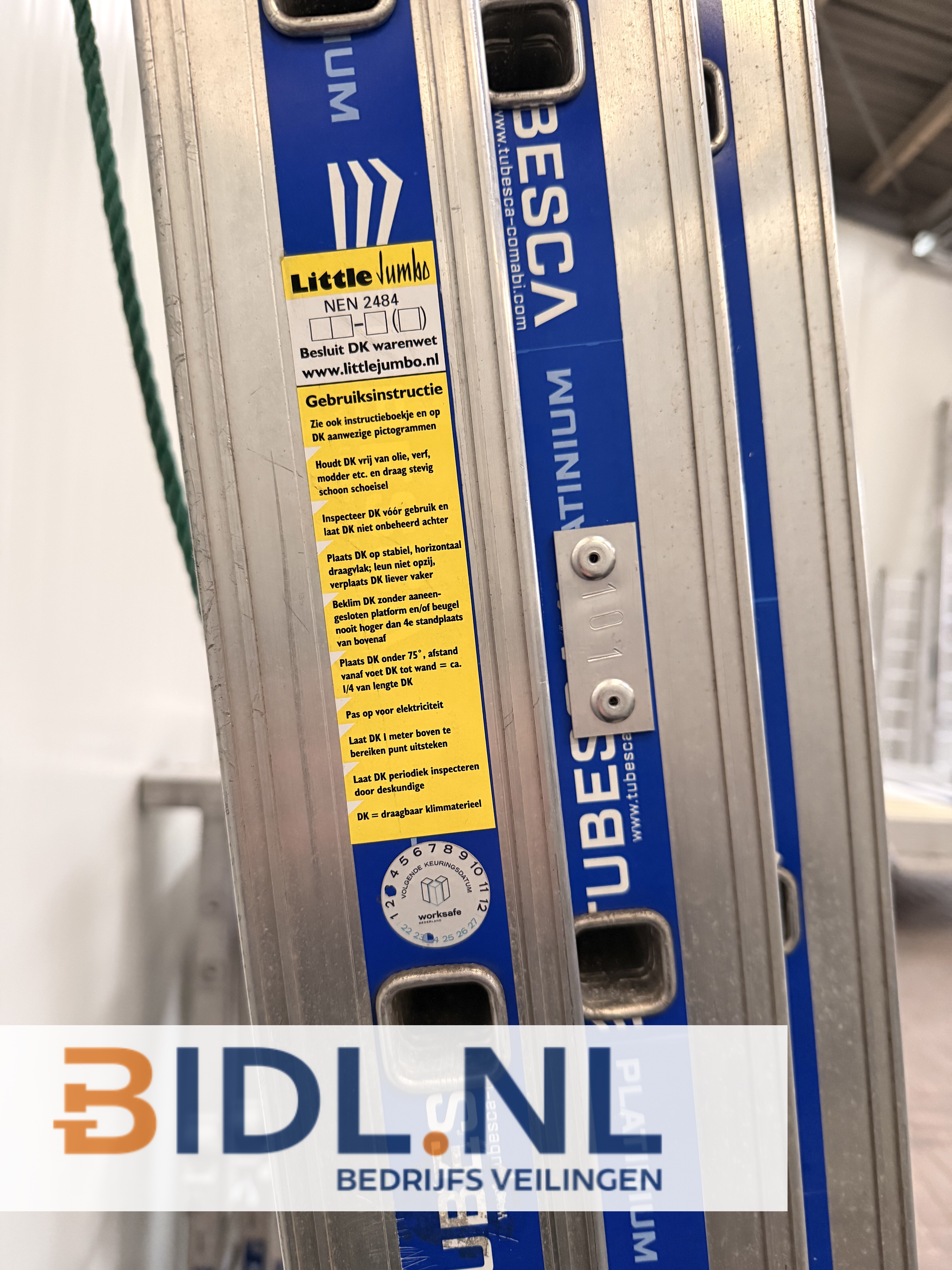 Professionele Tubesca Platinum 3x16 aluminium schuifladder met touwbediening en steunpootset voor maximale stabiliteit en gebruiksgemak.