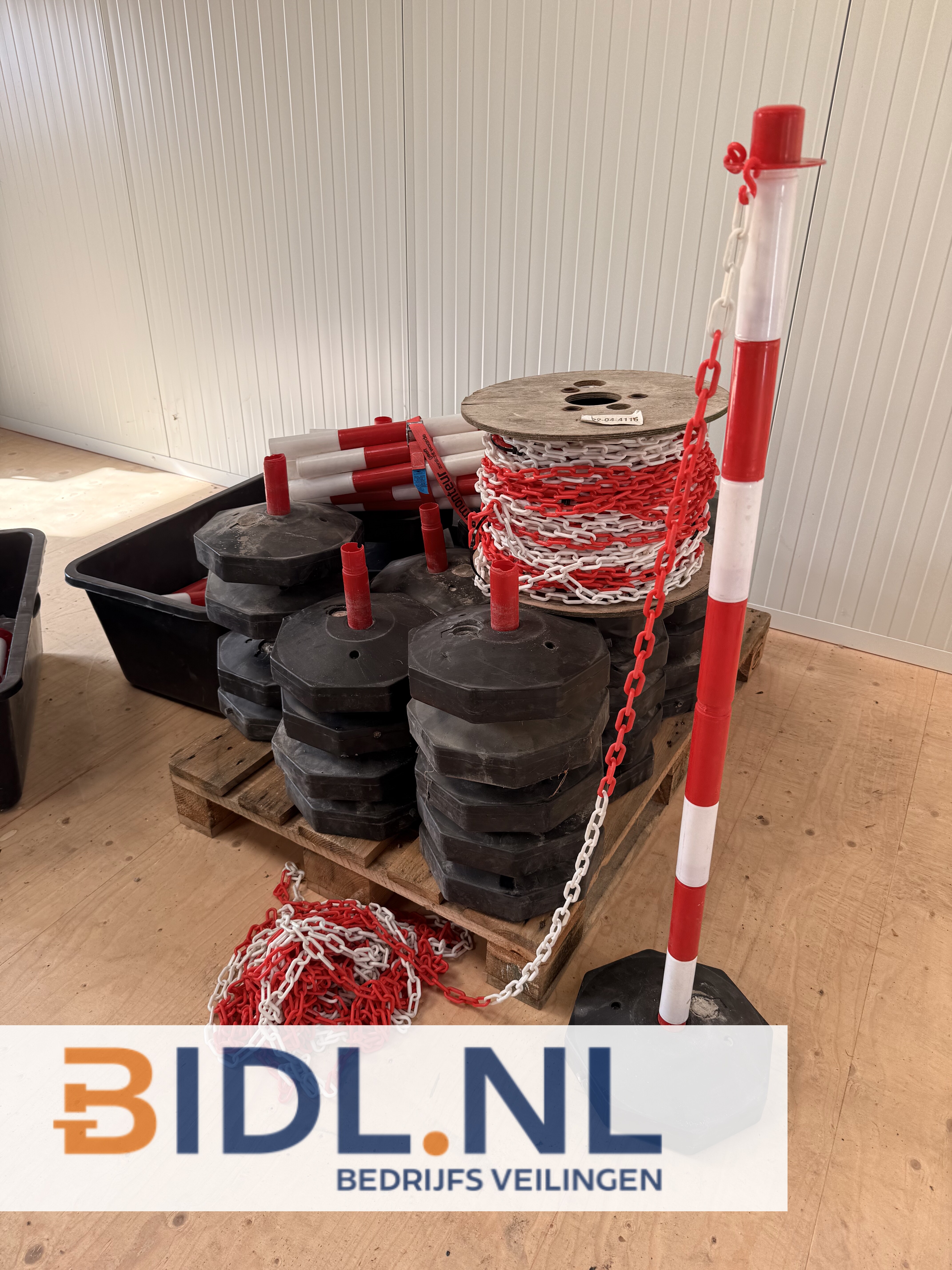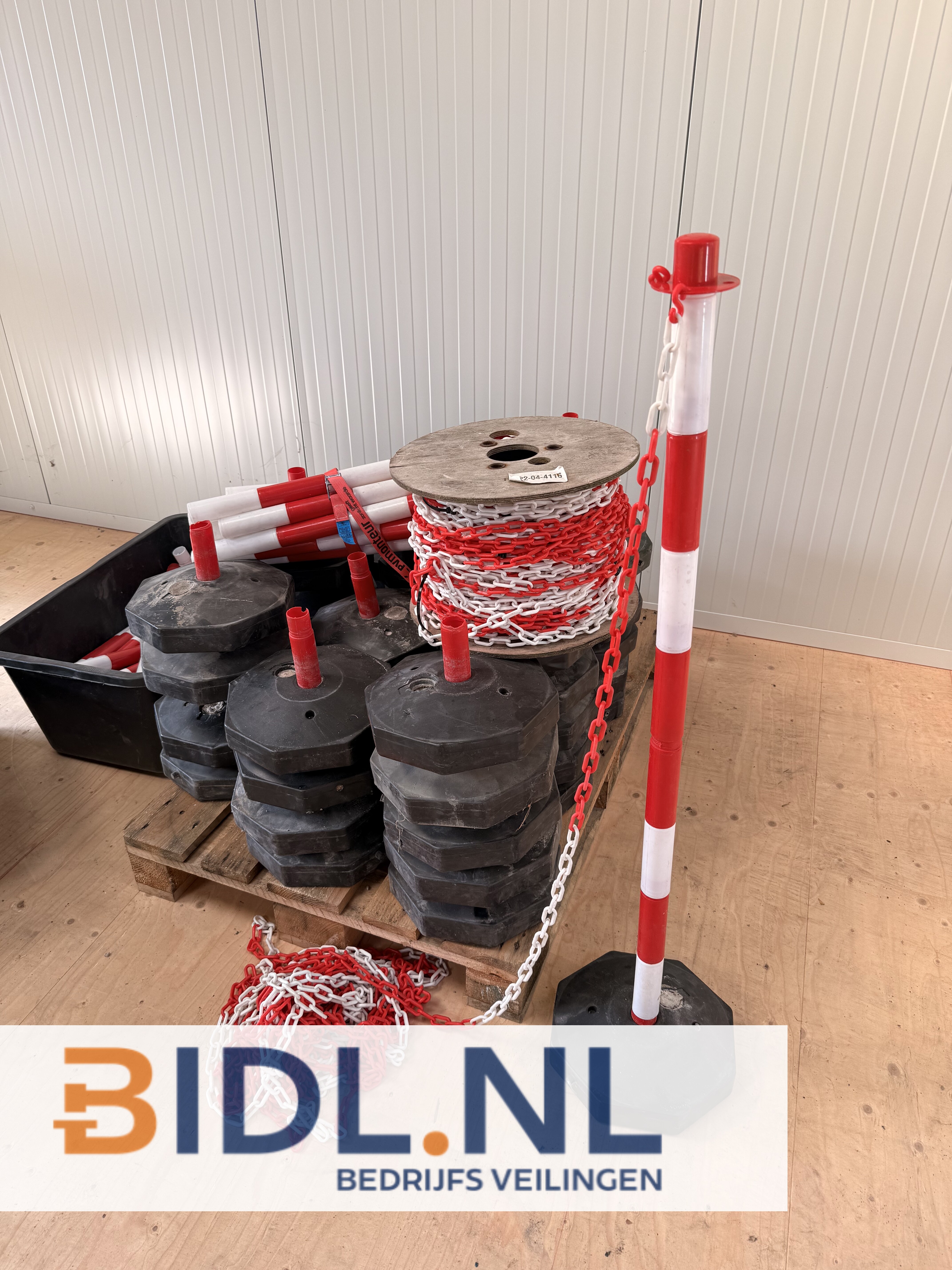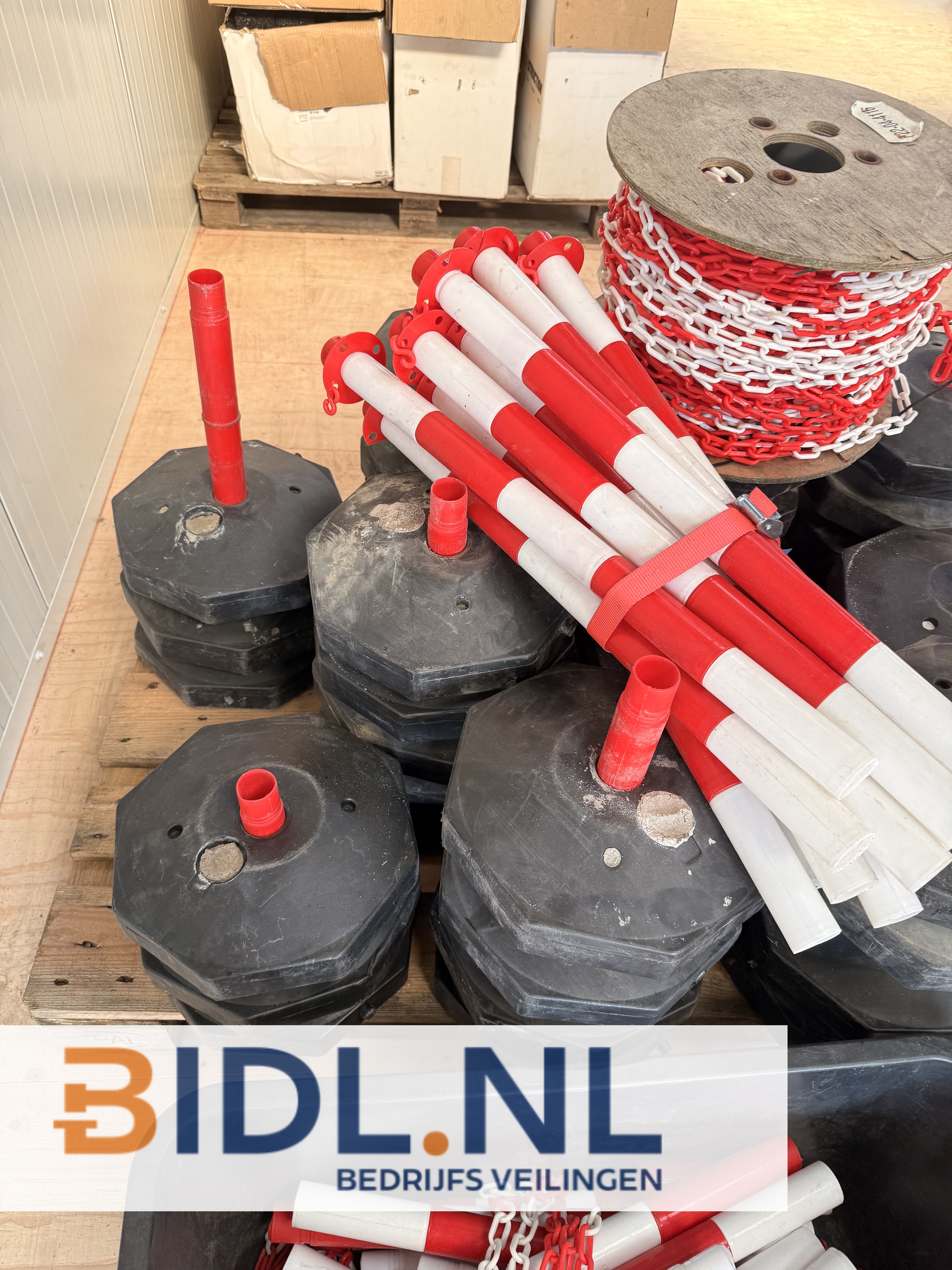 Volledige set rood-witte afzetpalen met voetplaten en kettingen.