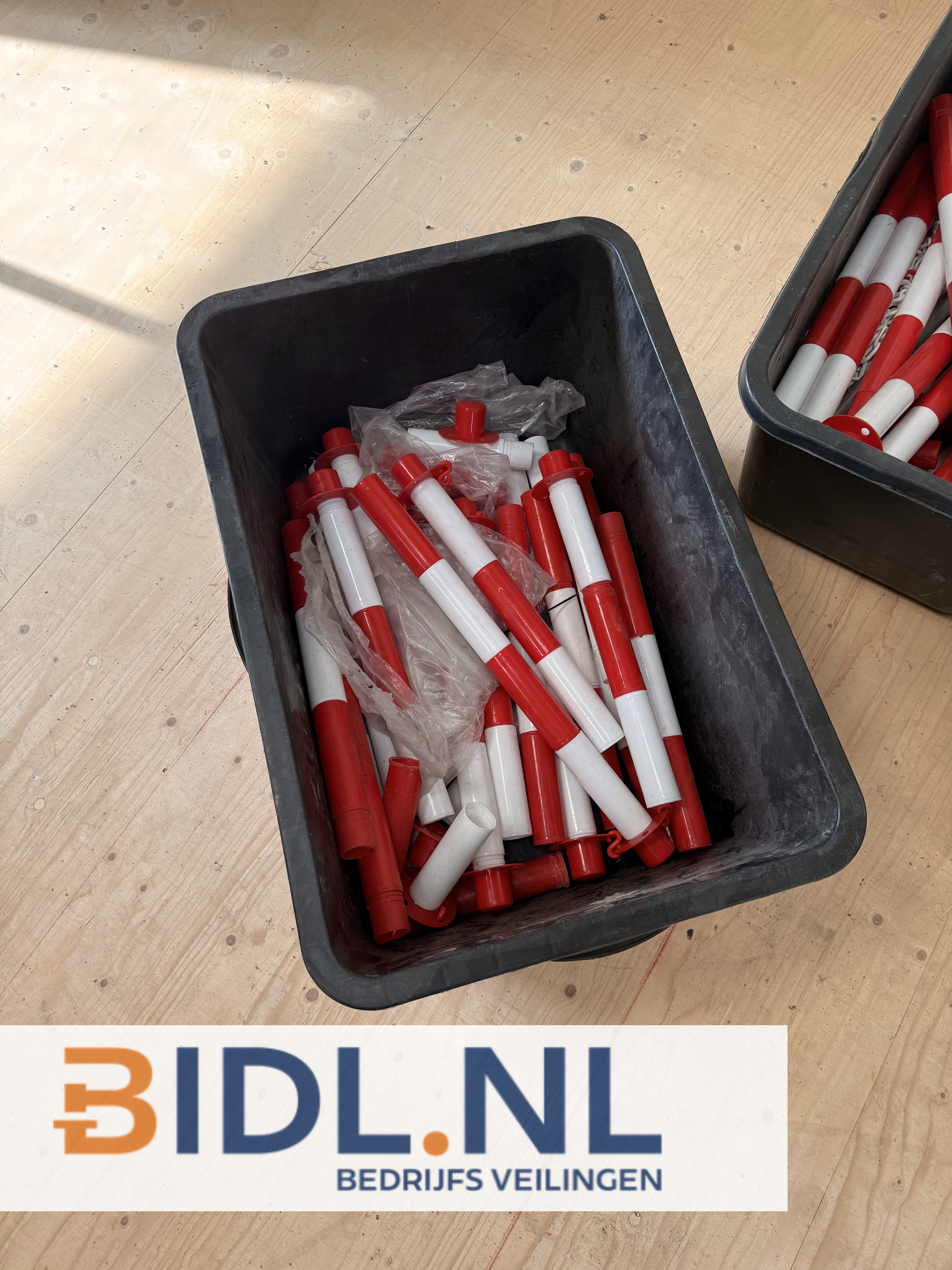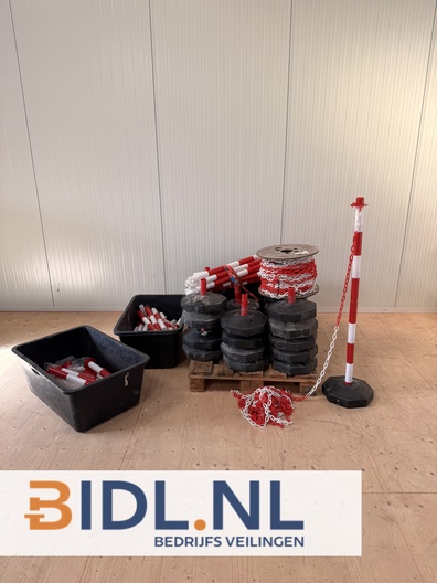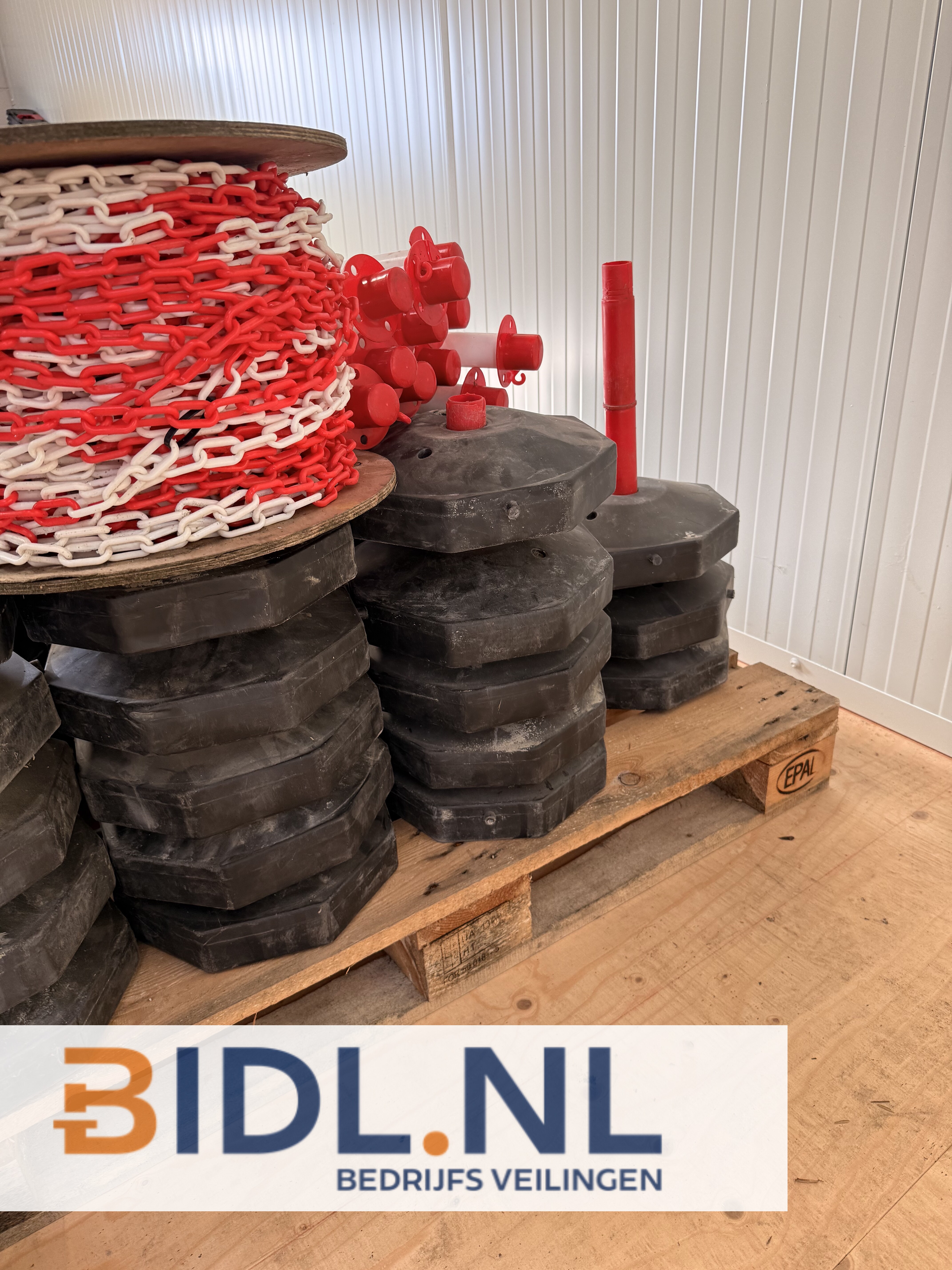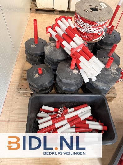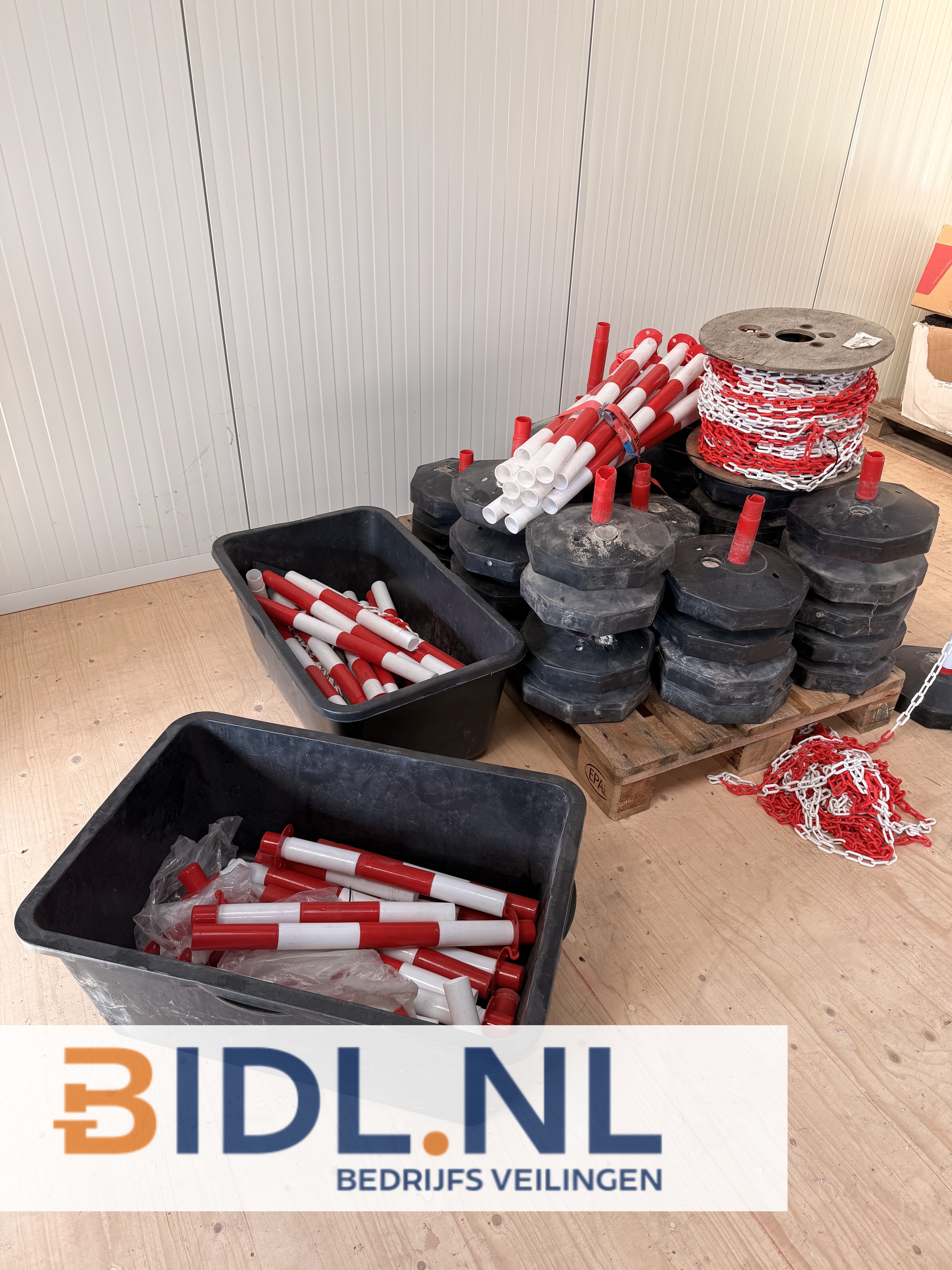 Volledige set rood-witte afzetpalen met voetplaten en kettingen.