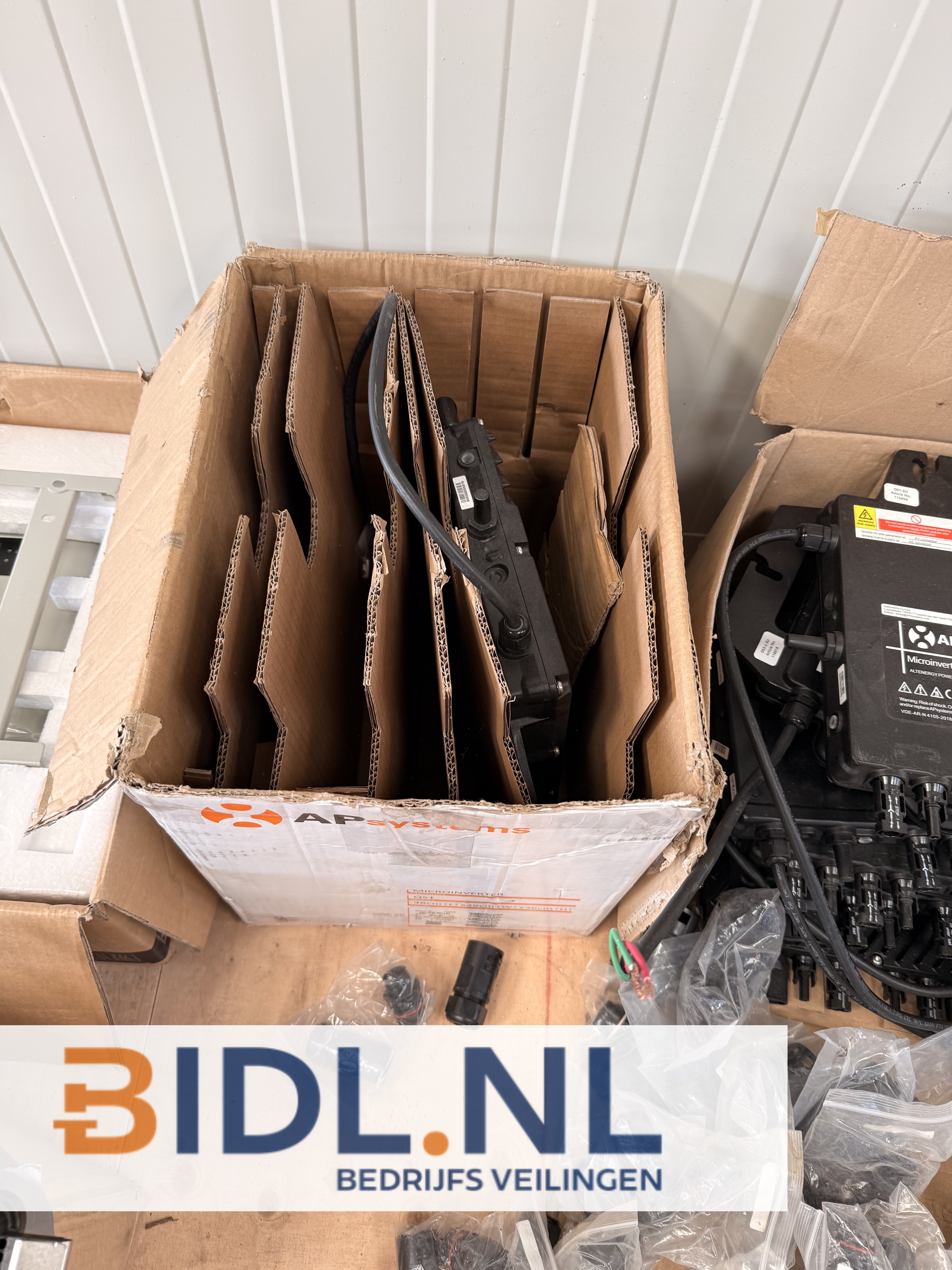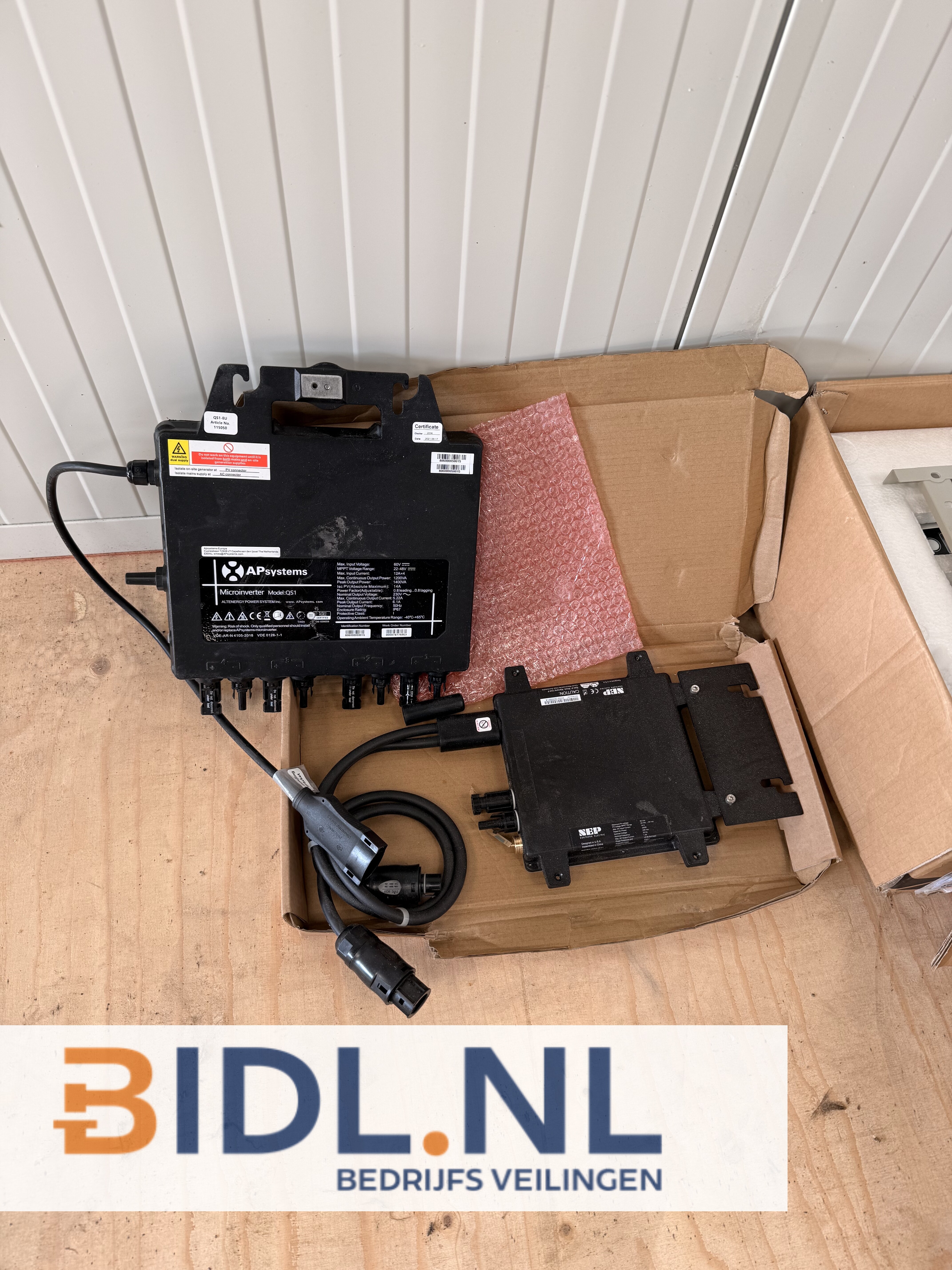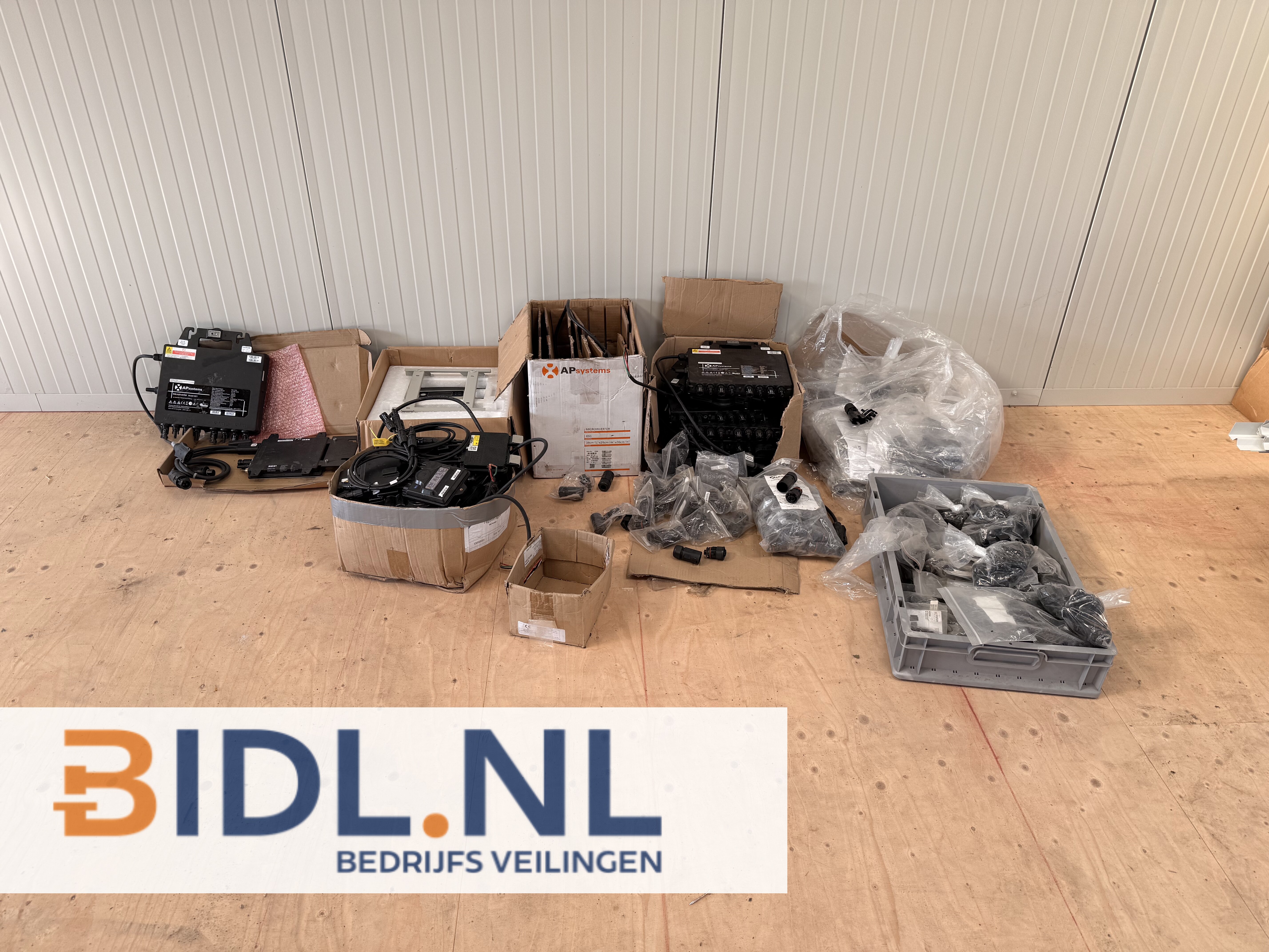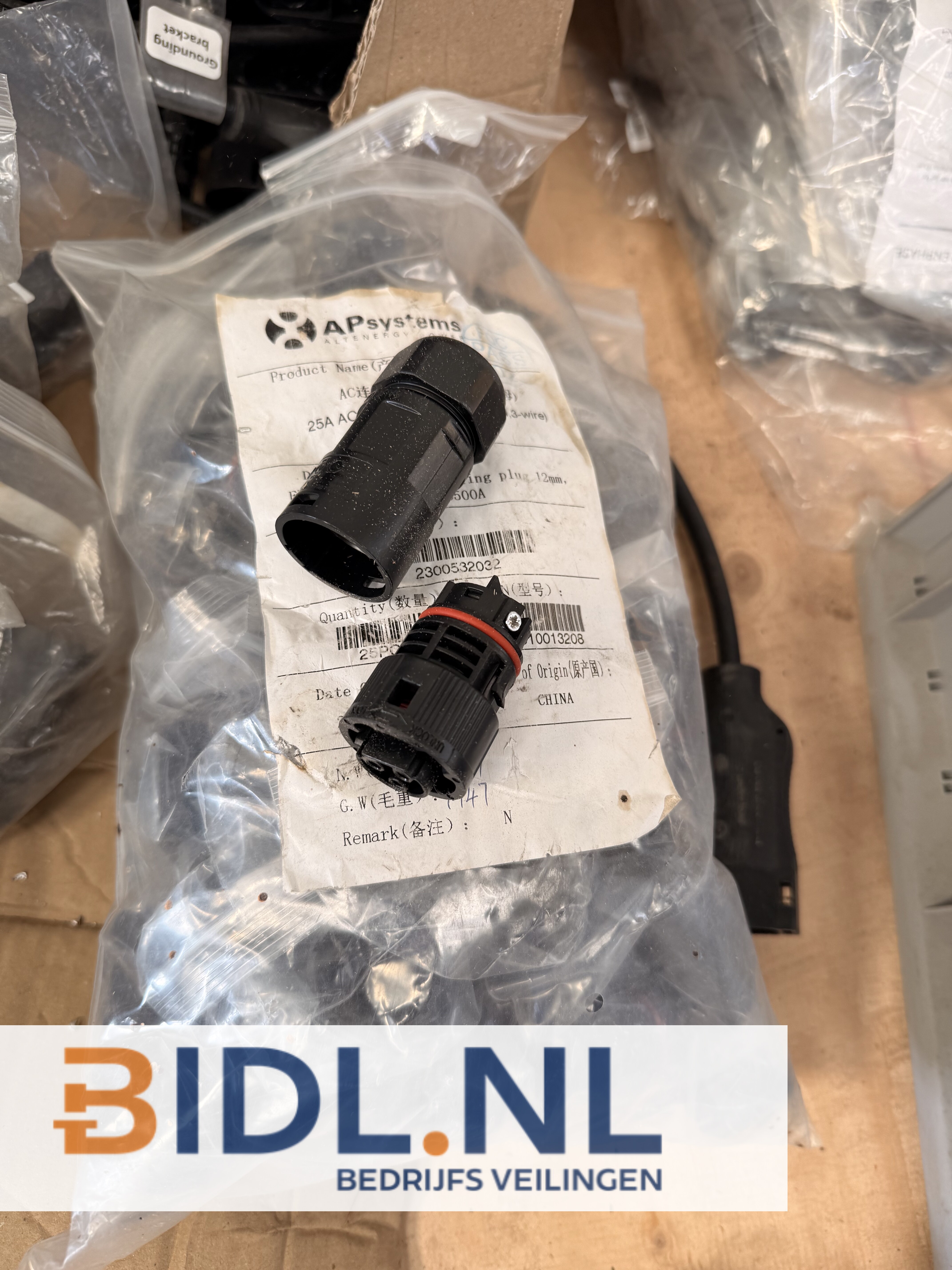 Complete partij APsystems micro-omvormers inclusief accessoires, connectoren en kabelsets.