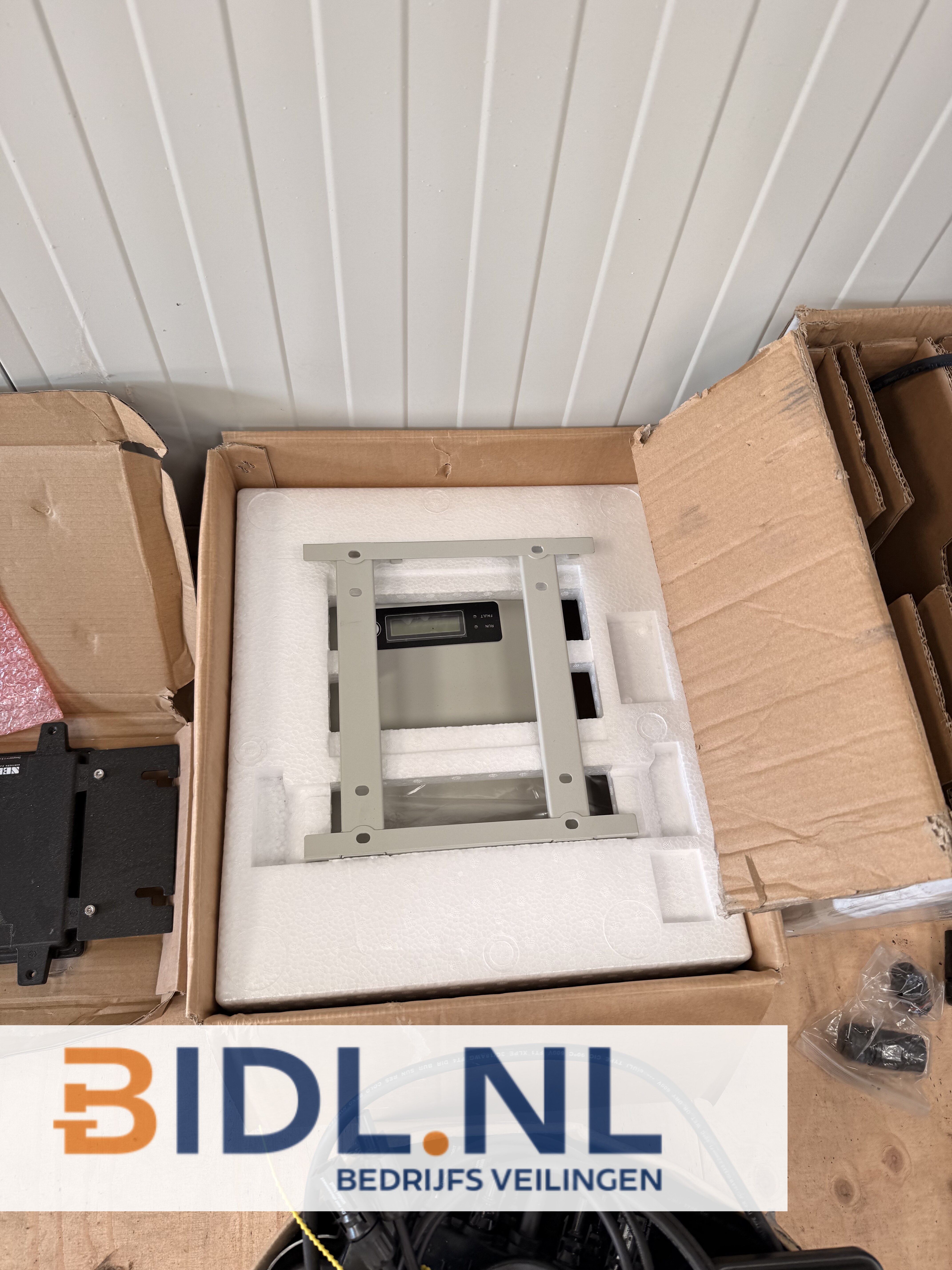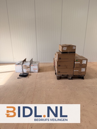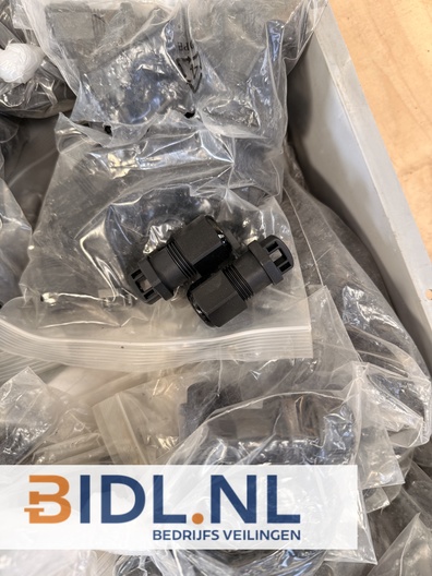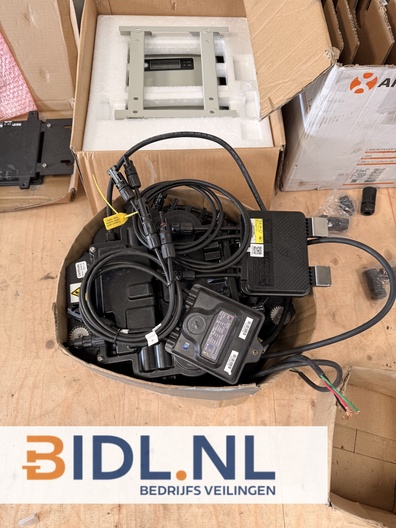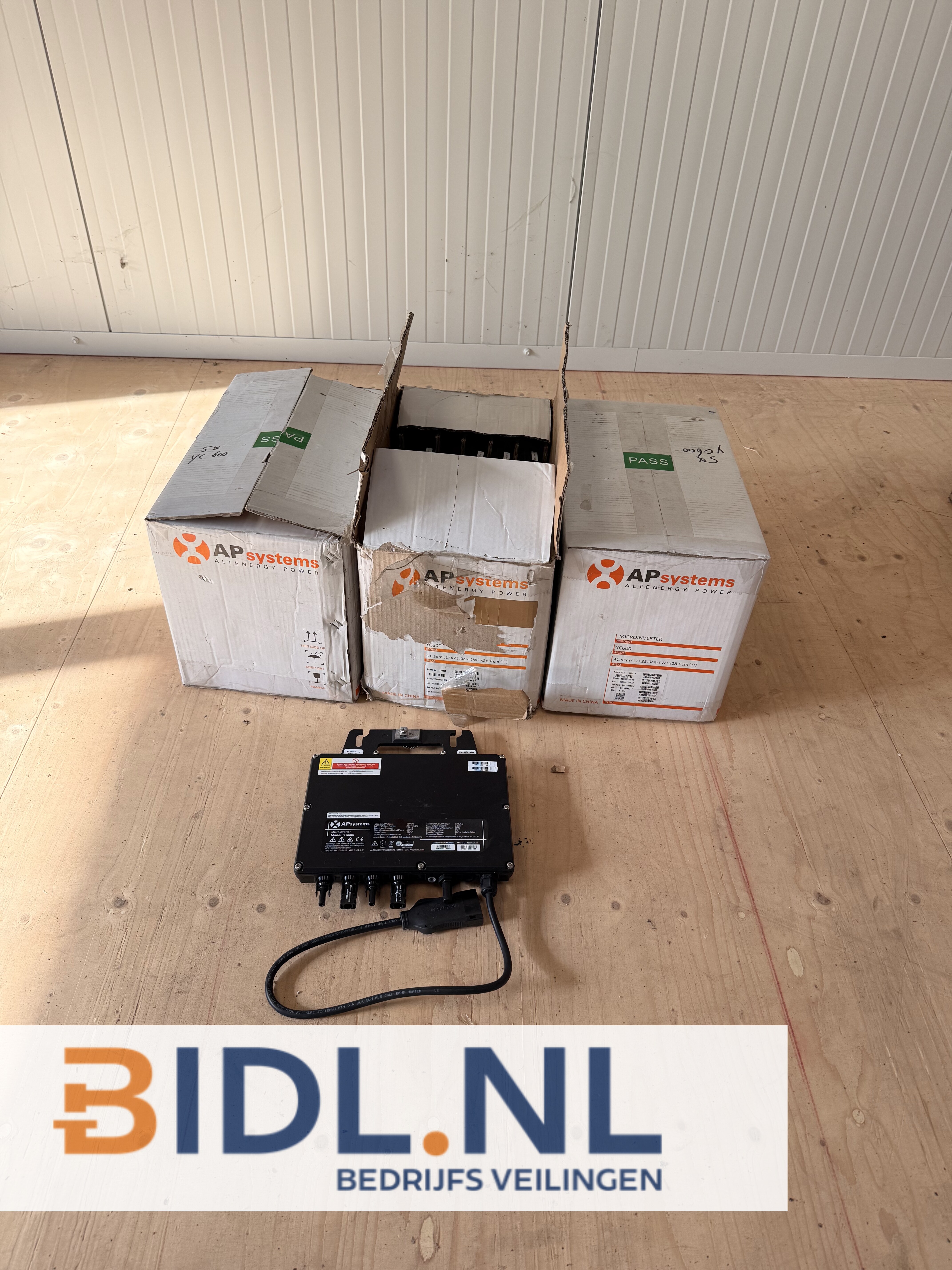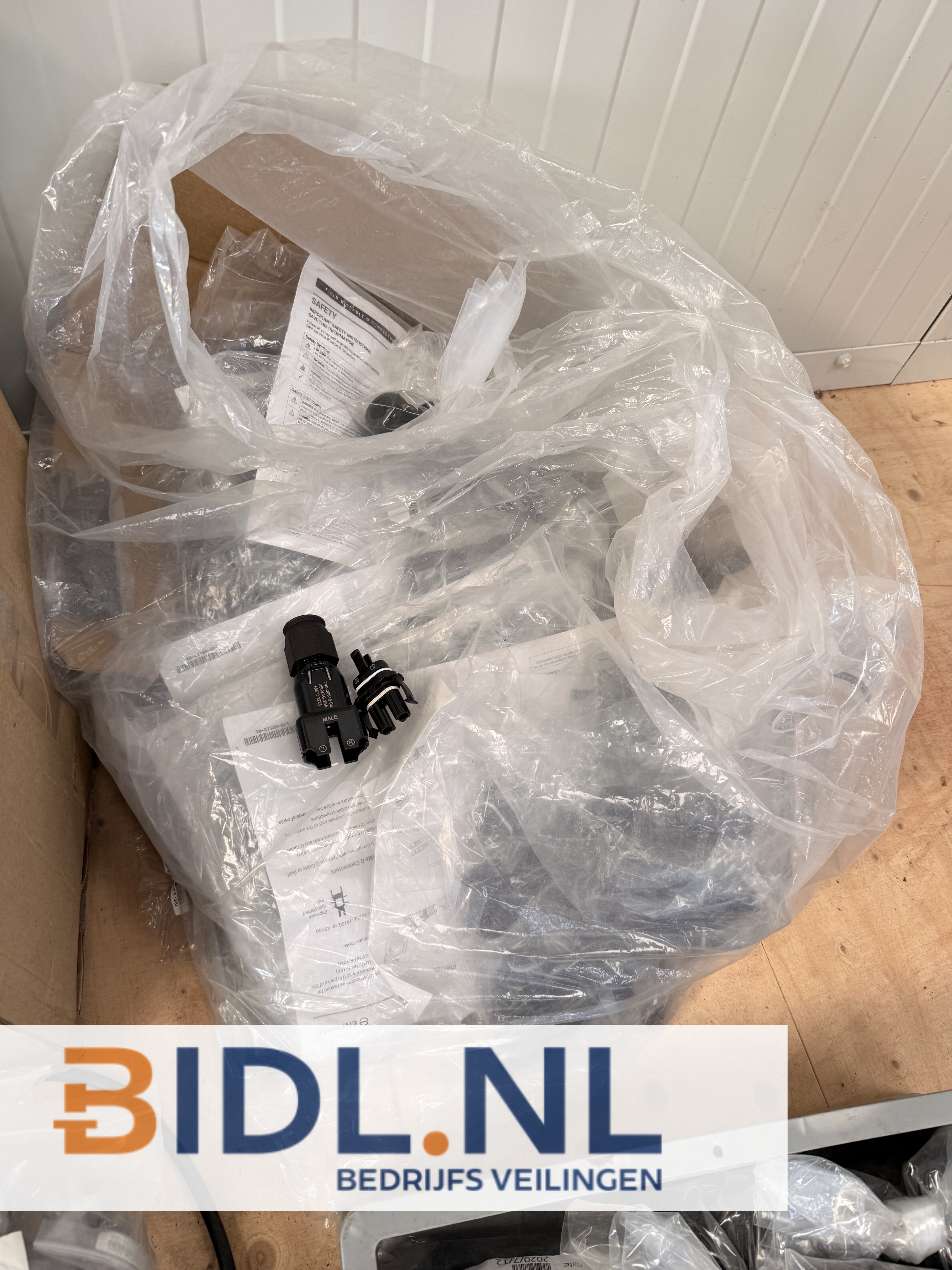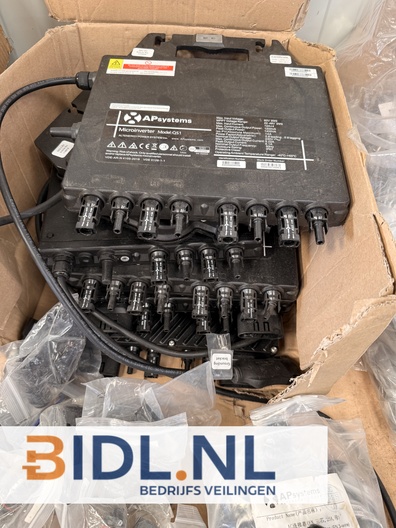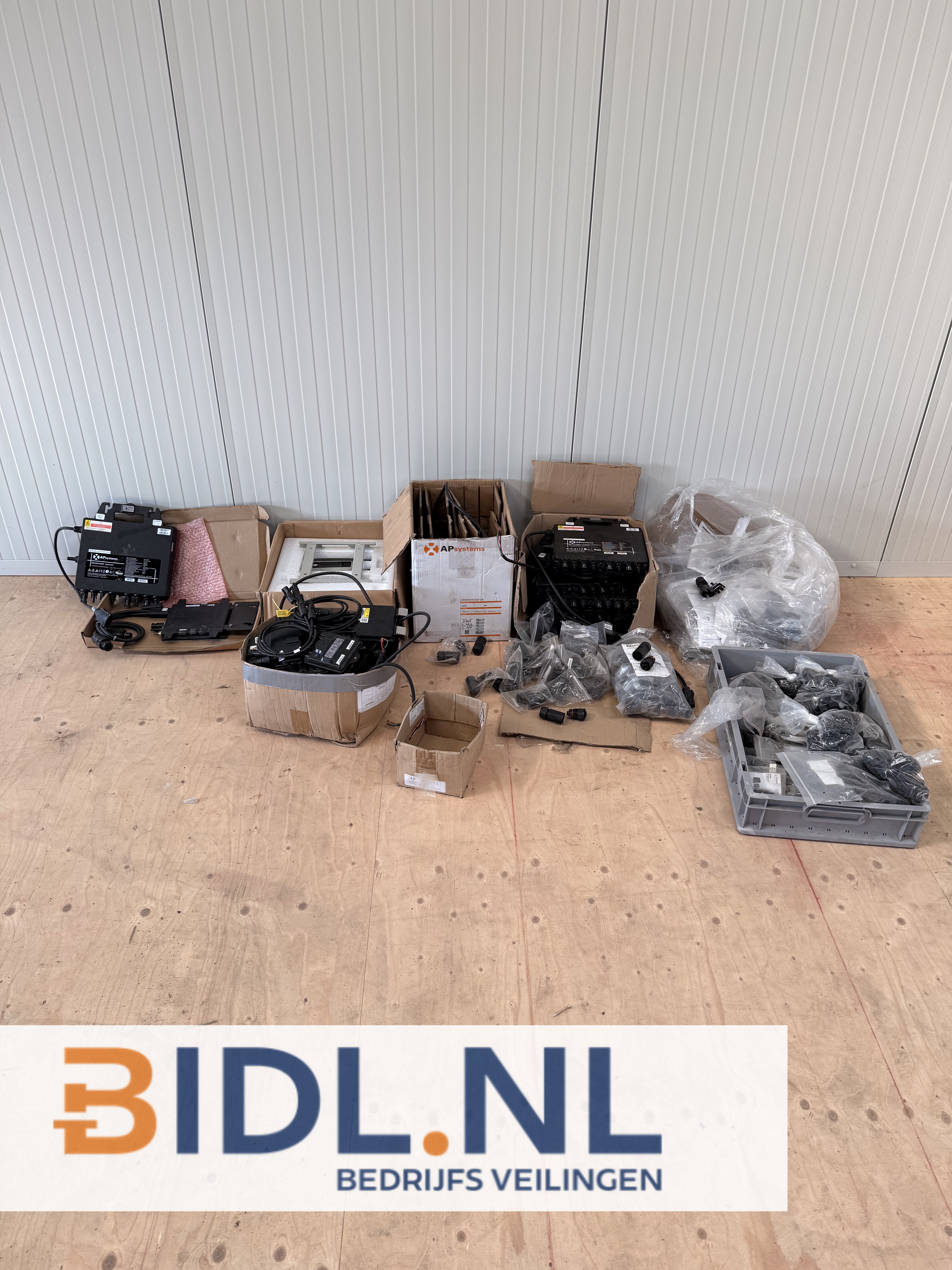Complete partij APsystems micro-omvormers inclusief accessoires, connectoren en kabelsets.