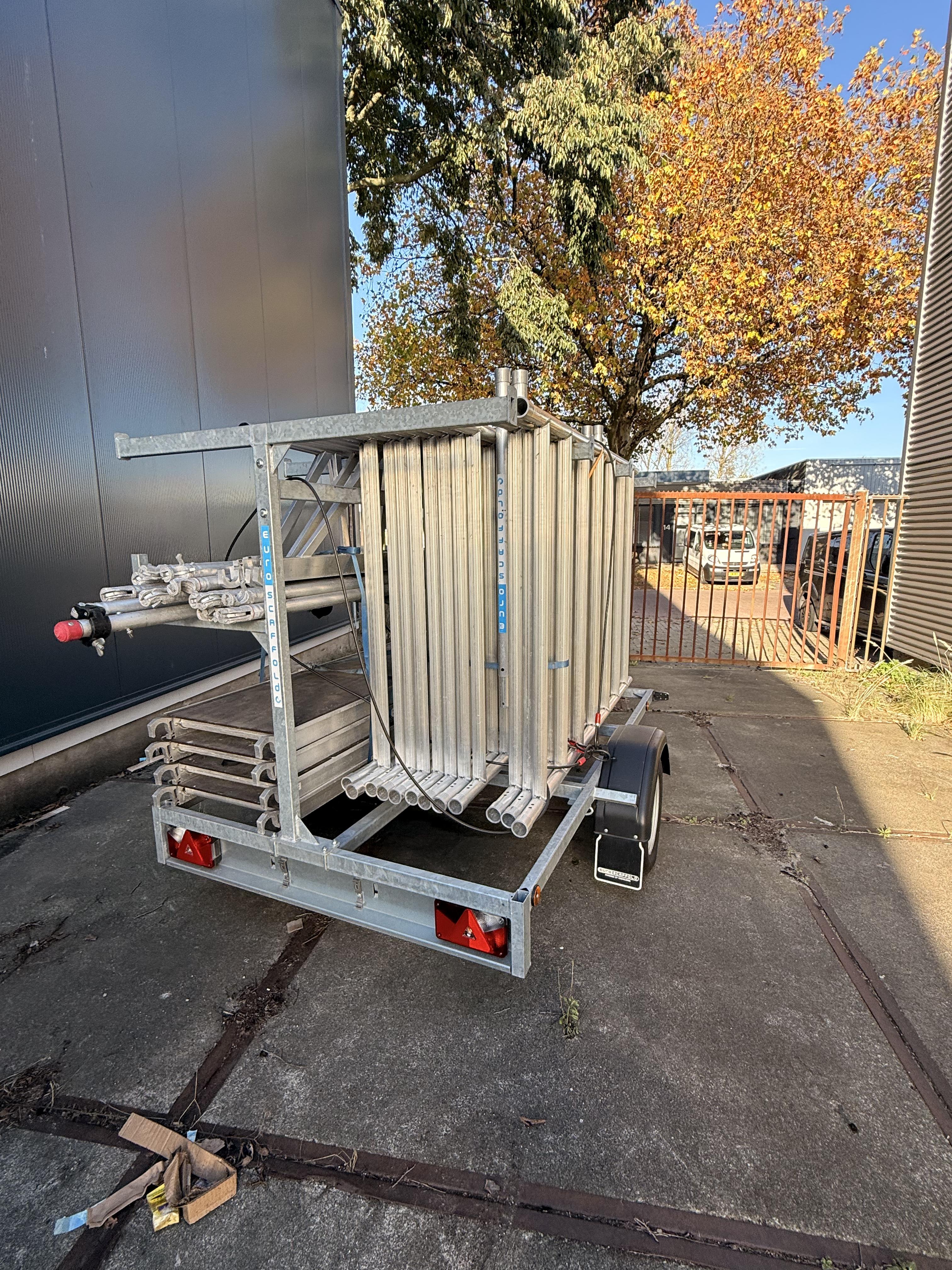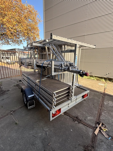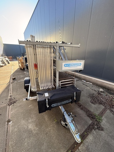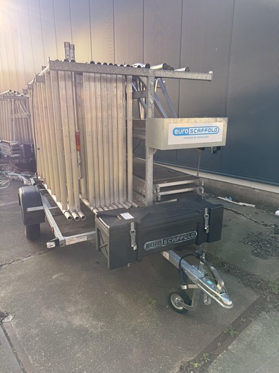 Professionele EuroScaffold steigeraanhanger met complete aluminium rolsteiger. Deze aanhanger is perfect voor bedrijven die efficiënt en veilig steigers willen vervoeren en opbouwen. Het systeem biedt een werkhoogte van ca. 10 meter, is licht van gewicht en volledig modulair. Specificaties: Merk: EuroScaffold Type: Steigeraanhanger compleet Materiaal steiger: Aluminium Platformen: 4 stuks met antislip vloer Inclusief: leuningen, frames, schoren, kantplanken Aanhanger: verzinkt staal, met slotbare disselkast Afmetingen aanhanger: ca. 3,0 m x 1,6 m Totale werkhoogte: ca. 10 m Conditie: Gebruikt, in nette en complete staat Direct klaar voor transport en montage Ideaal voor bouwbedrijven, schilders, installateurs en gevelspecialisten.