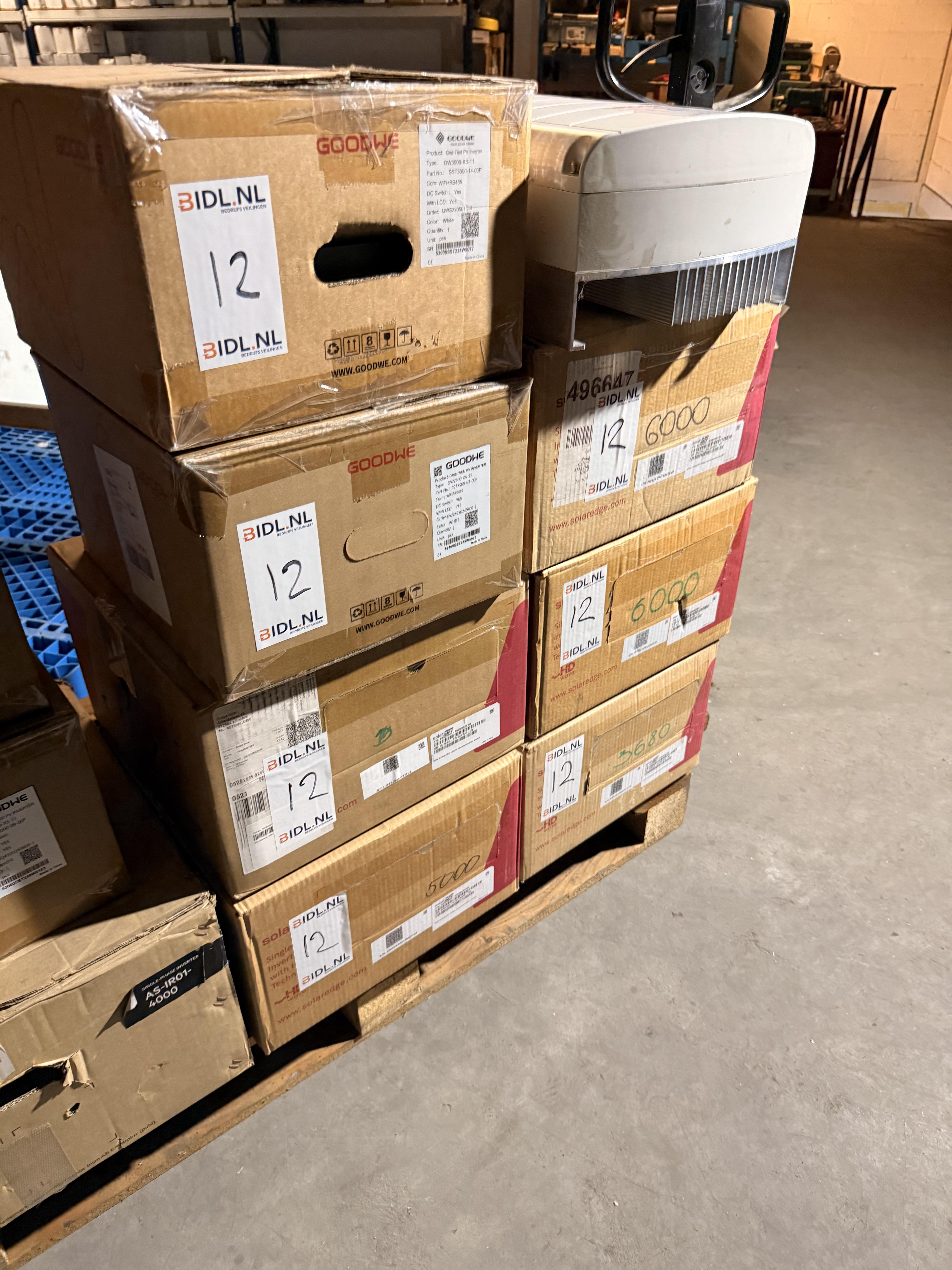 Partij bestaande uit meerdere PV Grid-Tied zonnepaneelomvormers van bekende merken GoodWe en SolarEdge. De partij bevat verschillende modellen met vermogens van 4000W tot 6000W. De meeste omvormers zijn nog in originele doos aanwezig; enkele dozen zijn geopend of licht beschadigd. Een deel van de omvormers vertoont lichte gebruikssporen (mogelijk retouren of testexemplaren), maar de meeste zien er visueel onbeschadigd uit. Inhoud o.a.: GoodWe GW4000-DT, GW5000-DT, GW6000-DT (diverse types) SolarEdge SE6000 Enkele onbekende modellen zonder zichtbare typeplaat (vermoedelijk GoodWe-serie) Alle apparaten zijn CE-gemarkeerd en voorzien van RS485-communicatie, LCD-display en geïntegreerde DC-schakelaar. De partij wordt verkocht zoals getoond op foto’s — de functionele werking is niet getest. Aantal stuks: ca. 10 omvormers Staat: mix van nieuw (geopend), retour en gebruikt Locatie: op houten pallet Ideaal voor installateurs, handelaren of revisiebedrijven.