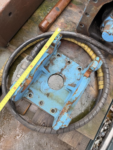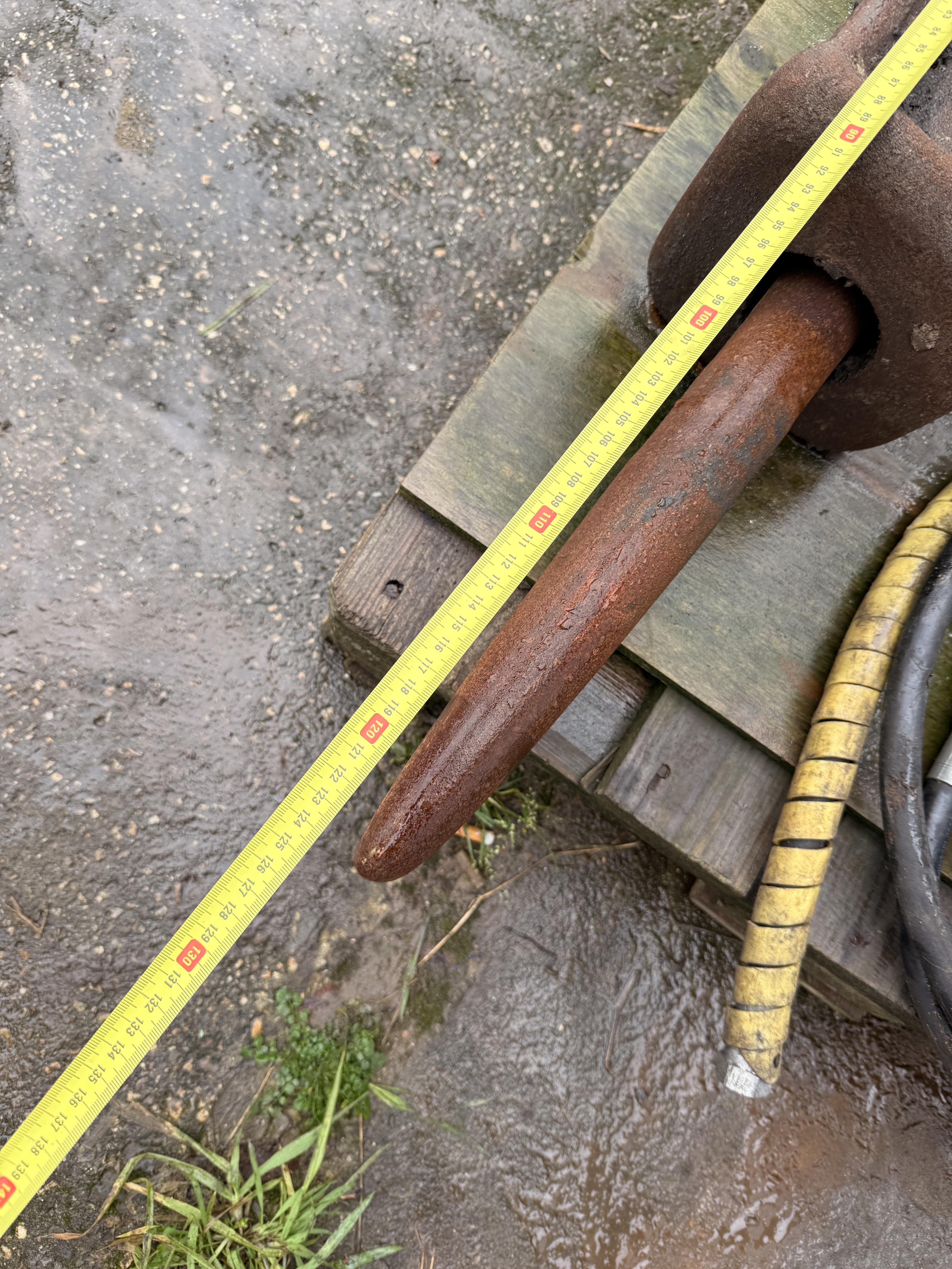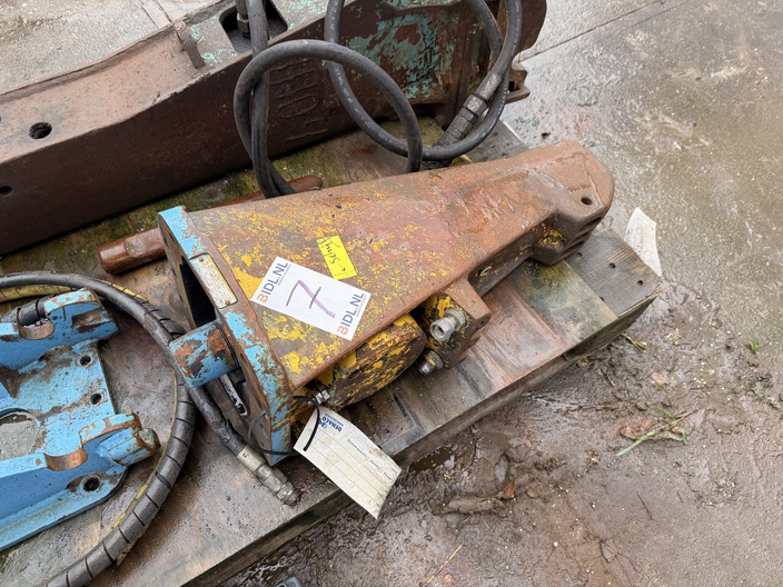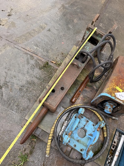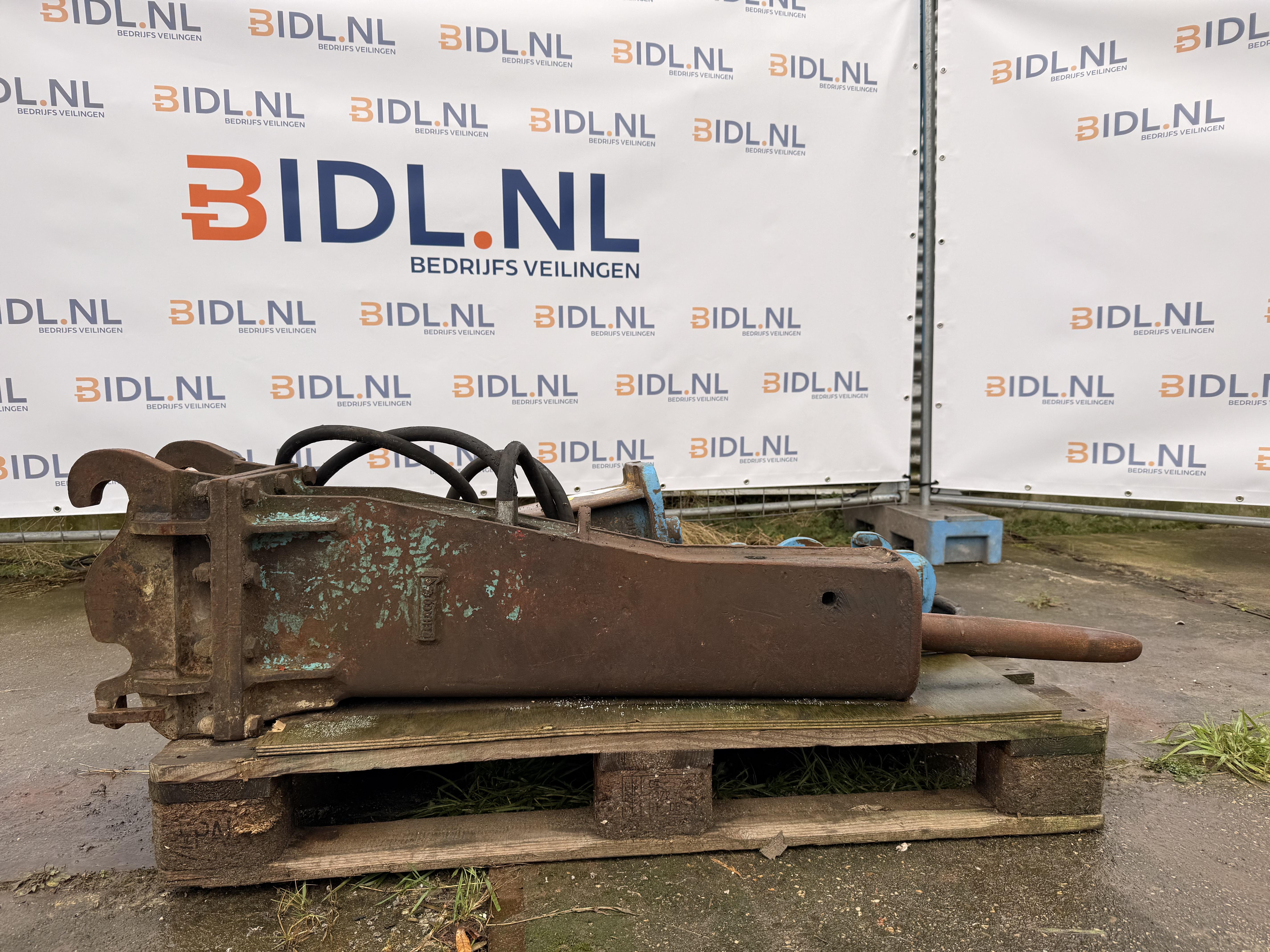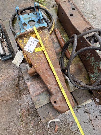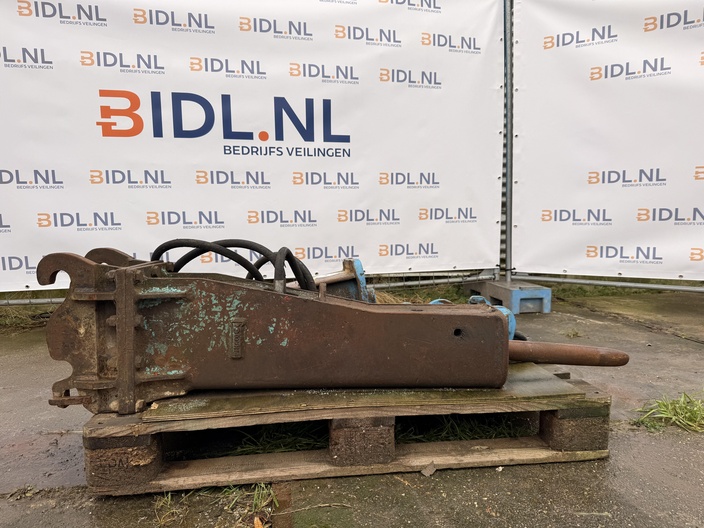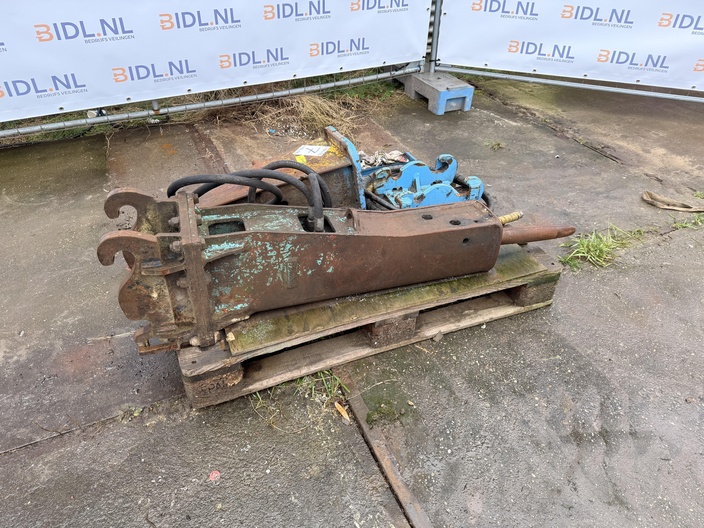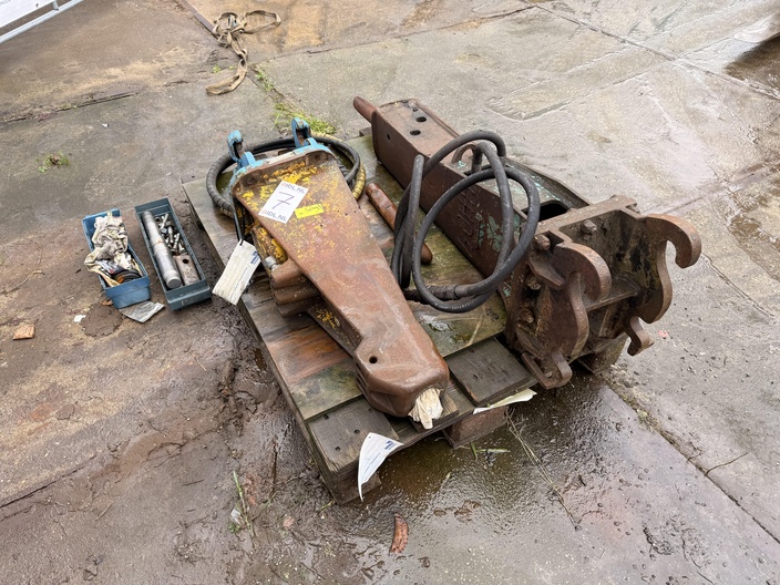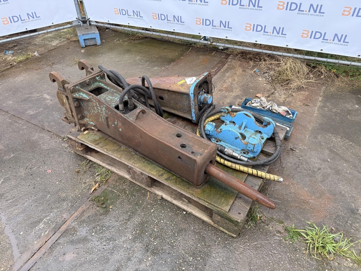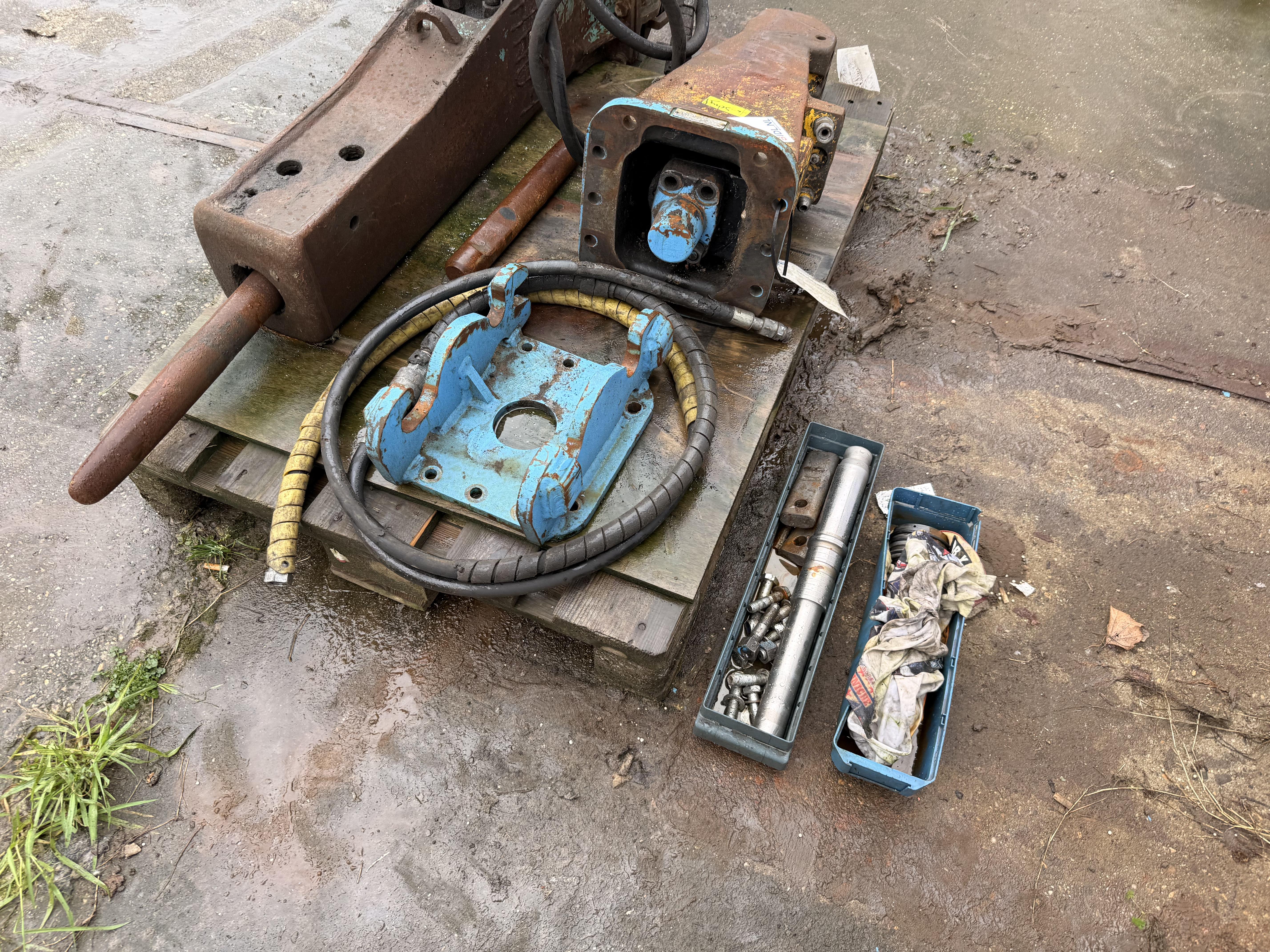 Hydraulische sloophamer / breekhamer geschikt voor montage aan een graafmachine. De set bestaat uit een hydraulische hamerunit met bevestigingsbeugel, hydrauliekslangen en meerdere losse onderdelen. Bij de hamer zijn verschillende beitels/punten aanwezig, evenals aanvullende montage- en bevestigingsdelen, zichtbaar los bijgelegd op de pallet. De breekhamer is uitgevoerd in staal en voorzien van hydraulische aansluitingen. Bevestigingsplaat en koppelingen zijn aanwezig; type snelwissel of exacte machinecompatibiliteit is niet vastgesteld. De set wordt geleverd zoals afgebeeld, inclusief losse onderdelen en accessoires die op de foto’s zichtbaar zijn. De breekhamer verkeert in gebruikte staat. Er is duidelijke roestvorming, lakschade en slijtage zichtbaar op de hamer, beitels, slangen en bevestigingspunten. De werking is niet getest. De set staat opgesteld op een houten pallet en wordt aangeboden in de staat zoals afgebeeld.