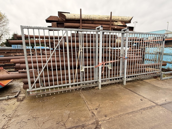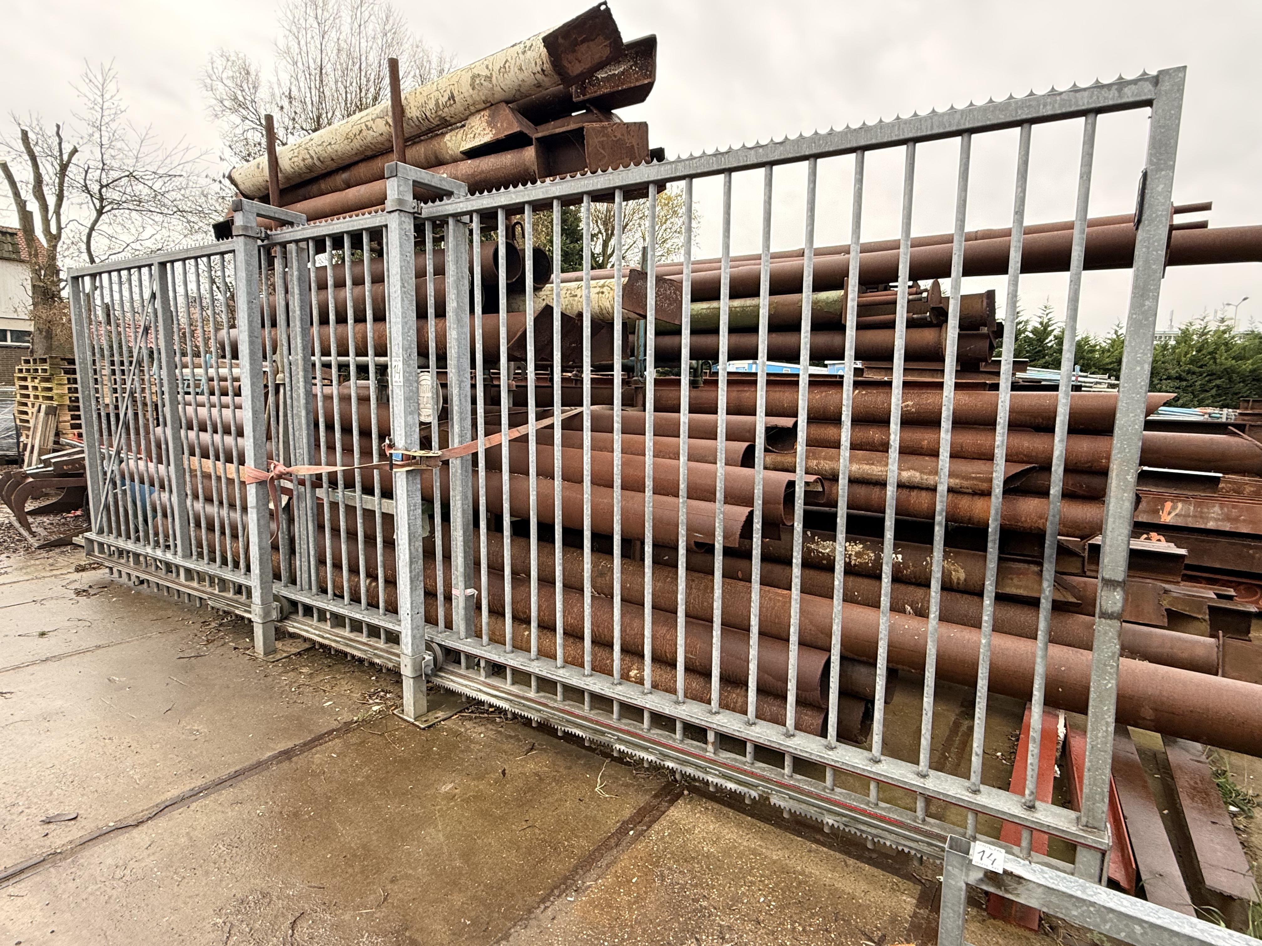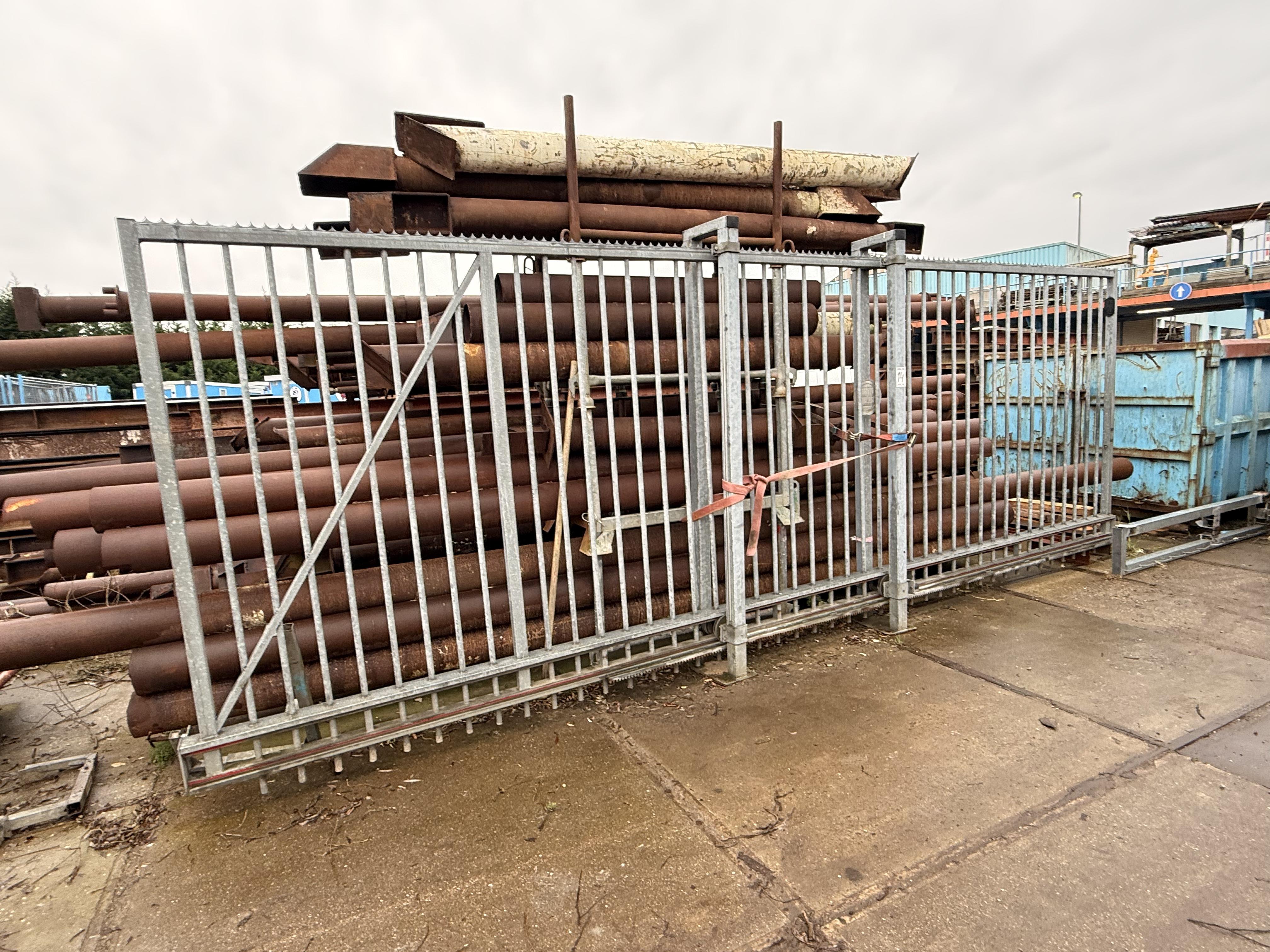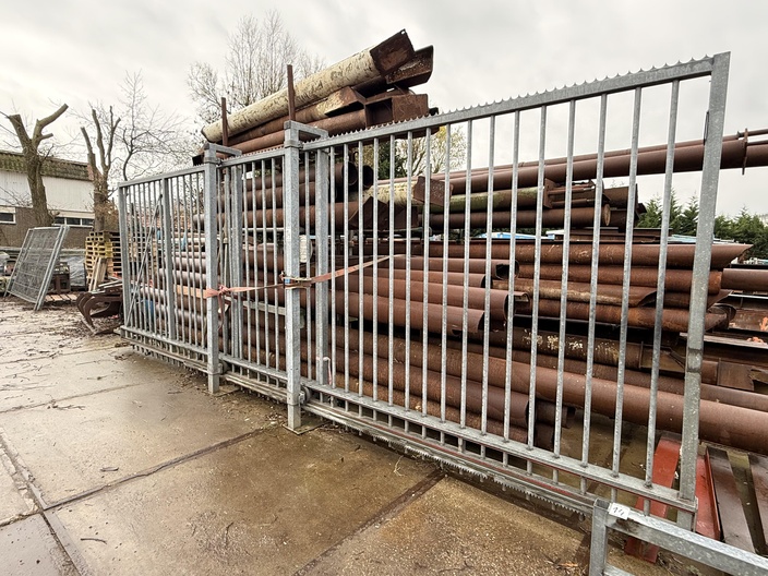 Industrieel stalen schuifhek, uitgevoerd in verzinkt staal met verticale spijlen en rechthoekig frame. Het hek is zichtbaar voorzien van een schuifmechanisme, waaronder loopwielen en een getande tandheugel (rack) aan de onderzijde. Een sluitcilinder is aanwezig in één van de staanders. Het hek staat los opgesteld op een buitenterrein. De constructie bestaat uit meerdere gekoppelde heksecties die samen één schuifhek vormen. Bevestigingspunten, staanders en geleiderails zijn zichtbaar aanwezig. Er zijn spanbanden gebruikt om delen bij elkaar te houden tijdens opslag. De staat is gebruikt. Zichtbaar zijn: Weersinvloeden en vervuiling Lichte corrosie op niet-verzinkte onderdelen en bevestigingen Slijtage aan wielen, tandheugel en contactvlakken De werking van het schuifsysteem en eventuele aandrijving is niet getest. Er is geen motor of besturingskast zichtbaar op basis van de foto’s. De kavel bestaat uit het hekwerk en zichtbare mechanische onderdelen zoals afgebeeld.
