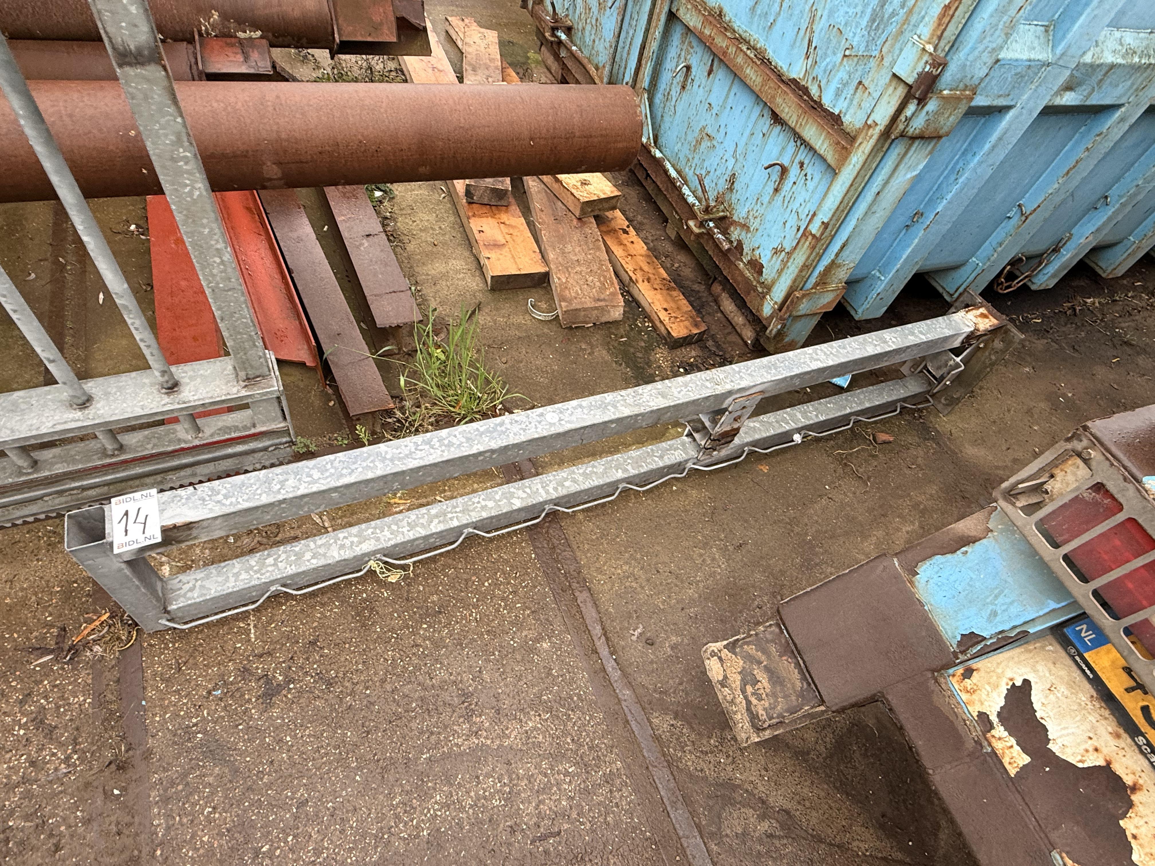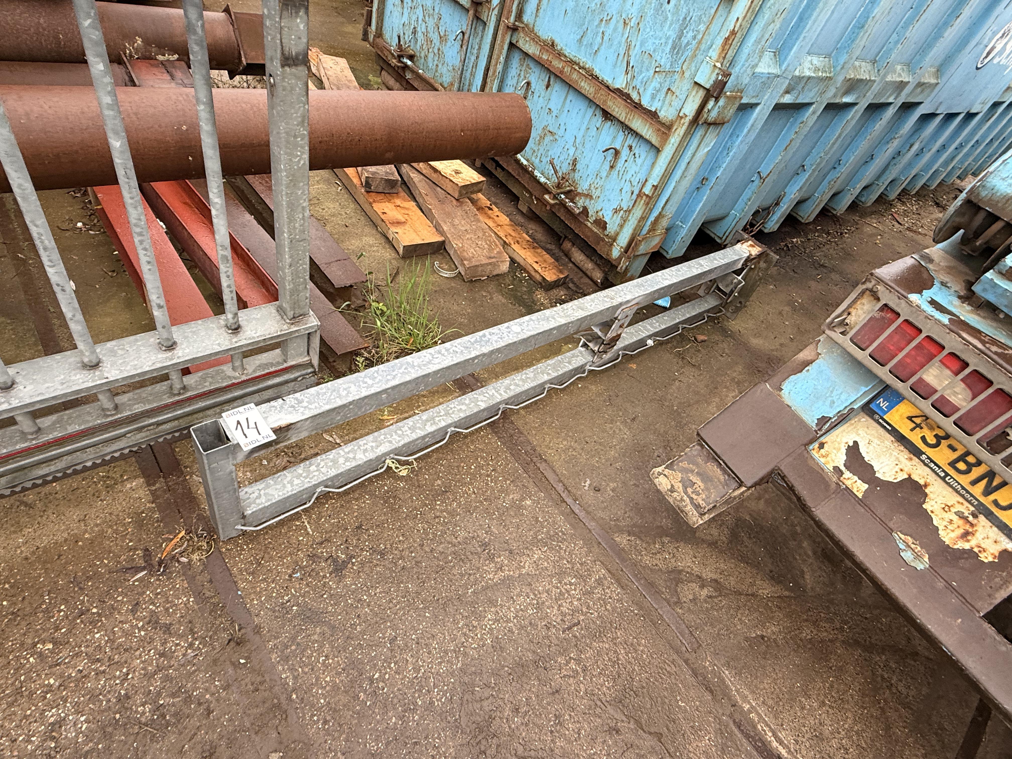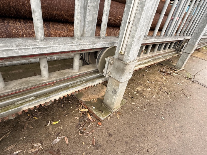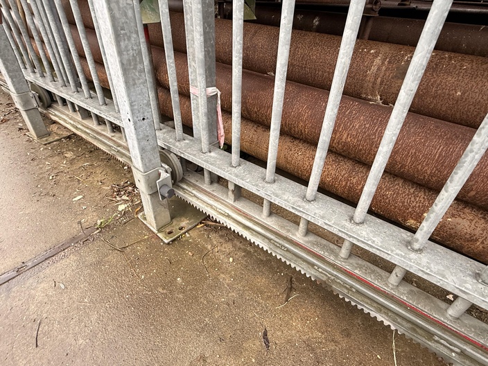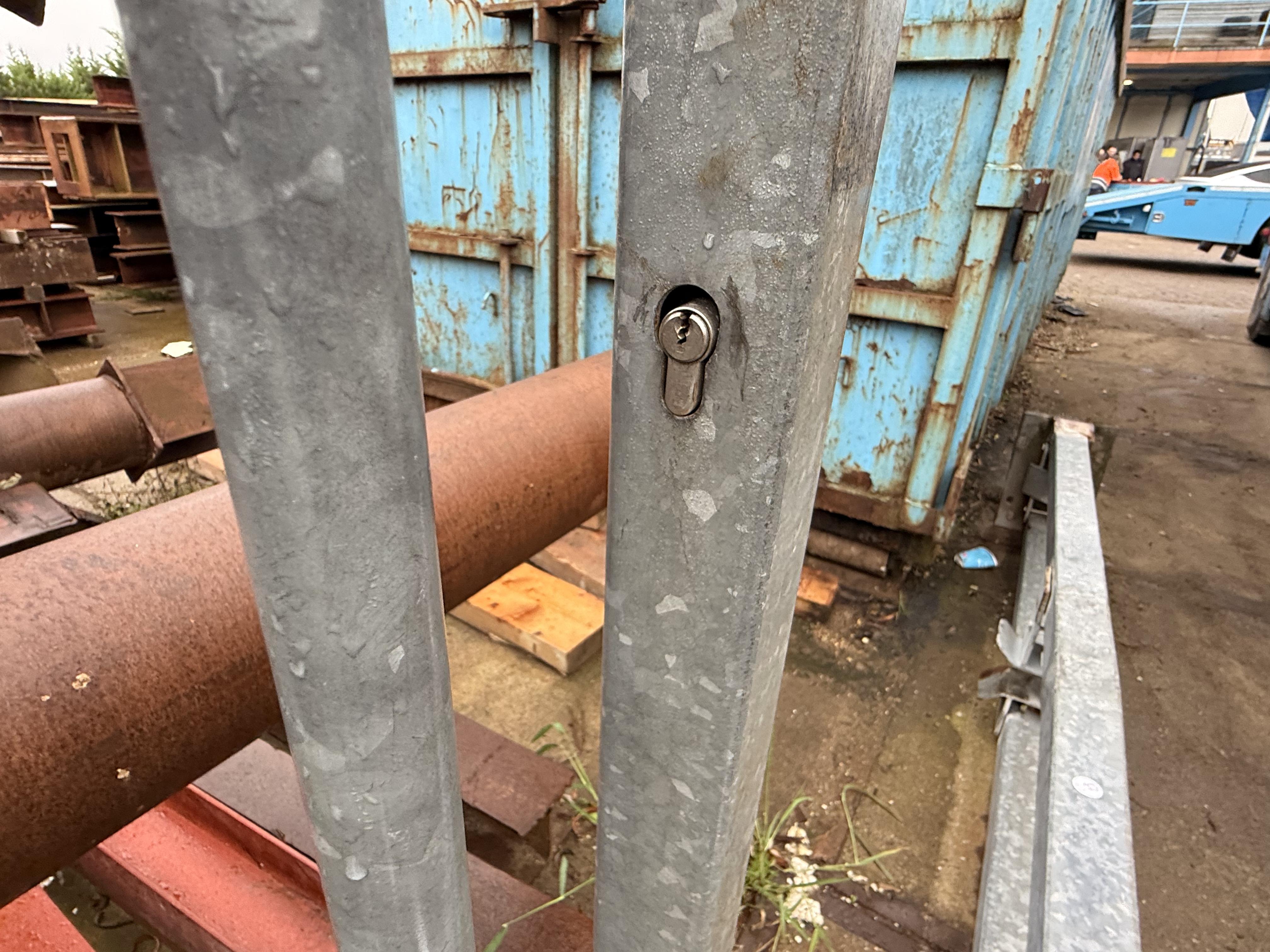 Industrieel stalen schuifhek, uitgevoerd in verzinkt staal met verticale spijlen en rechthoekig frame. Het hek is zichtbaar voorzien van een schuifmechanisme, waaronder loopwielen en een getande tandheugel (rack) aan de onderzijde. Een sluitcilinder is aanwezig in één van de staanders. Het hek staat los opgesteld op een buitenterrein. De constructie bestaat uit meerdere gekoppelde heksecties die samen één schuifhek vormen. Bevestigingspunten, staanders en geleiderails zijn zichtbaar aanwezig. Er zijn spanbanden gebruikt om delen bij elkaar te houden tijdens opslag. De staat is gebruikt. Zichtbaar zijn: Weersinvloeden en vervuiling Lichte corrosie op niet-verzinkte onderdelen en bevestigingen Slijtage aan wielen, tandheugel en contactvlakken De werking van het schuifsysteem en eventuele aandrijving is niet getest. Er is geen motor of besturingskast zichtbaar op basis van de foto’s. De kavel bestaat uit het hekwerk en zichtbare mechanische onderdelen zoals afgebeeld.