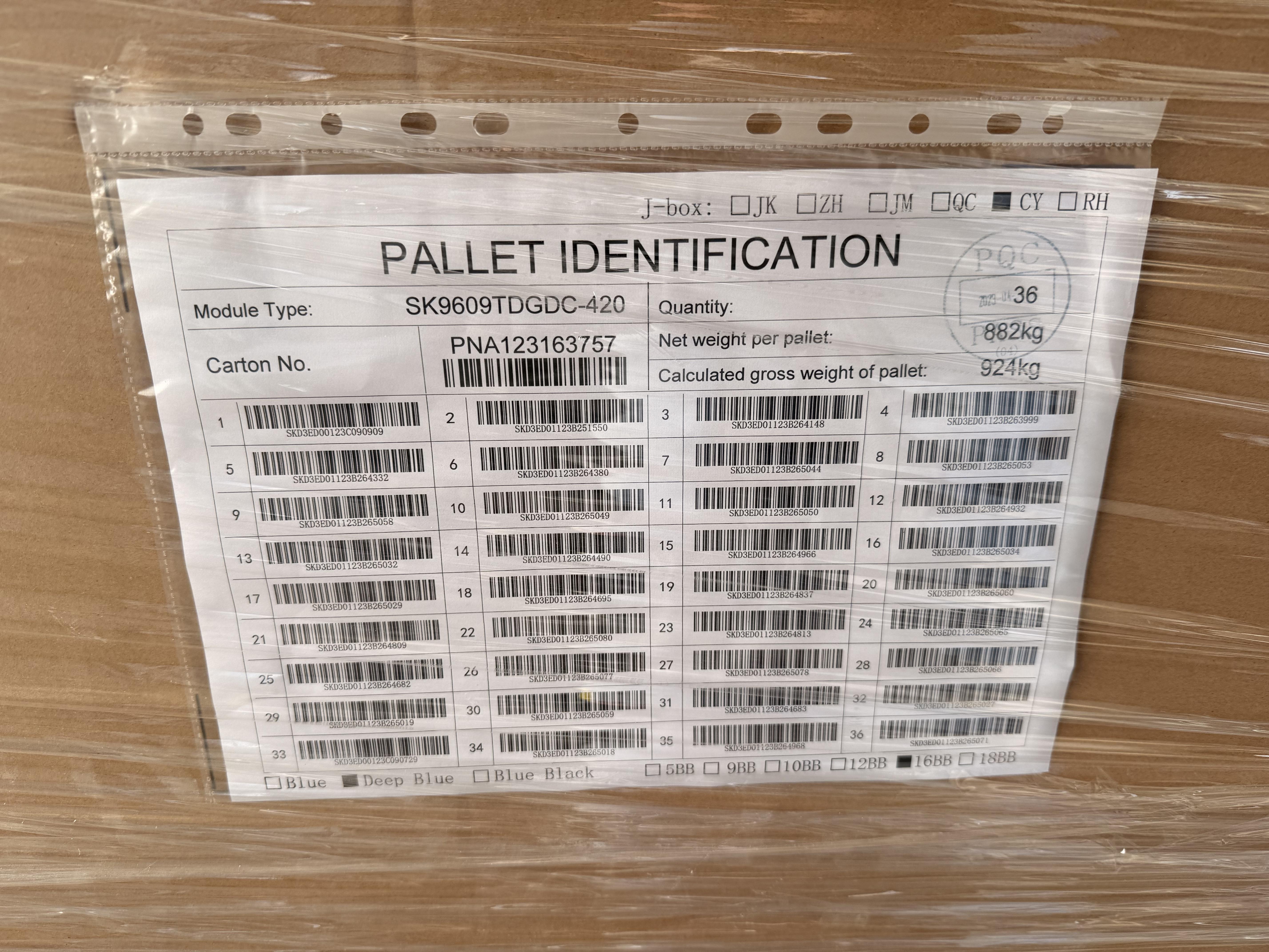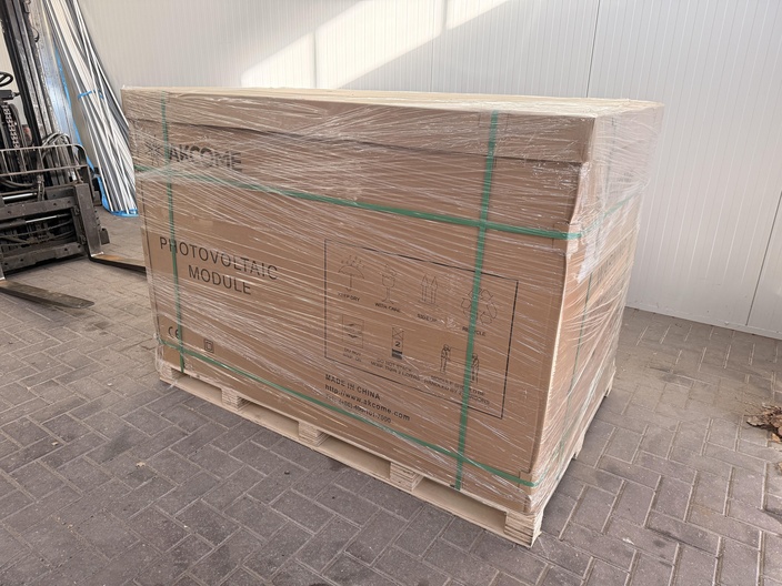 Pallet met AKCOME photovoltaic modules, fabrieksmatig verpakt en geseald op pallet. Op de verpakking is een pallet identification label zichtbaar met productspecificaties. De pallet bevat 36 zonnepanelen. De pallet is omwikkeld met folie en omsnoerd met kunststof banden. Dozen zijn ongeopend en gestapeld op houten pallet. Geen zichtbare transportschade aan de buitenzijde van de palletverpakking. Op dit kavel is een reserveprijs van toepassing.