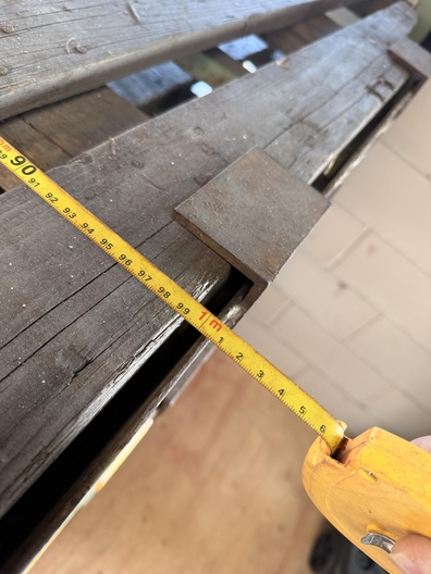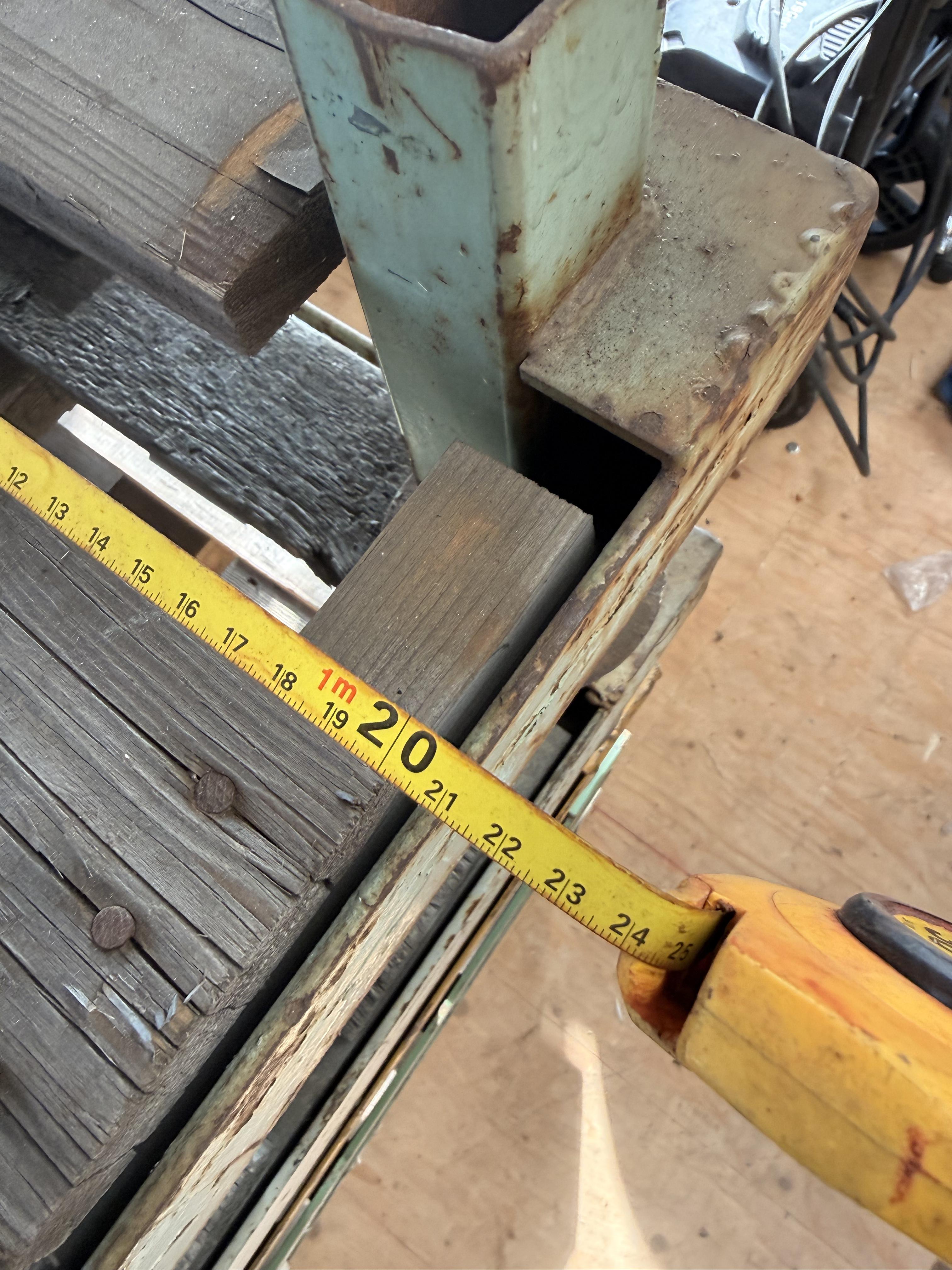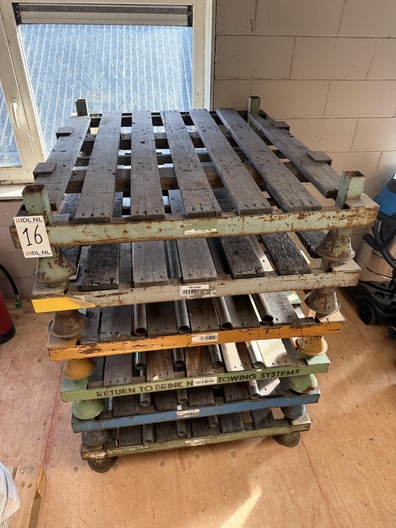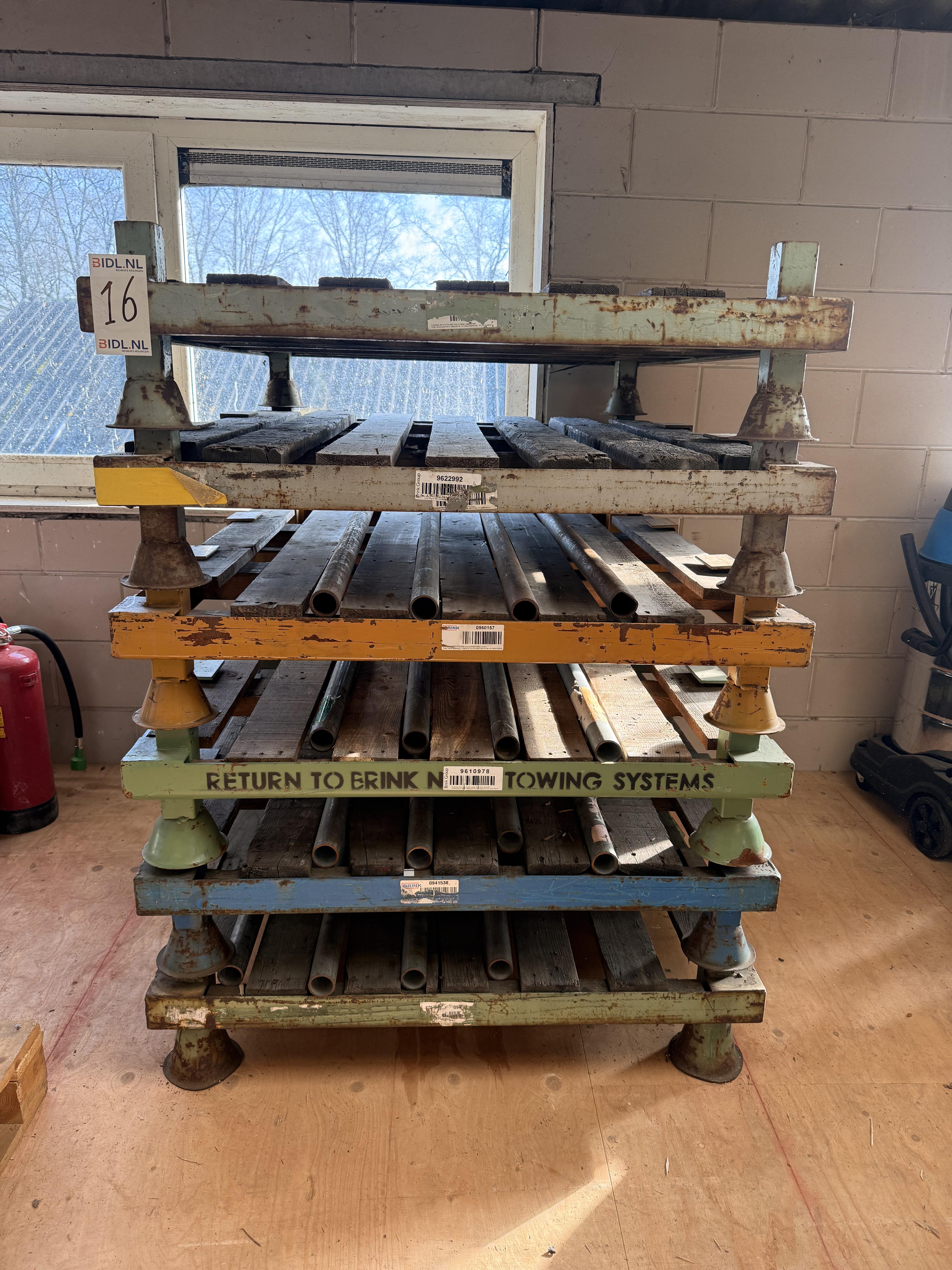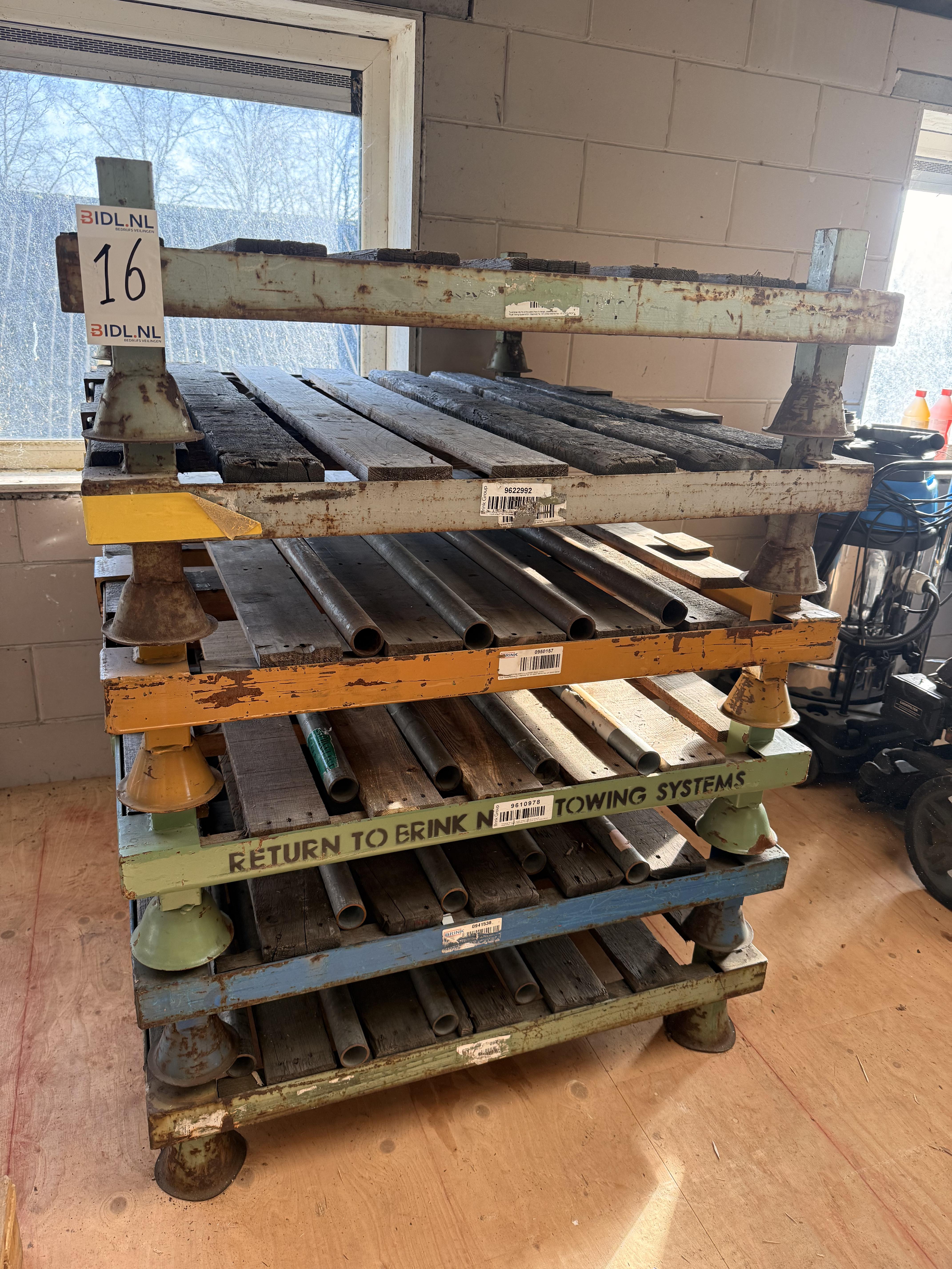 Partij robuuste industriële opslag- en stapelrekken, opgebouwd uit stalen frames met houten liggers. De rekken zijn gestapeld in meerdere niveaus en voorzien van metalen afstands- en positioneerconussen op de hoeken, geschikt voor veilig stapelen. De constructie toont duidelijke gebruikssporen zoals roestvorming, verkleuring en slijtage aan het hout, passend bij intensief industrieel gebruik. Op enkele liggers en frames zijn stickers en opschriften zichtbaar.