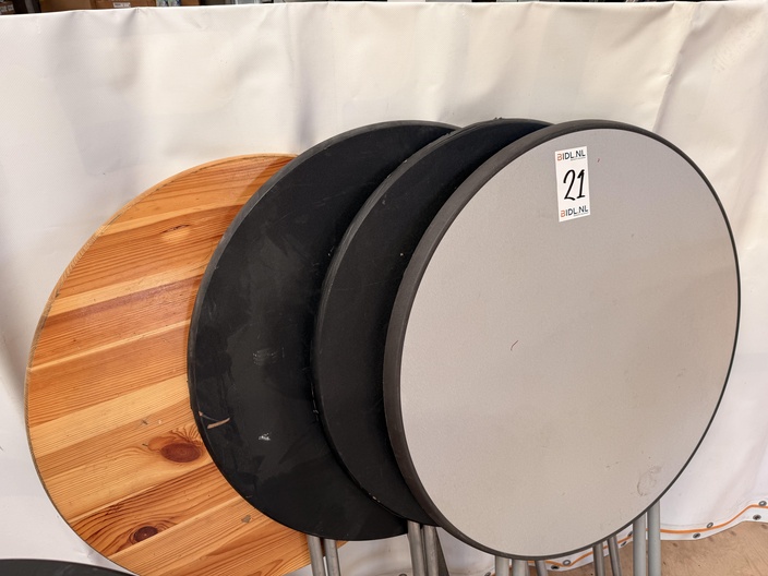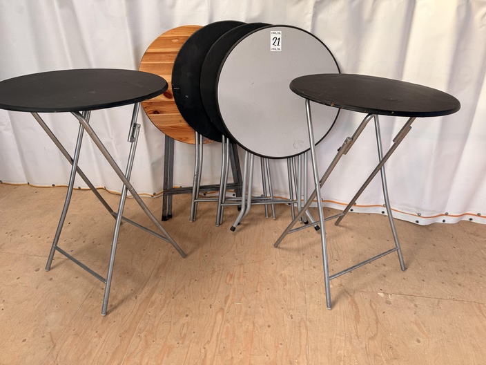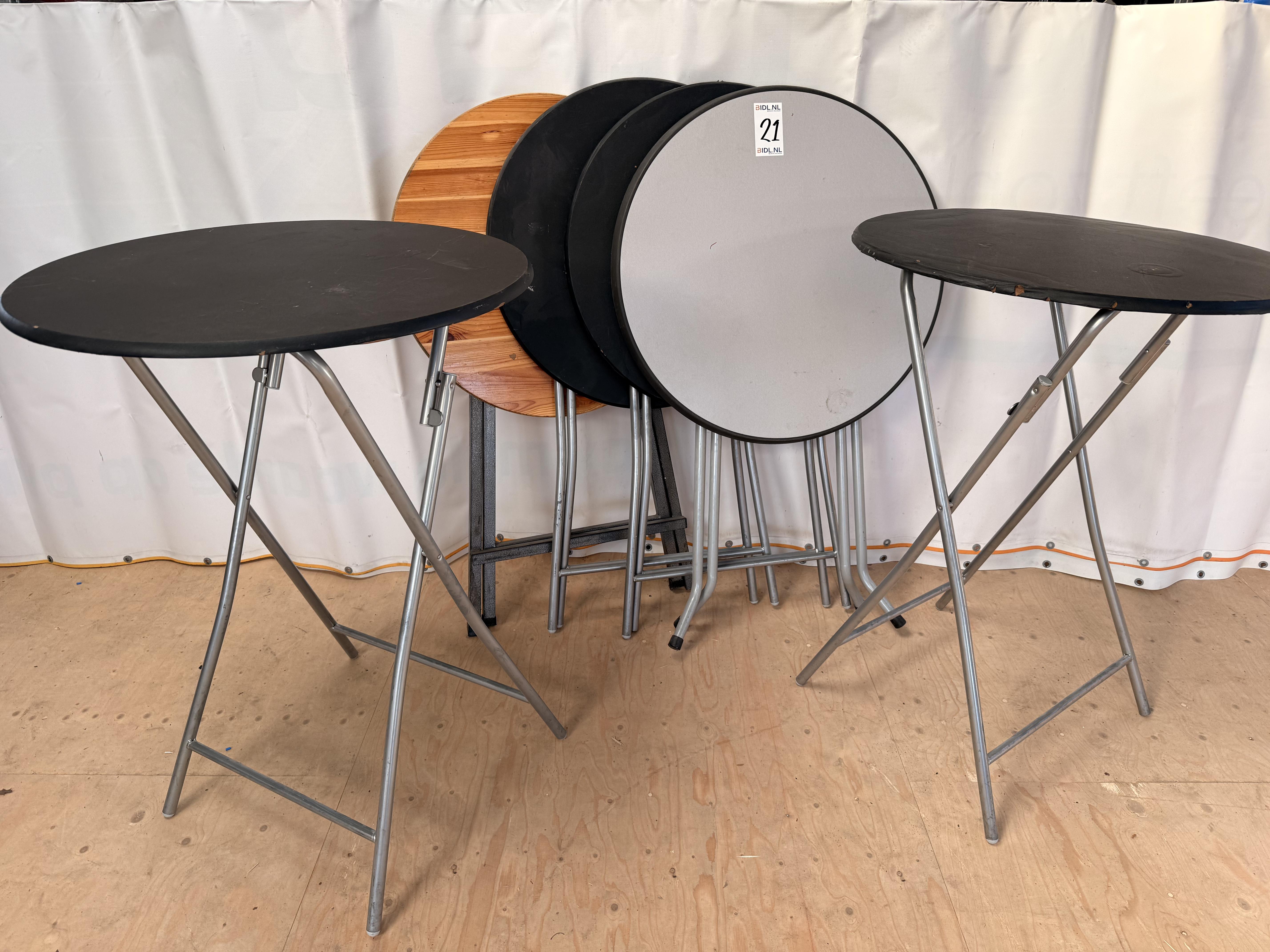 Partij ronde tafels bestaande uit meerdere klap- en statafels. De tafels zijn uitgevoerd met metalen inklapbare poten en ronde tafelbladen in verschillende afwerkingen en kleuren, waaronder zwart, lichtgrijs en houtkleur. De tafels zijn stapelbaar en geschikt voor flexibel gebruik bij evenementen, horeca of vergaderruimtes. Er zijn zichtbare gebruikssporen aanwezig zoals krassen, verkleuringen en lichte beschadigingen aan de bladen en poten.