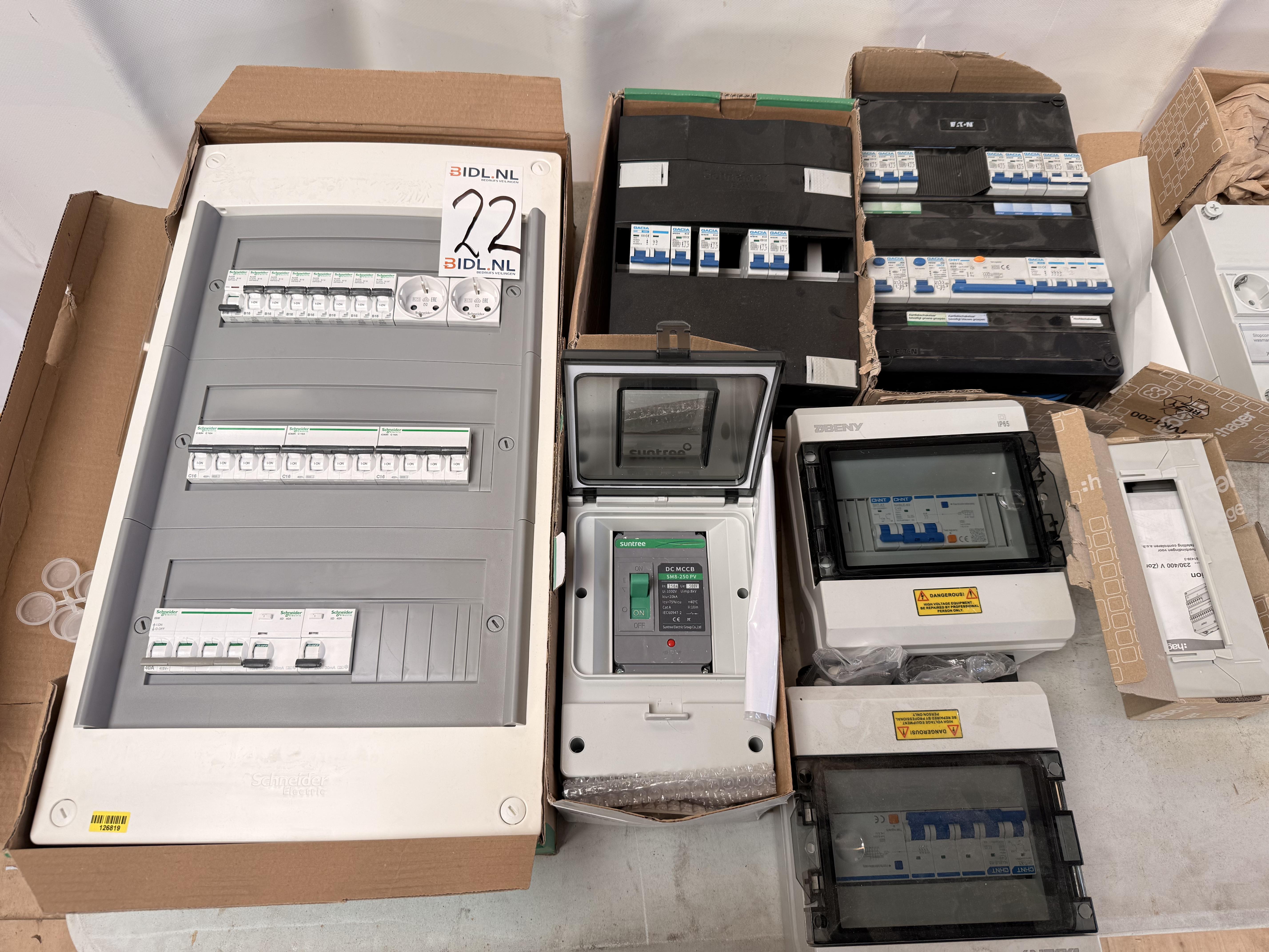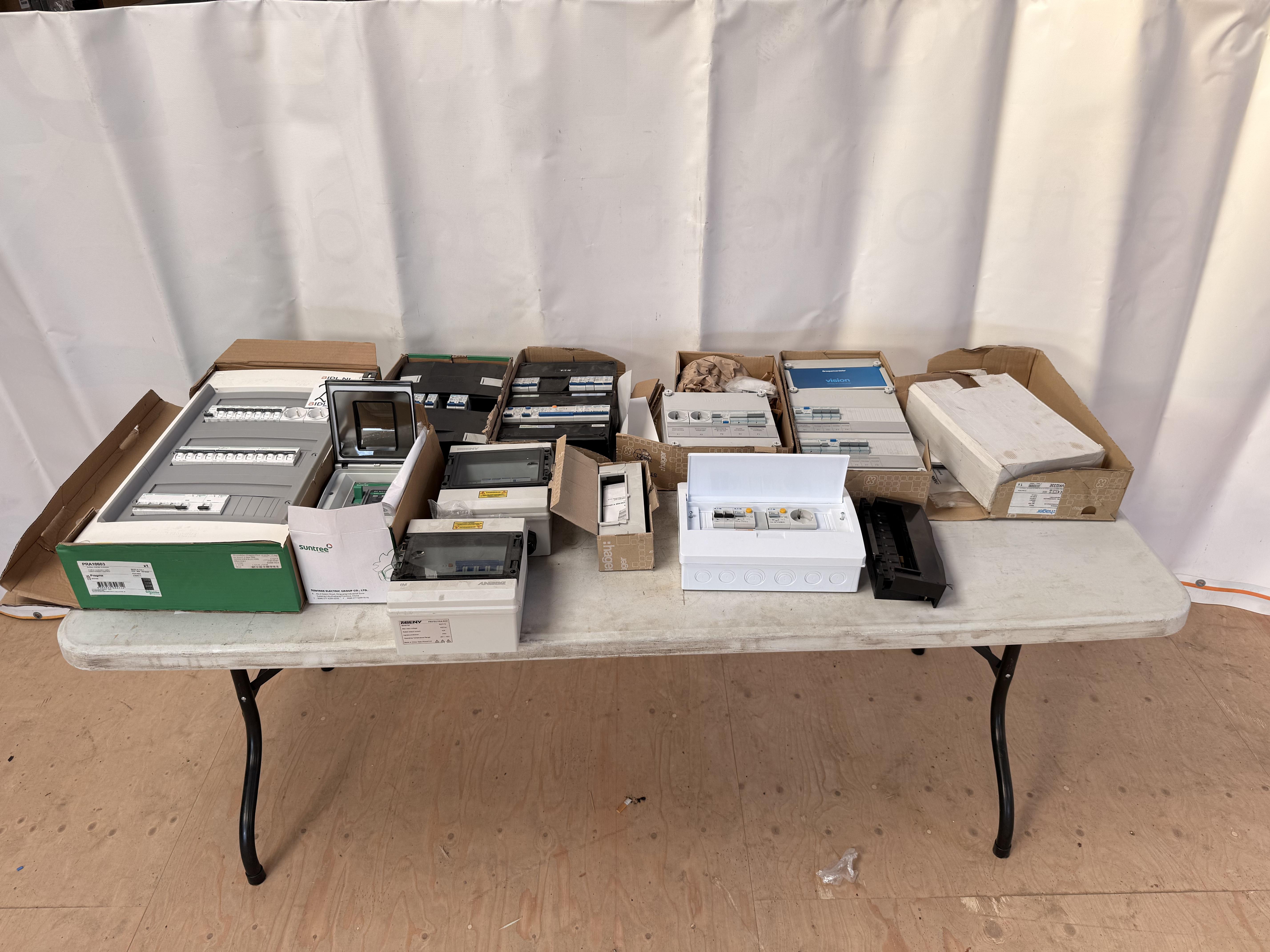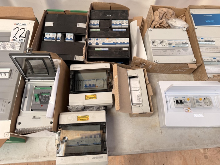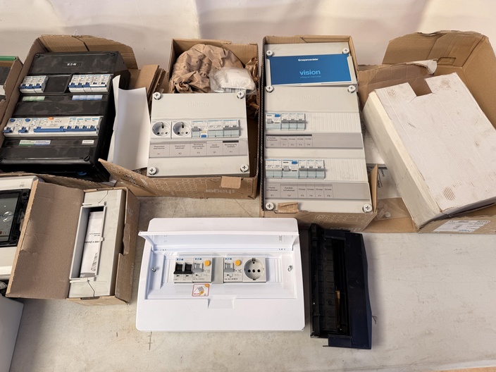Partij bestaande uit meerdere elektrische groepenkasten, onderverdelers en behuizingen in diverse uitvoeringen. Zichtbaar zijn zowel volledig afgemonteerde groepenkasten als losse verdelers en lege behuizingen. De kasten zijn voorzien van installatieautomaten, aardlekschakelaars, stopcontactmodules en transparante afdekkappen. Meerdere exemplaren bevinden zich (deels) in originele dozen. Merken en typen lopen uiteen. Staat van werking en volledigheid per onderdeel niet getest en niet vastgesteld.