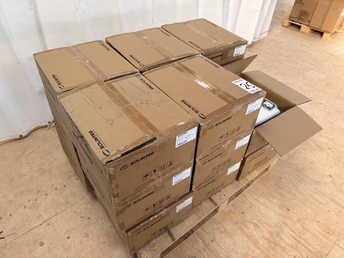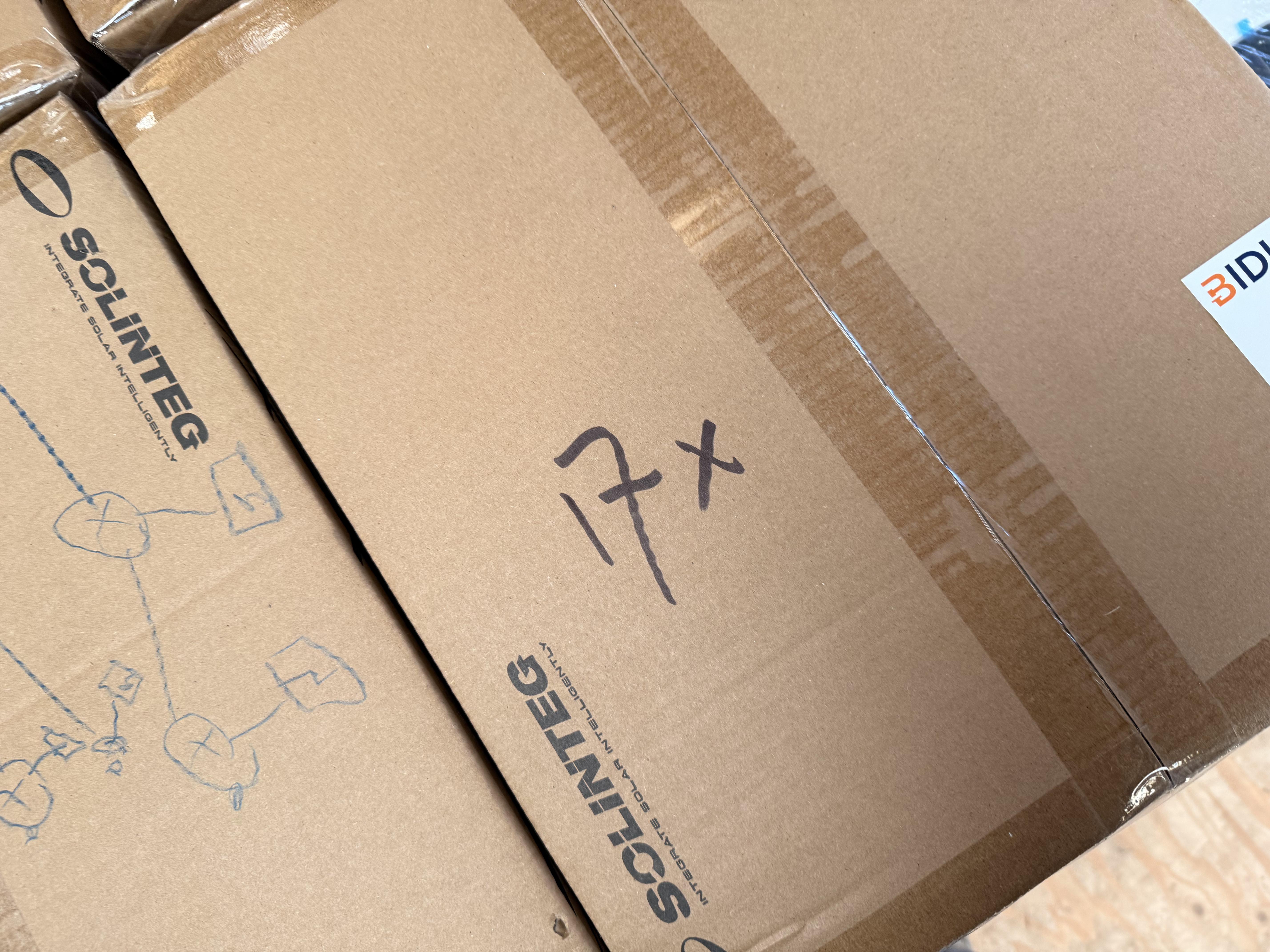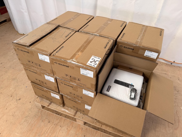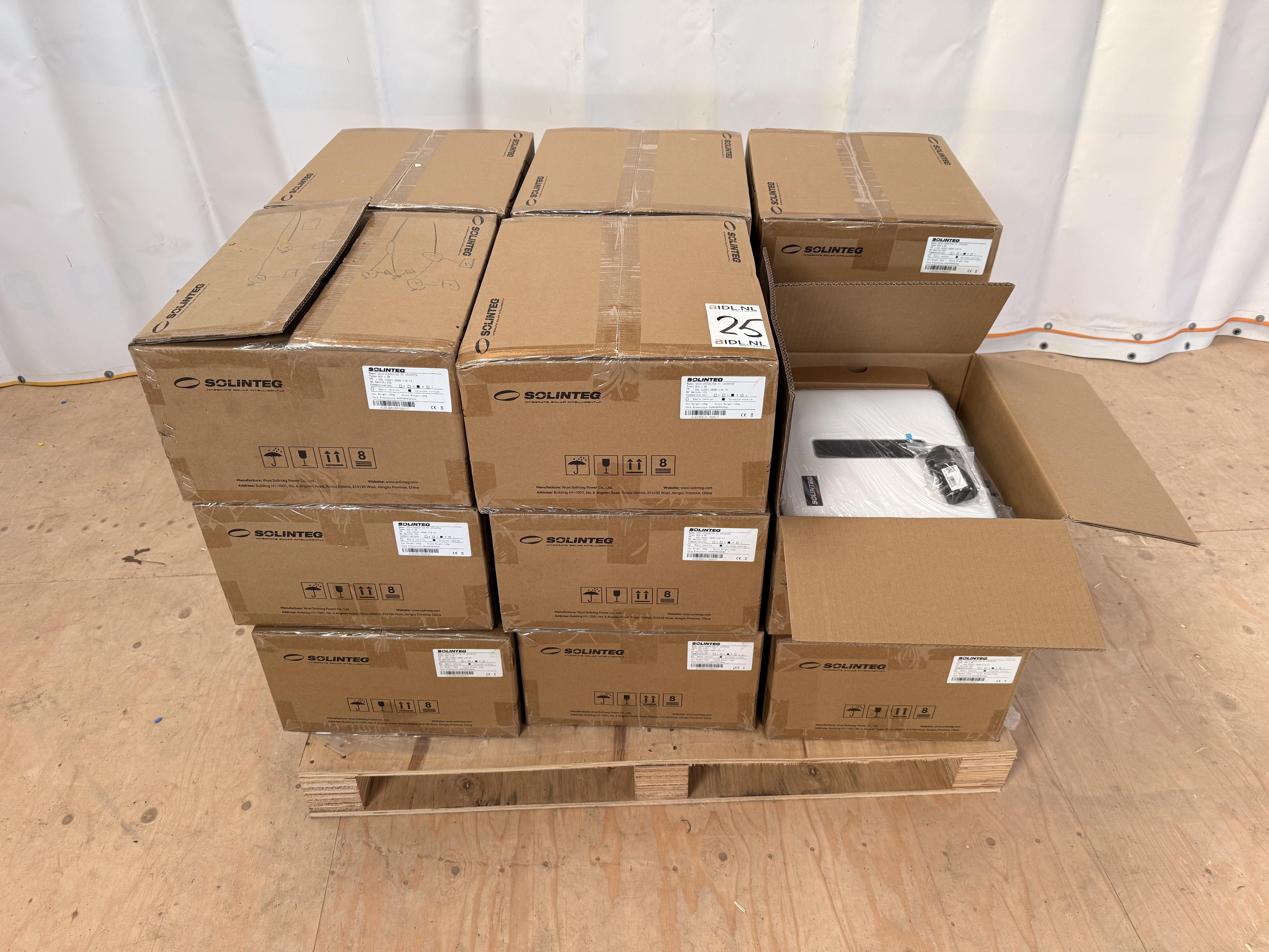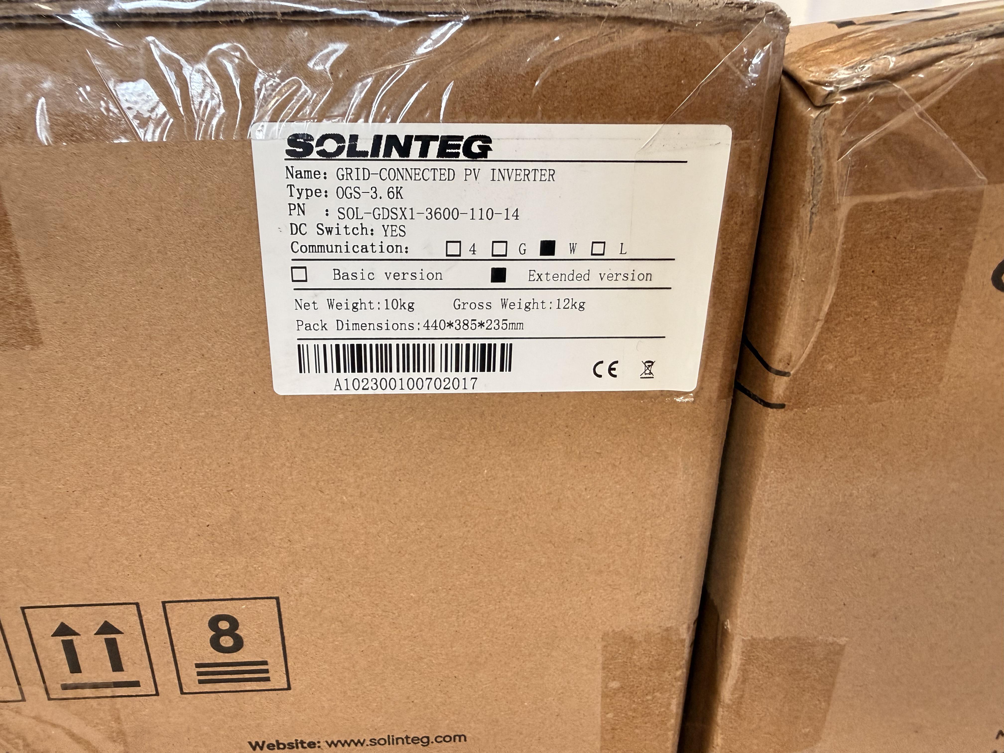 Partij bestaande uit 17 ongeopende kartonnen dozen van het merk Solinteg. Volgens de zichtbare productlabels betreft het grid-connected PV inverters, type OGS-3.6K. De omvormers zijn origineel verpakt en gestapeld op een pallet. Op de verpakking is vermeld dat de omvormers zijn voorzien van een DC-schakelaar en uitgevoerd zijn als extended version. De dozen zijn niet geopend; de inhoud is niet individueel gecontroleerd of getest.