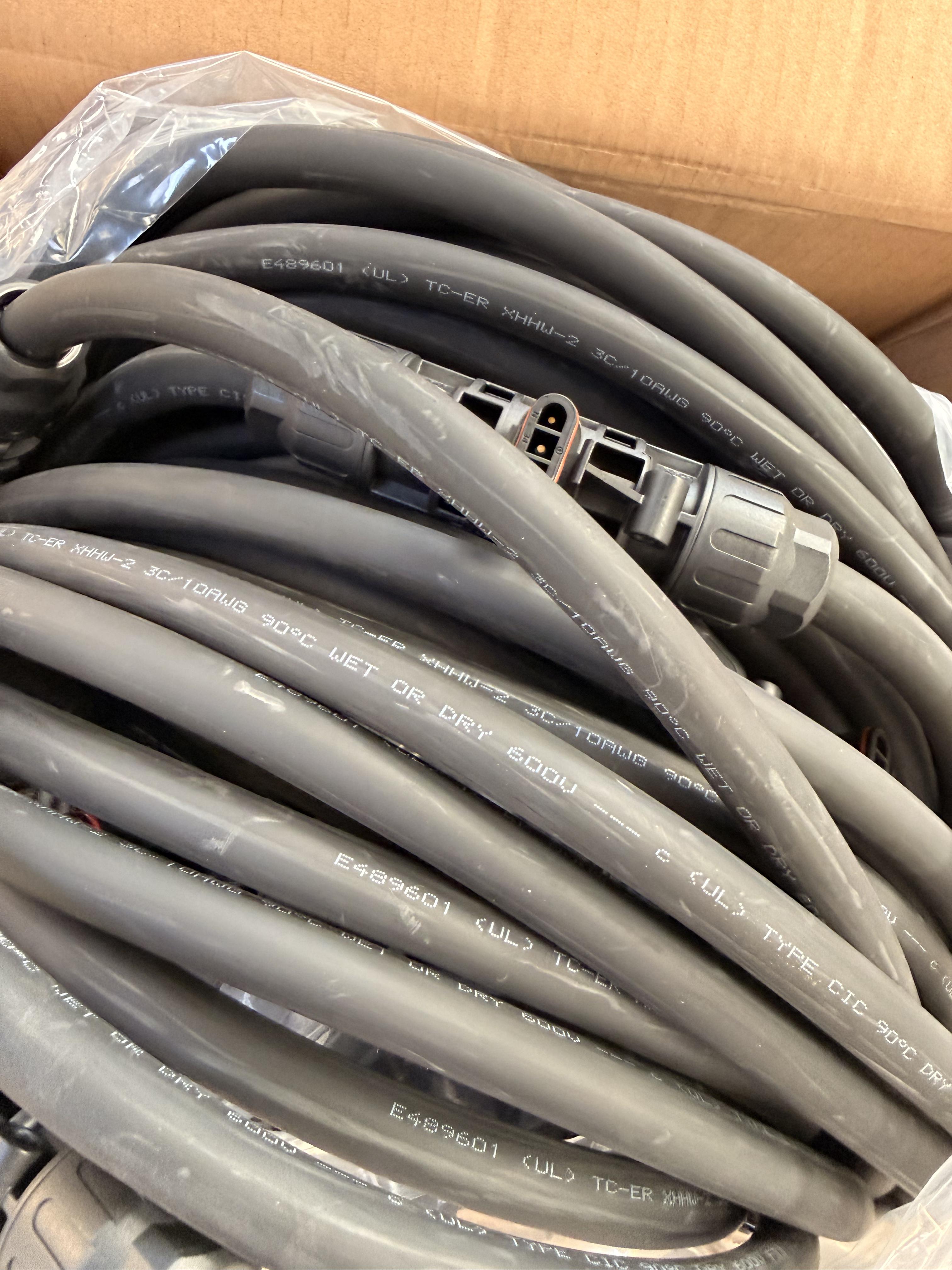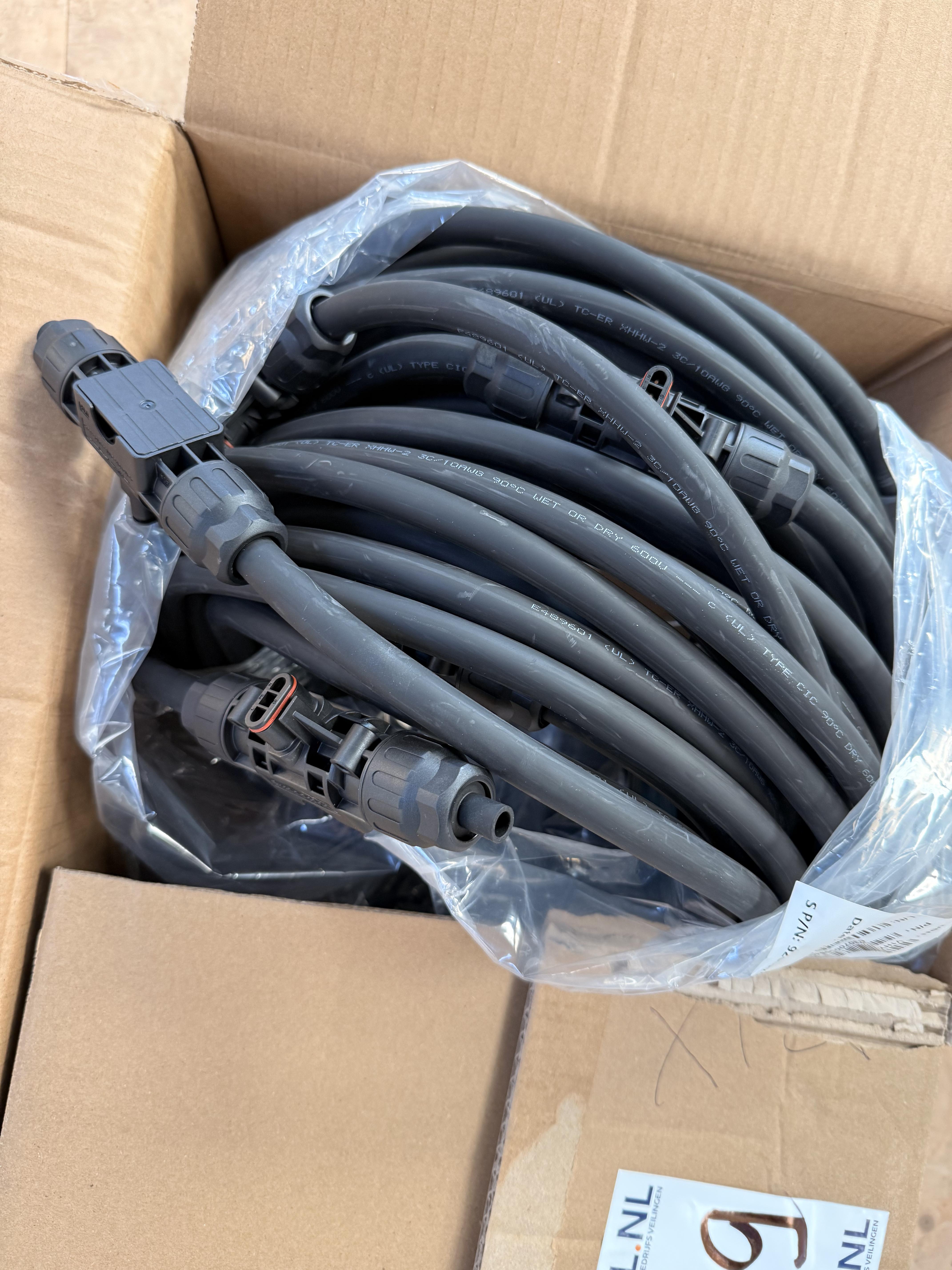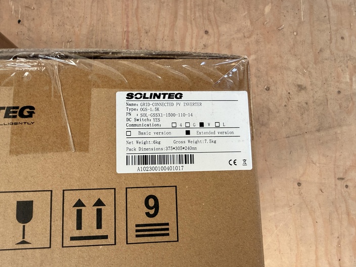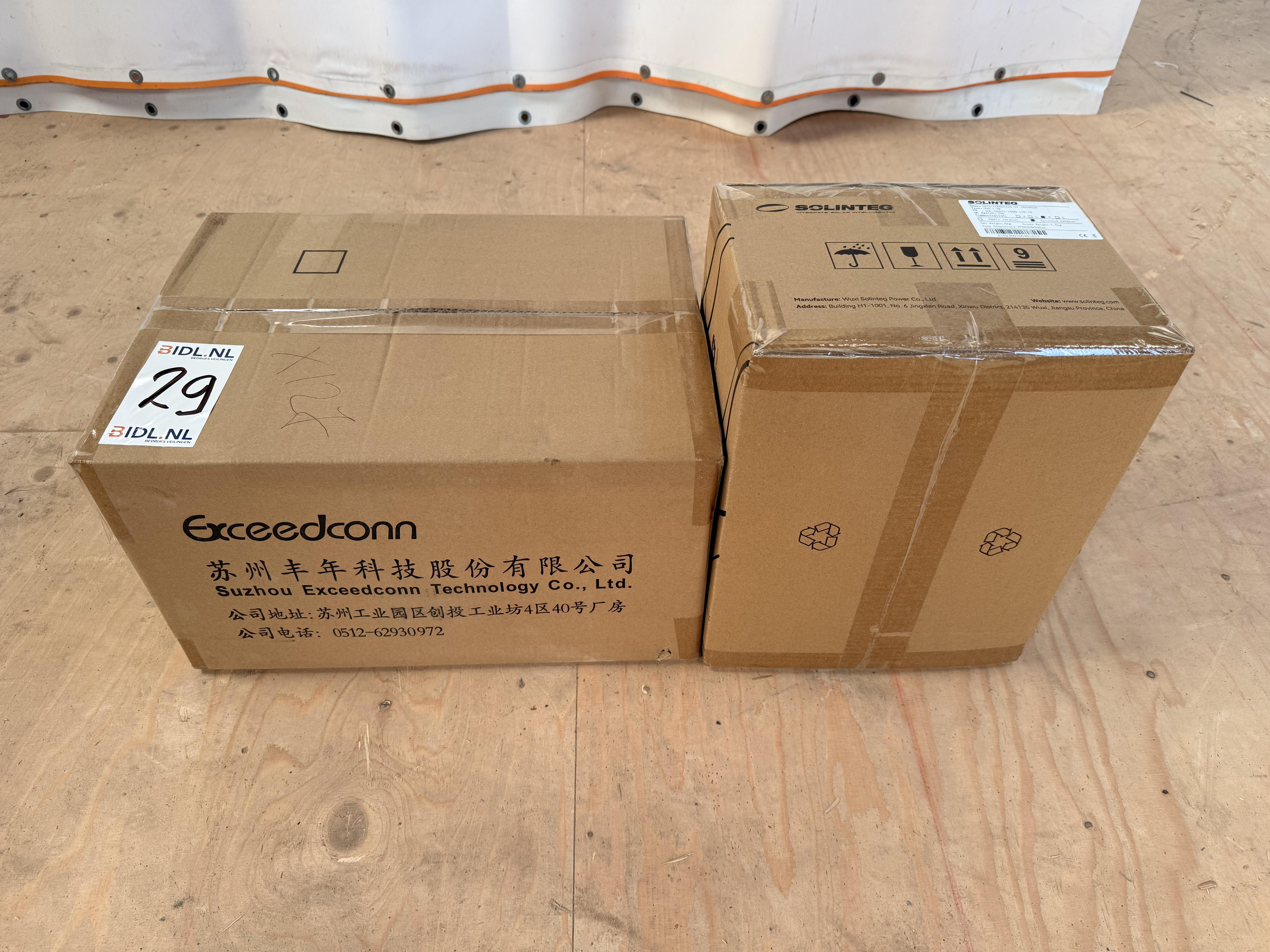 Partij bestaande uit twee kartonnen dozen met zonne-energiecomponenten. Eén doos betreft een Solinteg grid-connected PV inverter, type OGS-1.5K (extended version), origineel verpakt en ongeopend. De andere doos betreft Exceedconn PV-bekabeling/connectoren. Deze doos is geopend en bevat meerdere grijze DC-kabels met gemonteerde connectoren (zichtbaar op foto’s). Staat van werking en volledigheid is niet getest of vastgesteld.