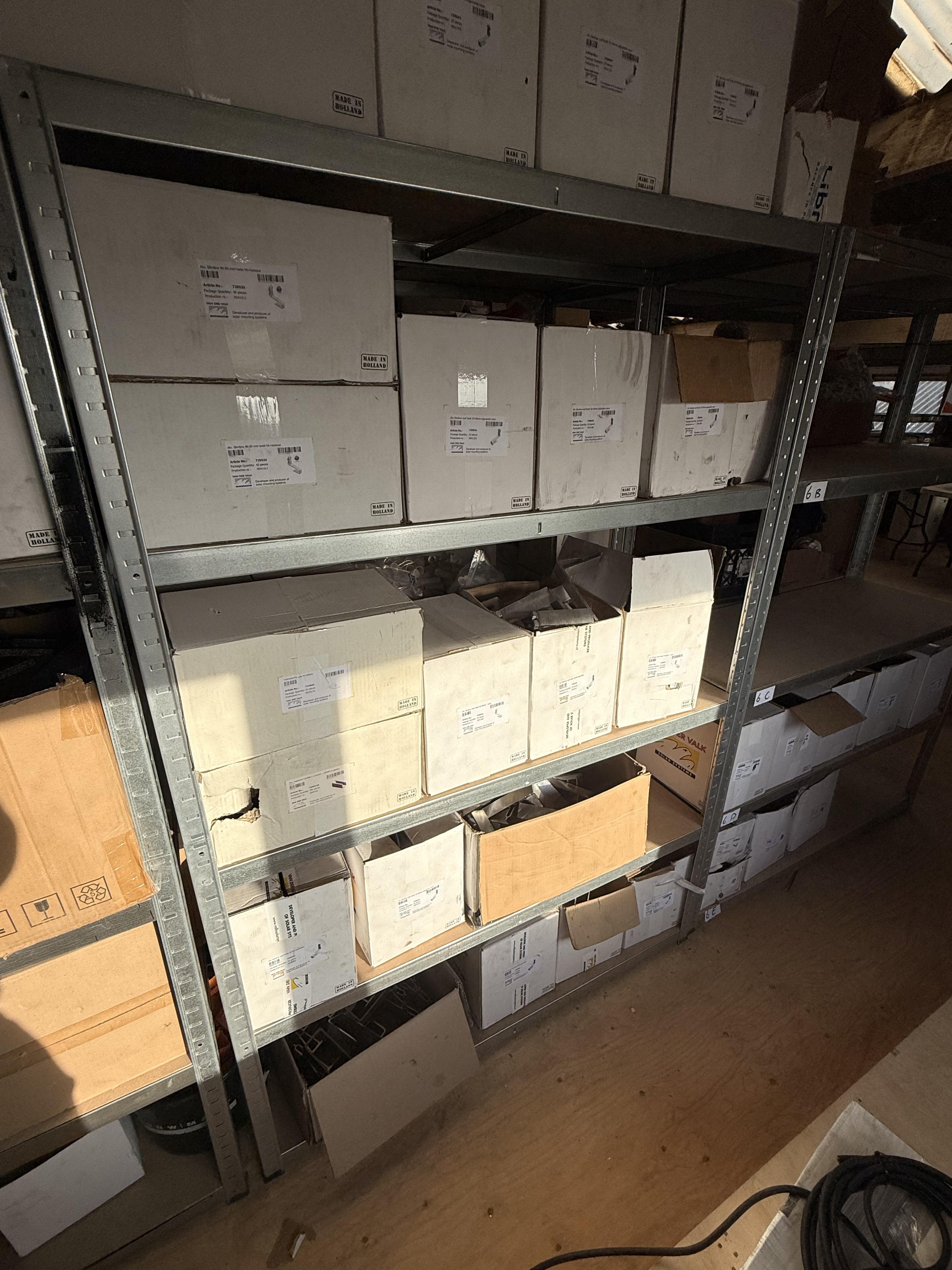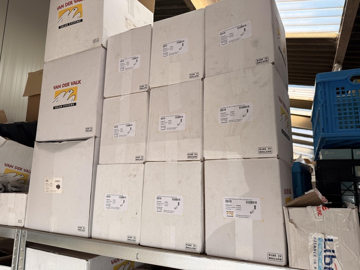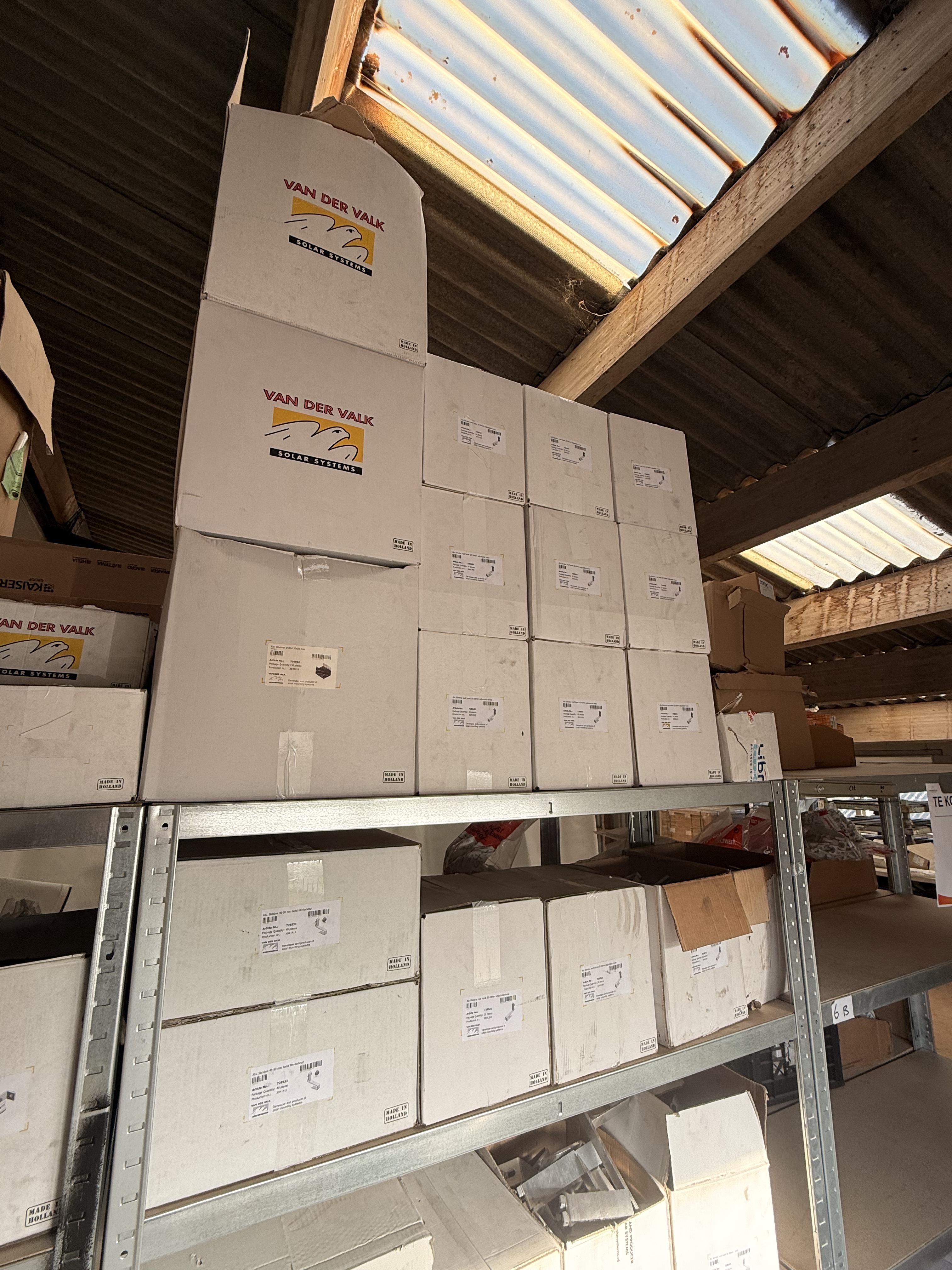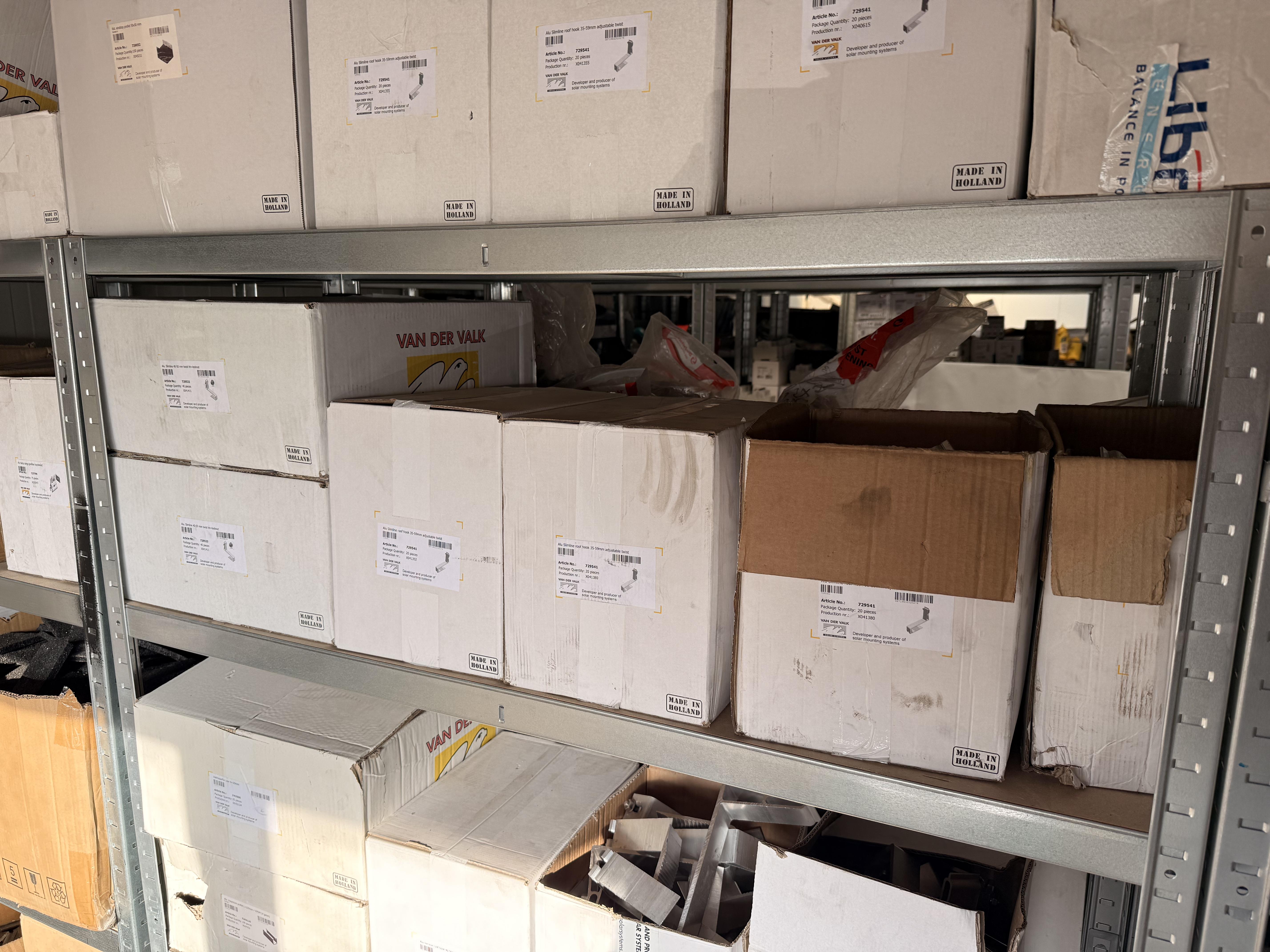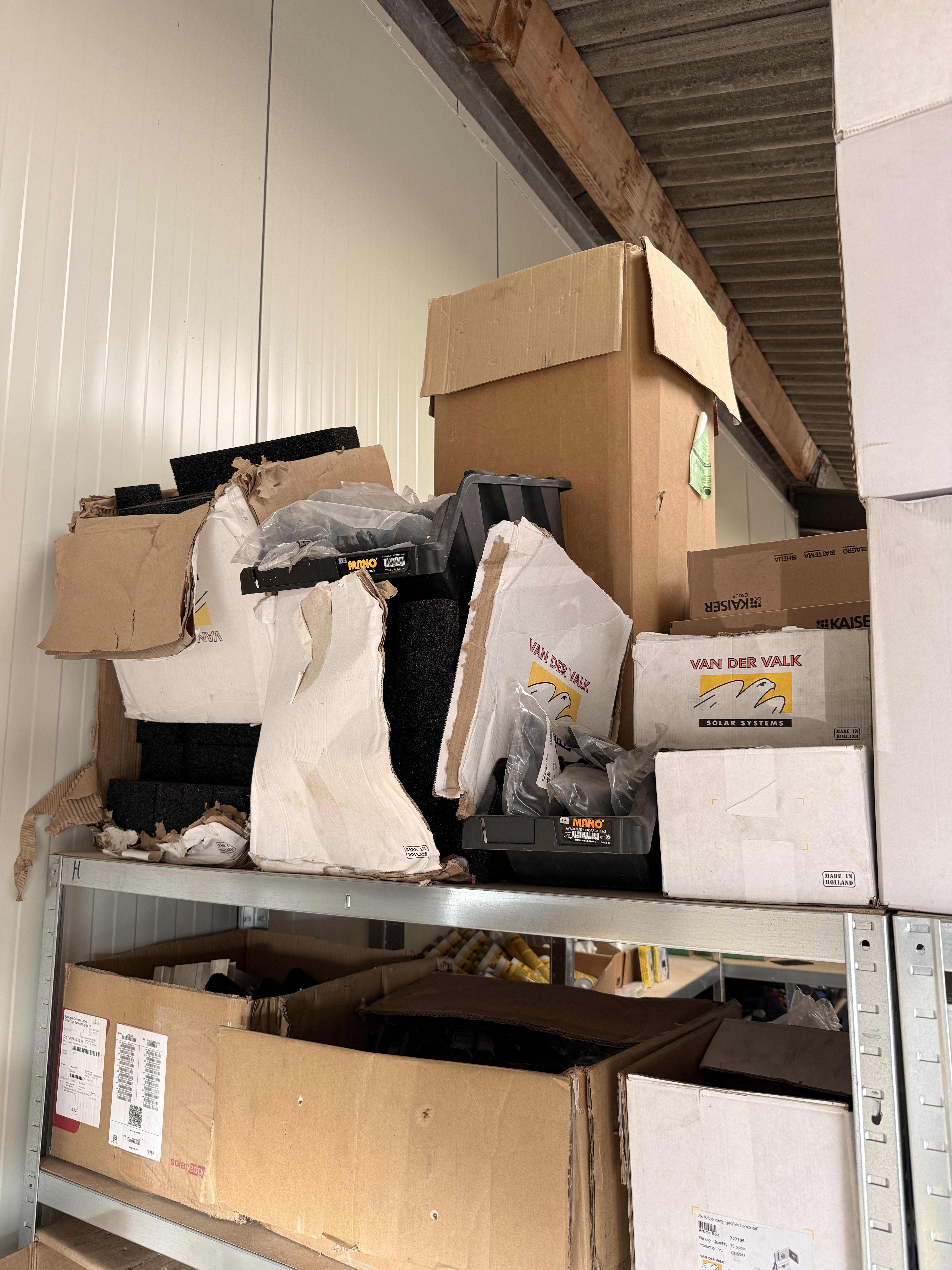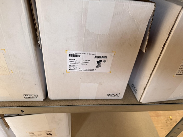 Zeer omvangrijke partij montagemateriaal voor zonnepanelensystemen, grotendeels afkomstig van Van der Valk Solar Systems. De partij bestaat uit meerdere schappen vol kartonnen dozen, zowel gesloten als deels geopende exemplaren. Op de zichtbare labels en dozen zijn diverse aluminium montageonderdelen te herkennen, waaronder mid clamps, eindklemmen, profielonderdelen en bevestigingsmaterialen. De materialen bevinden zich in originele dozen met artikellabels; aantallen per doos verschillen. De partij is niet geïnventariseerd per artikel en wordt aangeboden zoals zichtbaar op de foto’s. Staat en volledigheid zijn niet gecontroleerd.
