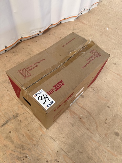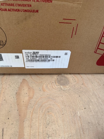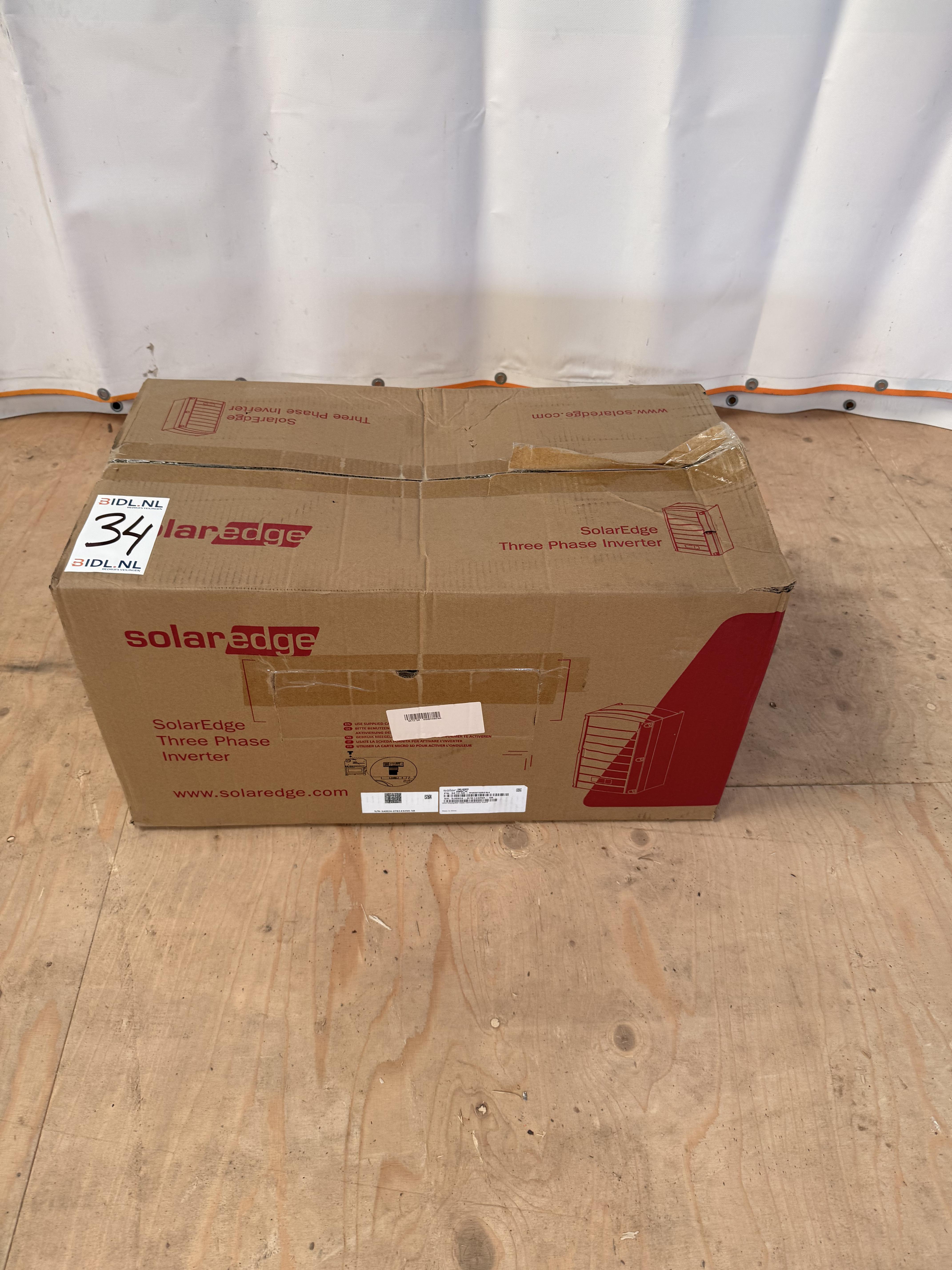 Origineel verpakte SolarEdge driefase PV-omvormer. Op het etiket is het type SE12.5K – RW0T0BEN4 zichtbaar. De doos is gesloten en vertoont lichte opslag- en transportschade aan het karton. Volgens het label is de omvormer uitgevoerd met EnergyNet ready communication board. De inhoud is niet getest en wordt aangeboden zoals zichtbaar op de foto’s.