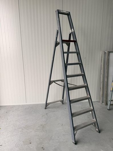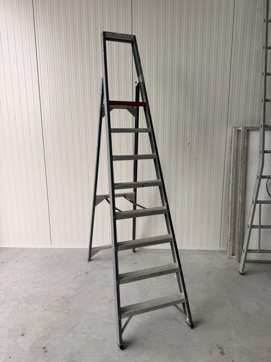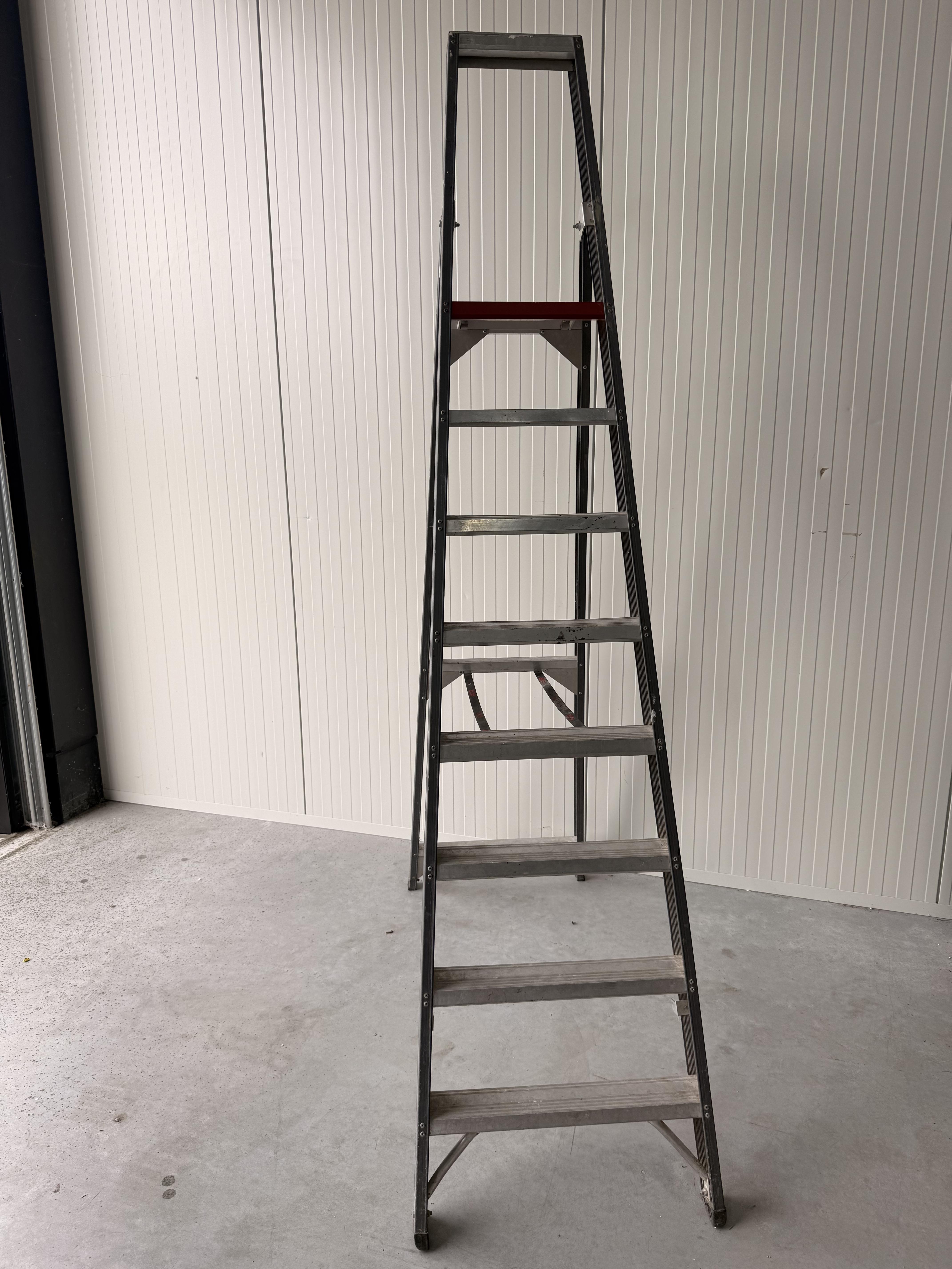 Dubbele aluminium trapladder van het merk Altrex, uitgevoerd met aan één zijde oplopende treden en aan de achterzijde steunconstructie. De ladder is voorzien van een rood werkplatform bovenin en spreidbeveiliging tussen de staanders. Zichtbaar op de foto’s: Aluminium treden Aluminium zijprofielen (donker afgewerkt) Rood bovenplatform Spreidband tussen voor- en achterzijde Antislipvoeten onderaan Fabrikantsticker met Altrex-logo en veiligheidsinstructies Visuele staat: gebruikt, met lichte gebruikssporen op treden en stijlen.