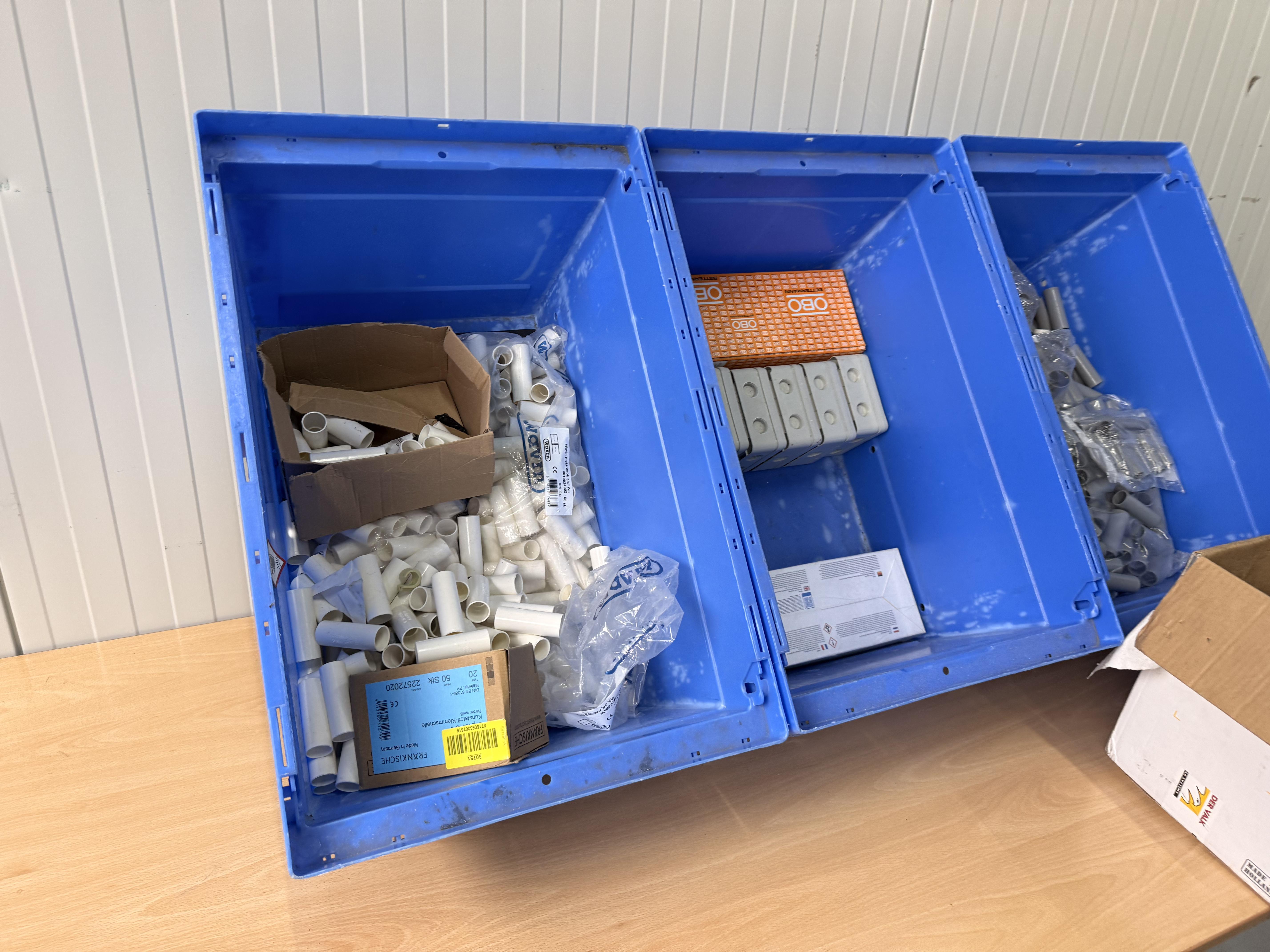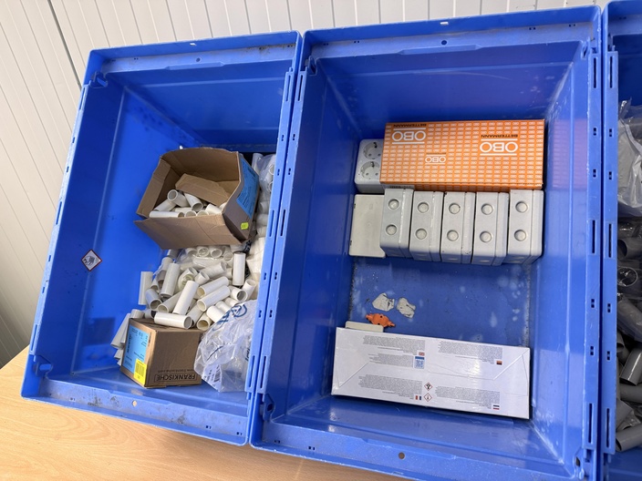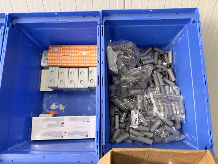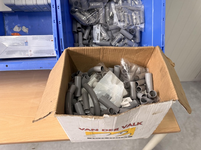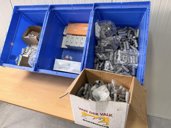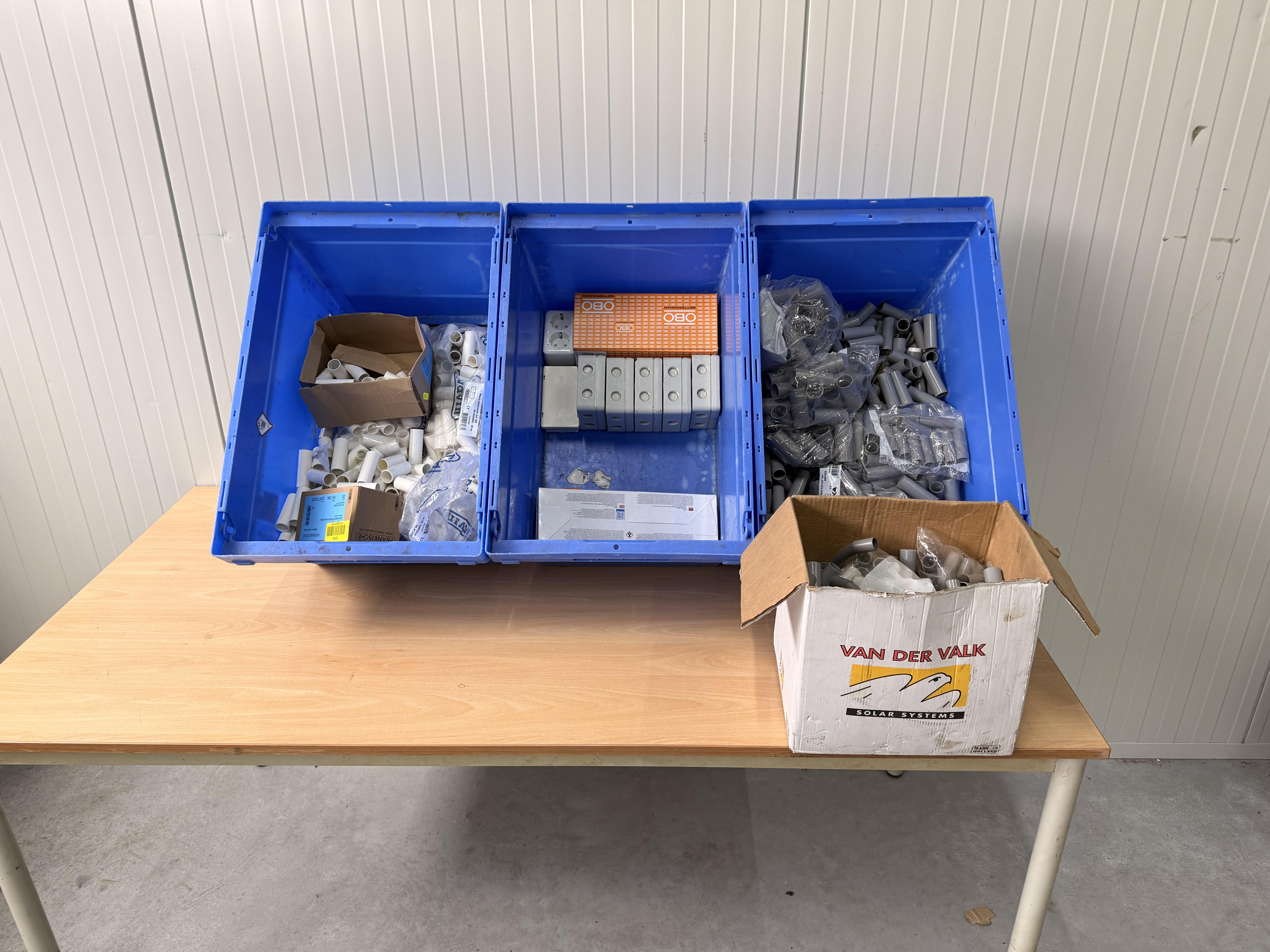 Gemengde partij installatiemateriaal bestaande uit pvc hulpstukken, lasdozen en verbindingsmoffen, gepresenteerd in kunststof magazijnbakken en een kartonnen doos. Zichtbaar op de foto’s: Meerdere grijze pvc verbindingsmoffen (los en in zakken, merk DYK zichtbaar) Witte pvc buisverbindingsstukken en mofjes Oranje doos met OBO-opdruk Grijze opbouw-/lasdozen met wartelopeningen Kartonnen doos “Van der Valk Solar Systems” gevuld met grijze pvc hulpstukken Betreft een gemengde partij bestaande uit losse en verpakte pvc installatieonderdelen voor buisverbinding en opbouwinstallatie. Visuele staat: deels nieuw in verpakking, deels los met lichte opslagsporen.