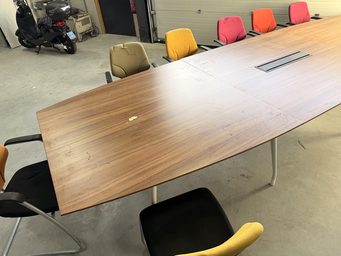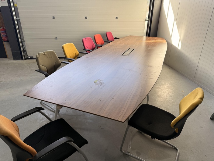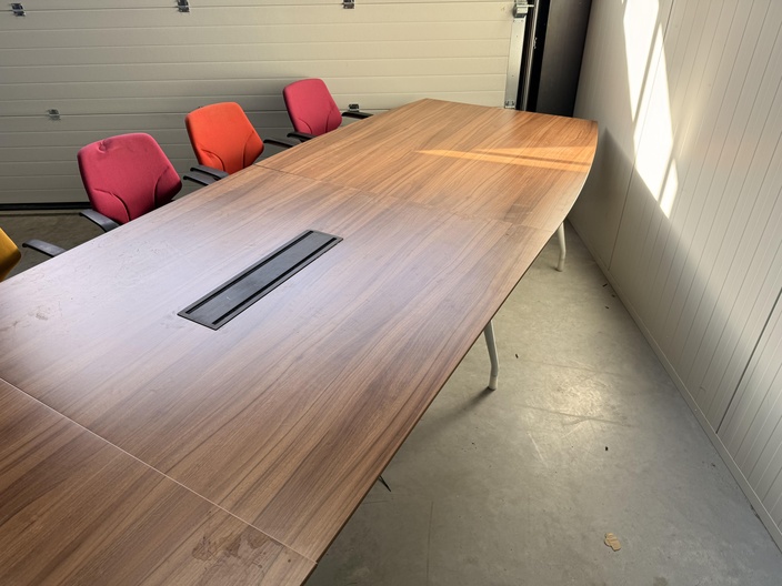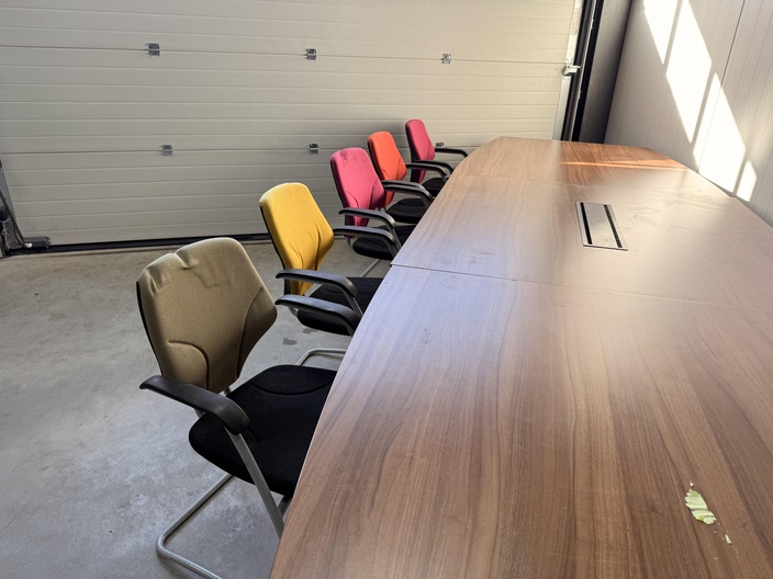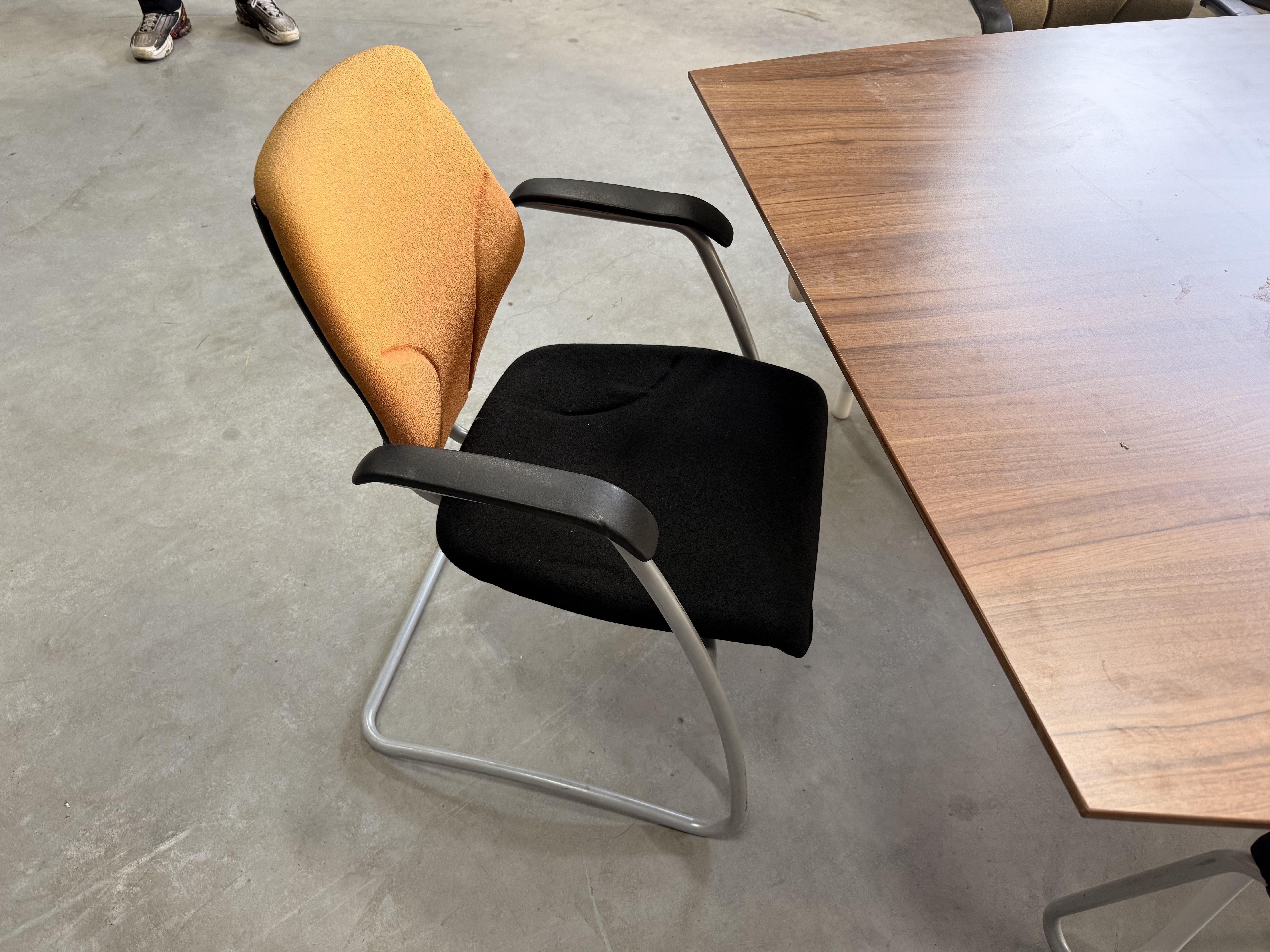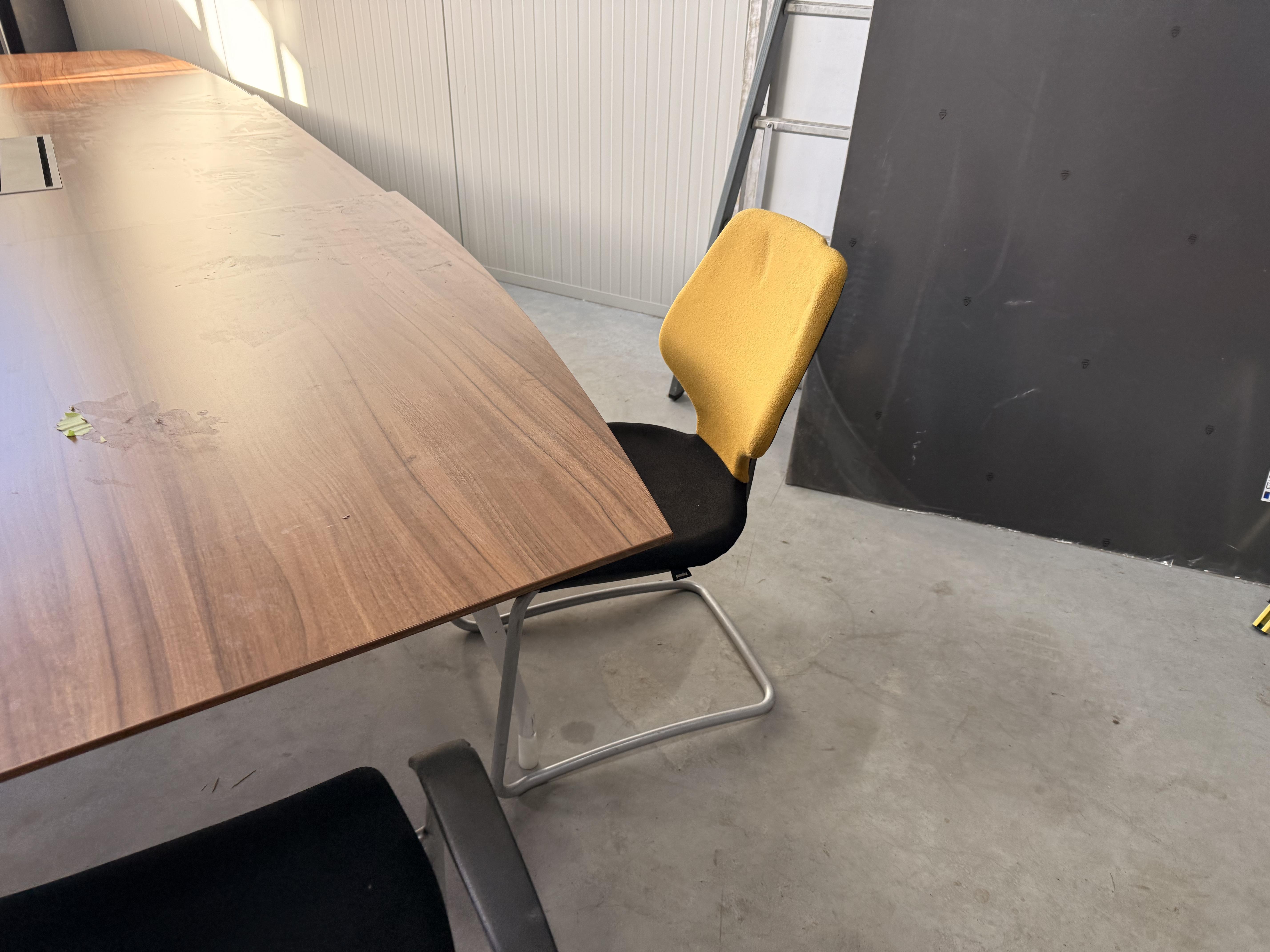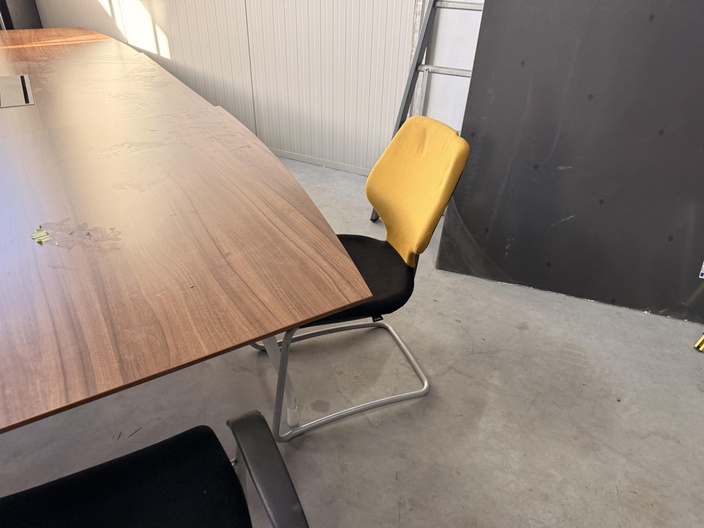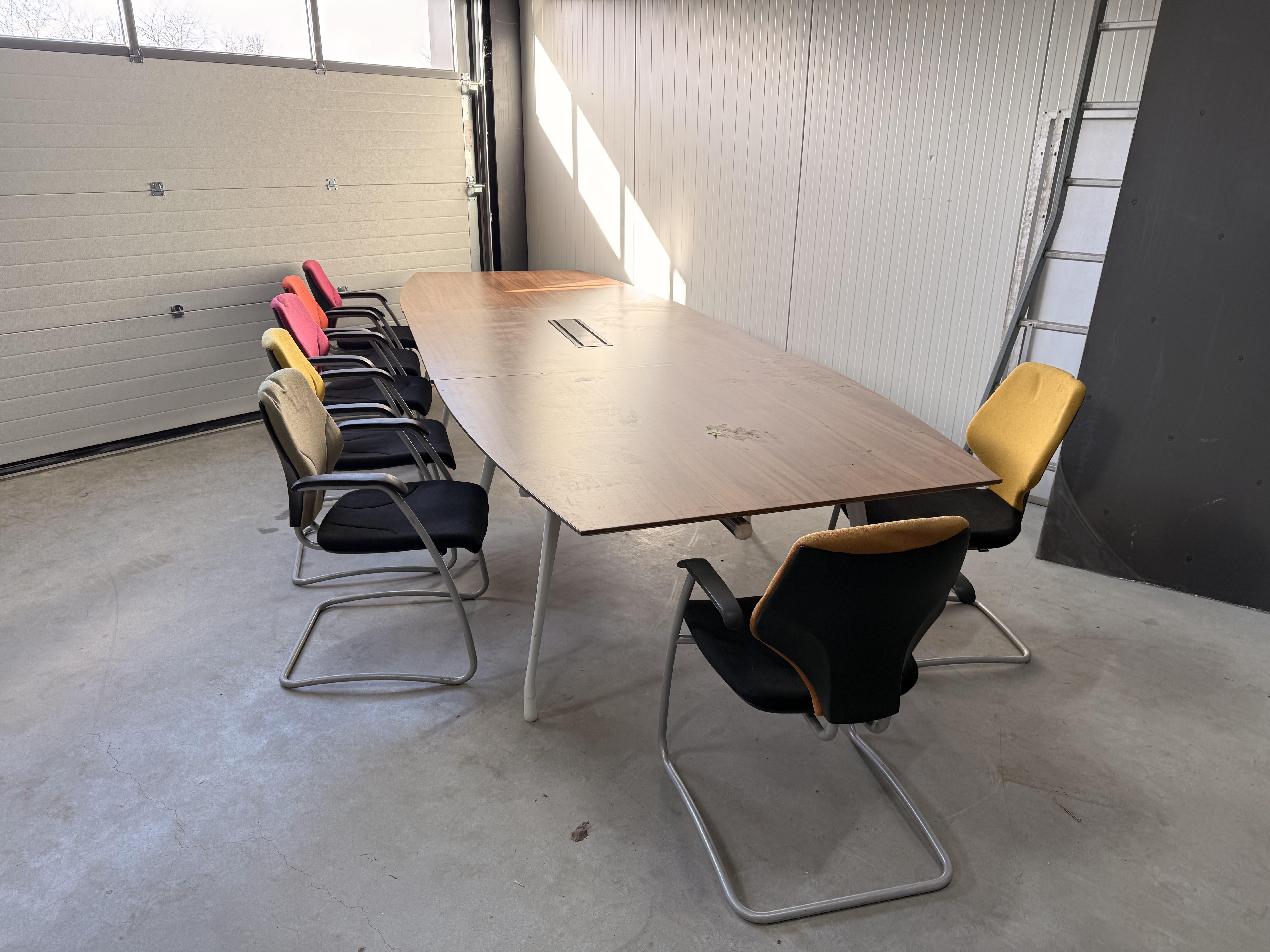 Vergaderset bestaande uit een grote rechthoekige vergadertafel met afgeronde kopse kanten en zes vergaderstoelen met armleuningen. Zichtbaar op de foto’s: Tafelblad in houtlook afwerking Kabeldoorvoer in het midden van het blad Metalen tafelpoten in lichte kleur Zes stoelen met sledeframe Stoelen met zwarte zitting Rugleuningen in verschillende kleuren (geel, rood, roze en beige tinten zichtbaar) Kunststof armleuningen Visuele staat: gebruikt, met zichtbare gebruikssporen op het tafelblad en lichte slijtage aan stoelen.
