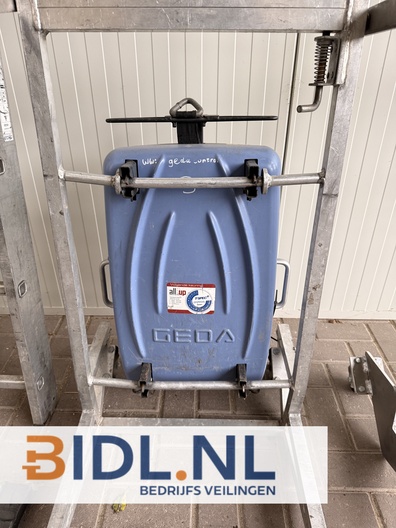 De set bestaat uit meerdere aluminium ladderdelen, een GEDA 250 Comfort lierunit met blauw kunststof motorbehuizing en diverse platformframes.