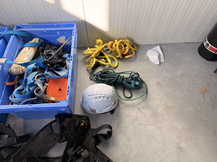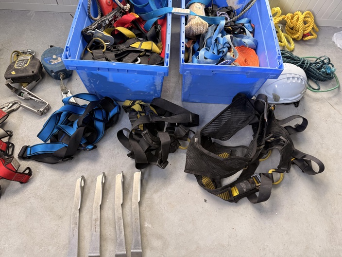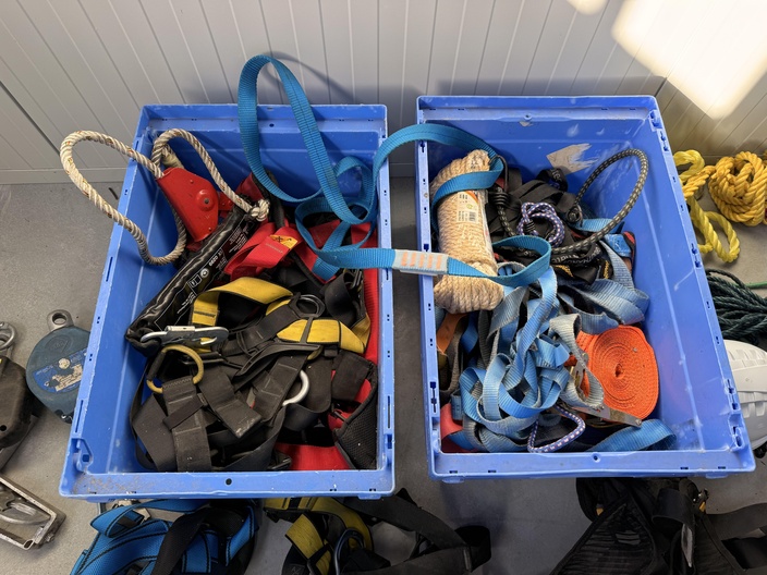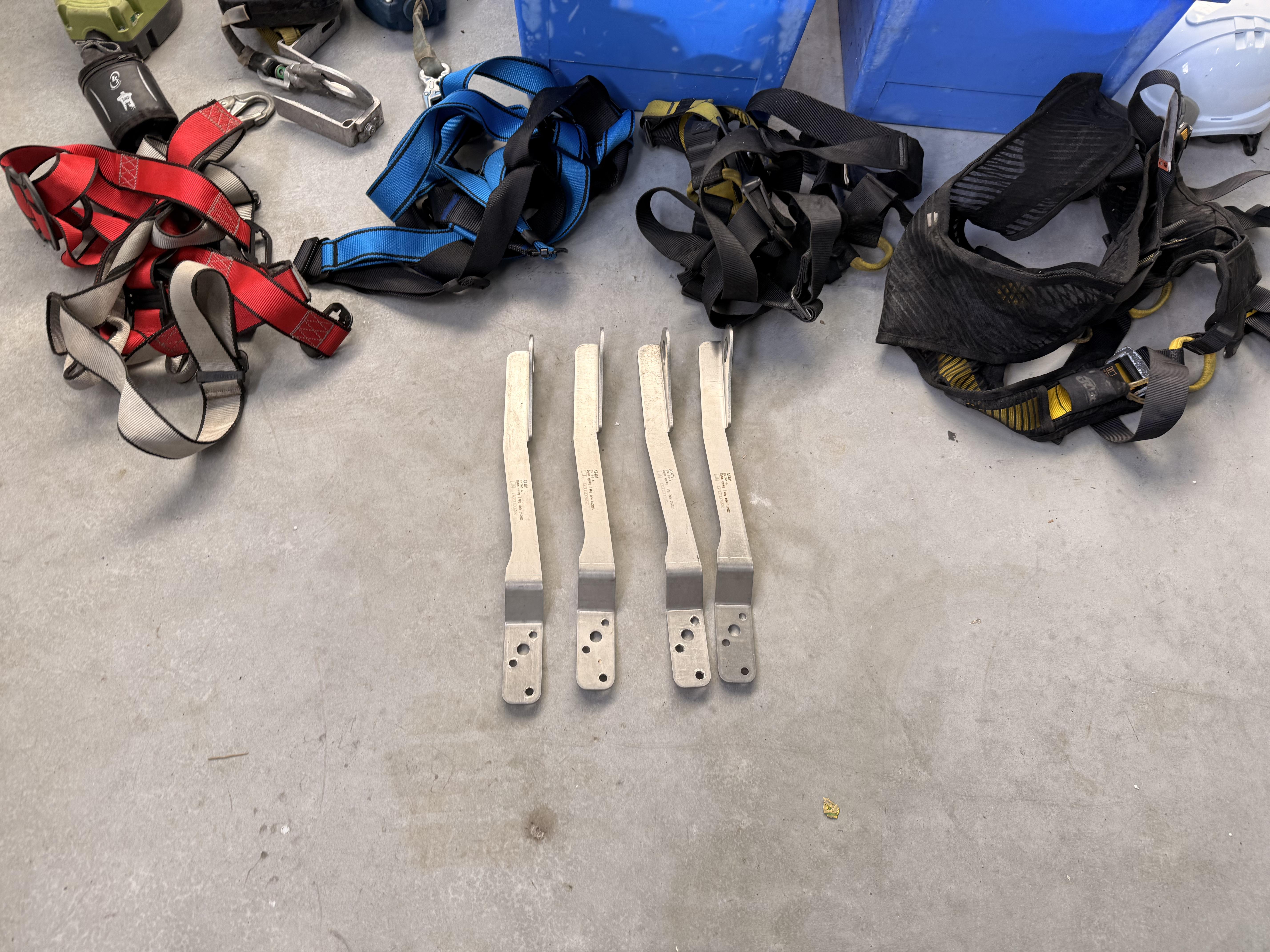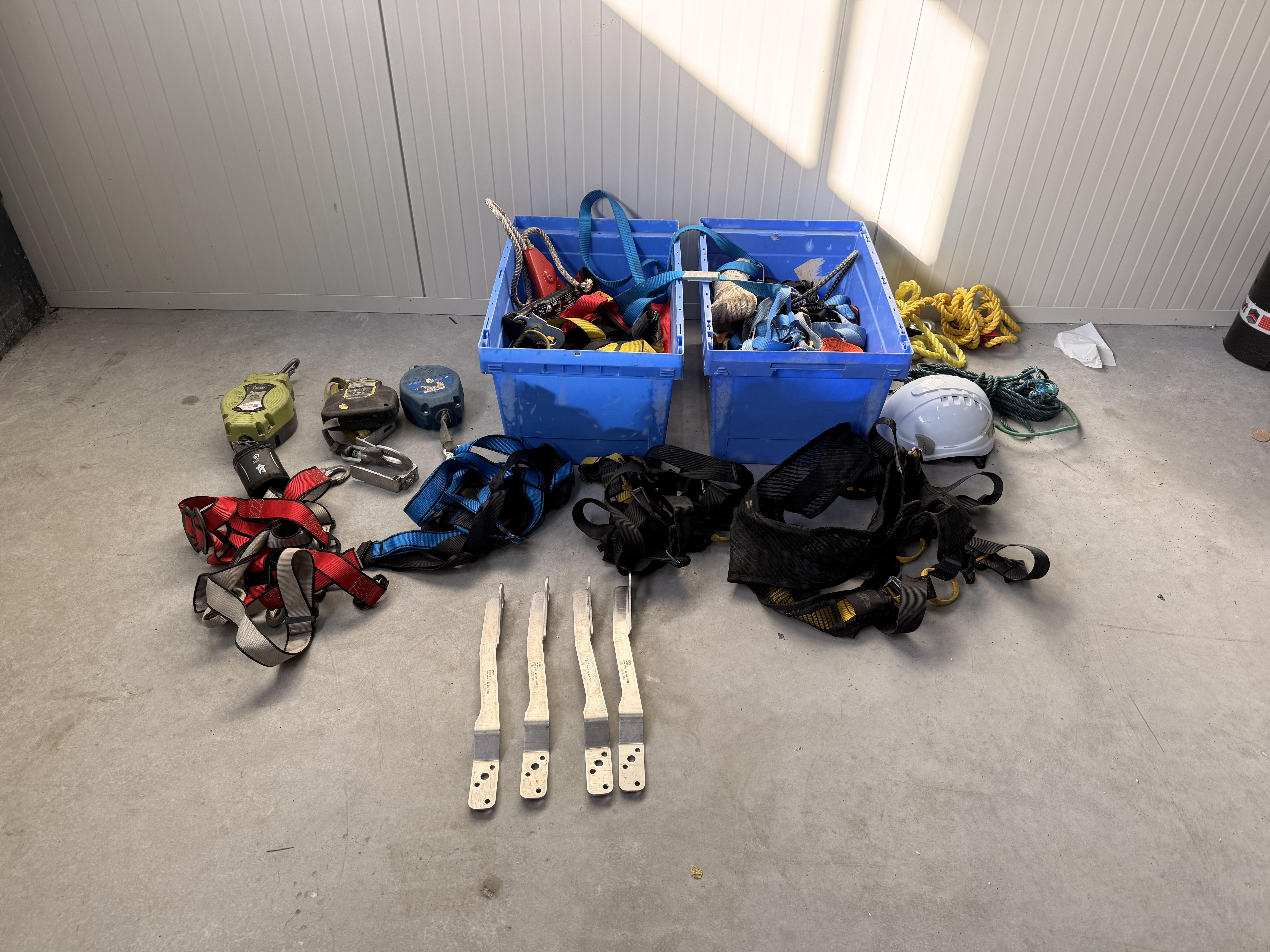 Gemengde partij valbeveiligingsmateriaal en hijs-/sjorbanden, geleverd in kunststof magazijnbakken en los zoals afgebeeld. Zichtbaar op de foto’s: Meerdere veiligheidsharnassen in diverse kleuren (rood, blauw, zwart/geel) Twee kunststof bakken gevuld met spanbanden, hijsbanden en bevestigingsmateriaal Meerdere valblokken / valstopapparaten (3 stuks zichtbaar, verschillende uitvoeringen) Karabijnhaken en metalen verbindingsstukken Gele en groene touwen Veiligheidshelm (wit) Vier metalen bevestigingsbeugels / ankerdelen Materiaal betreft een gemengde partij valbeveiliging en toebehoren voor werken op hoogte. Visuele staat: gebruikt, met zichtbare gebruikssporen. Keuring- en certificeringsstatus onbekend. Levering als één partij zoals getoond.