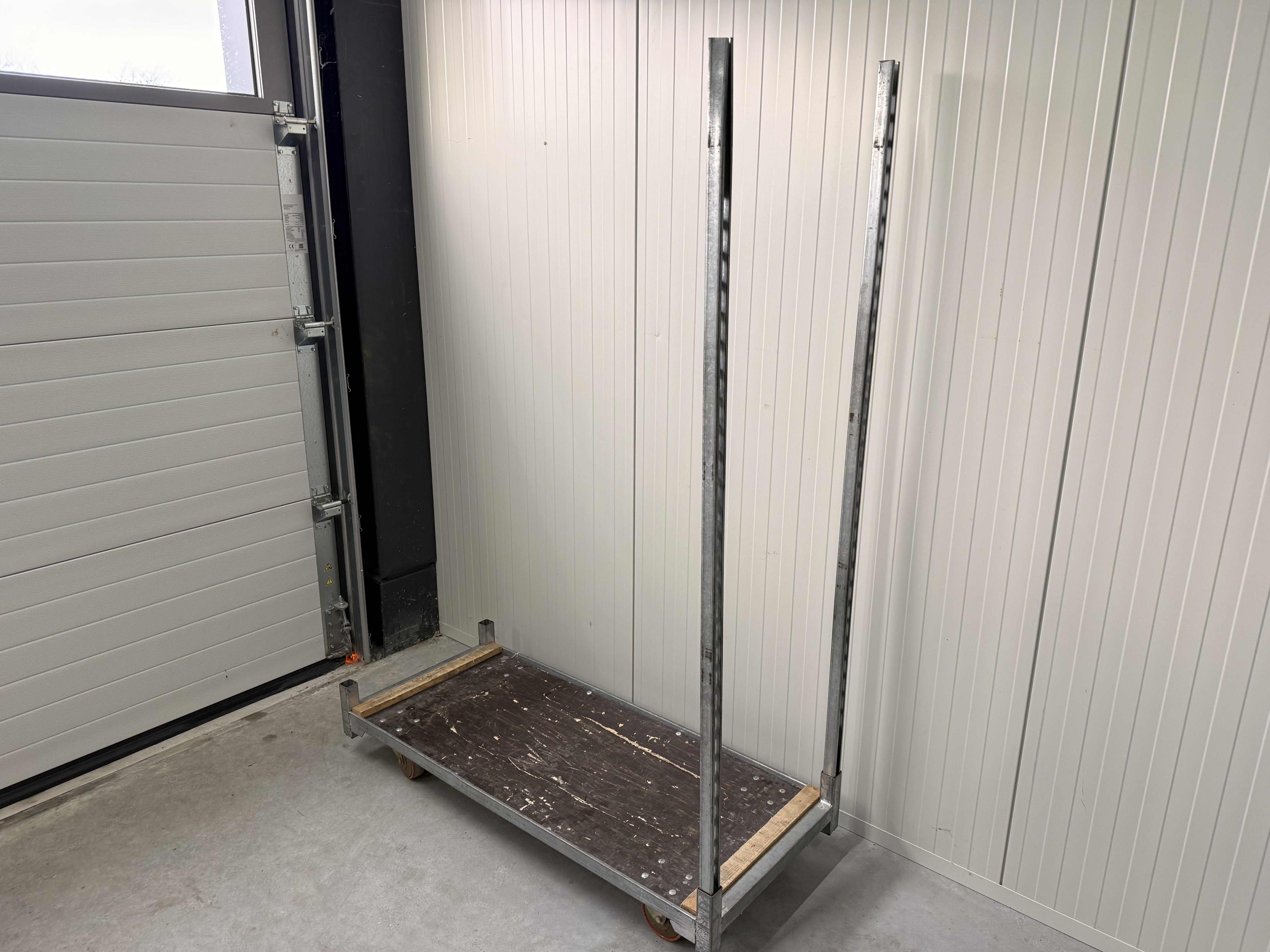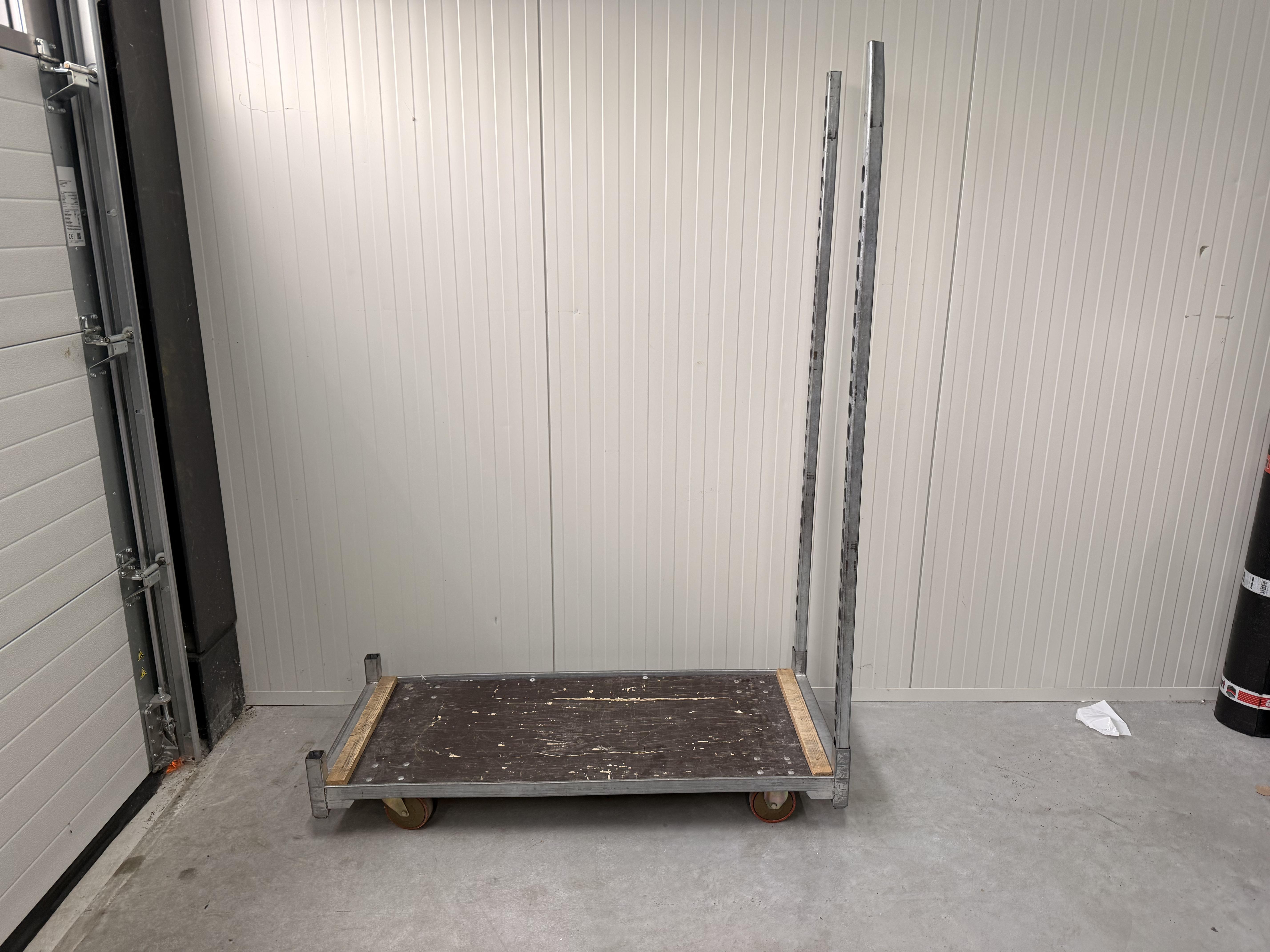 Stalen transportkar met rechthoekig houten laadplatform in metalen frame. Voorzien van vier zwenkwielen met rode loopvlakken. Aan één zijde gemonteerd met twee verticale metalen staanders voor het rechtop vervoeren van panelen, platen of vergelijkbare materialen. Laadvlak vertoont gebruikssporen.