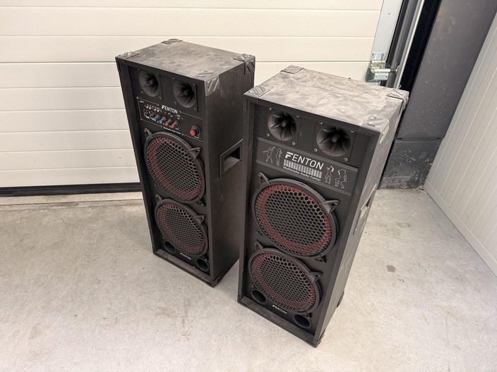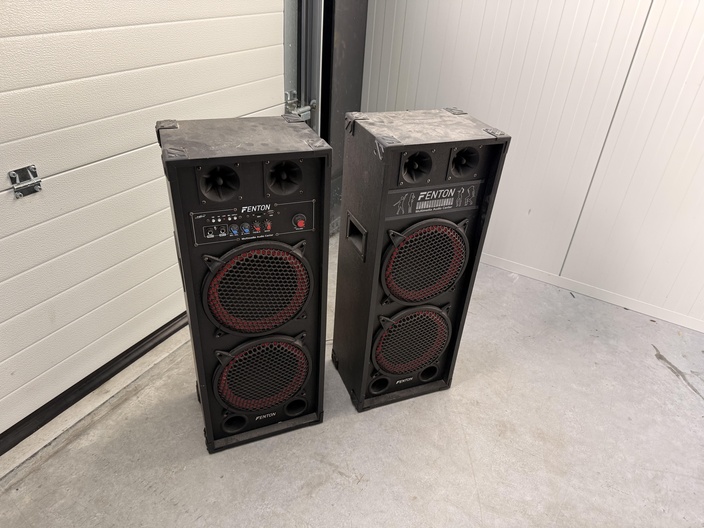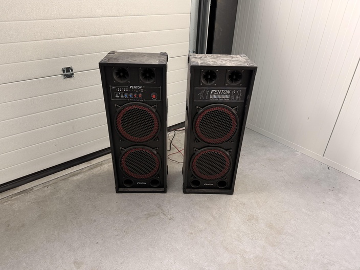Set van twee staande luidsprekers van het merk Fenton. Beide speakers hebben aan de voorzijde twee grote woofers met rode accentring en twee tweeters bovenin. Eén speaker is voorzien van een bedieningspaneel met knoppen en aansluitingen aan de voorzijde. De andere speaker heeft een identieke frontopbouw zonder zichtbaar bedieningspaneel. Behuizing in zwarte uitvoering met zichtbare gebruikssporen en stofvorming aan de bovenzijde. Inclusief onderlinge bekabeling zoals zichtbaar op de foto’s. Werking onbekend en niet getest.