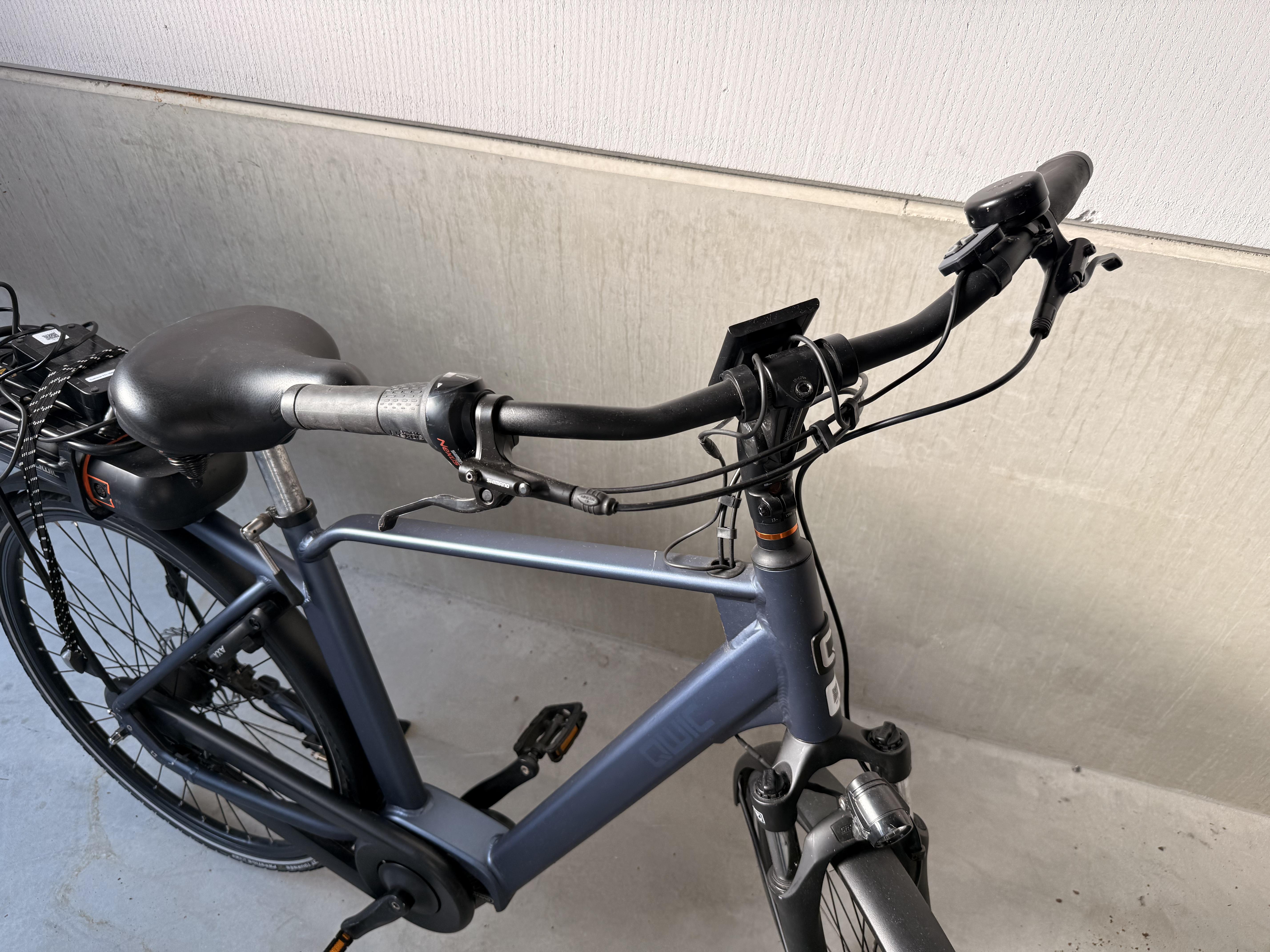 Elektrische fiets van het merk QWIC uitgevoerd in een blauwe kleur met zwarte componenten. De fiets heeft een frame met hoge instap en een rechte bovenbuis. Op de schuine buis van het frame is de merknaam “QWIC” zichtbaar.