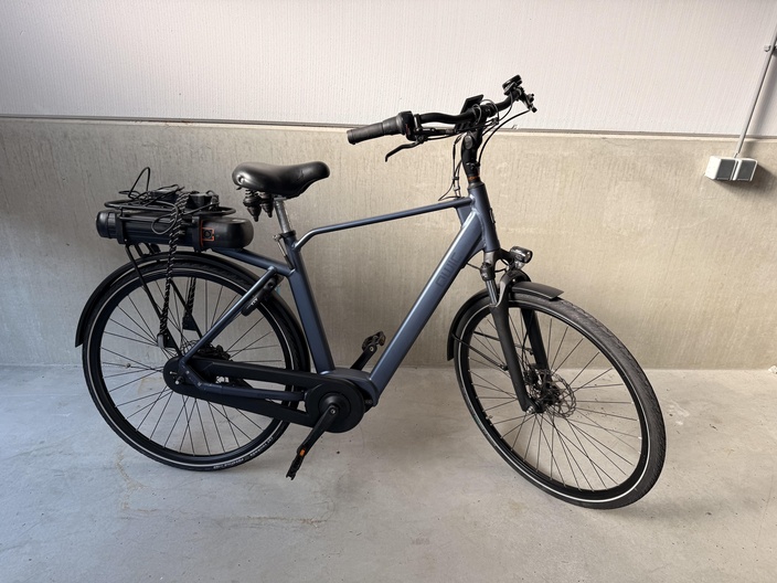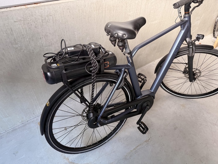 De fiets beschikt over spatborden voor en achter en een bagagedrager aan de achterzijde. Op de bagagedrager is een geïntegreerde accu zichtbaar. Op de accu liggen een oplader en kabels die met een band zijn vastgezet.