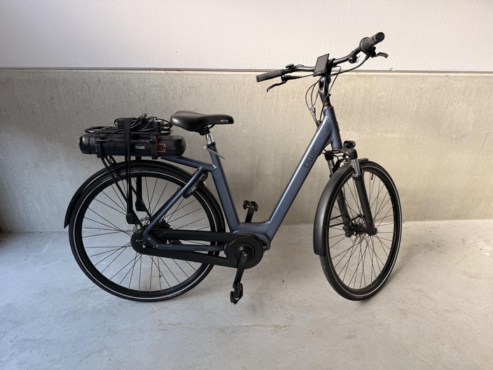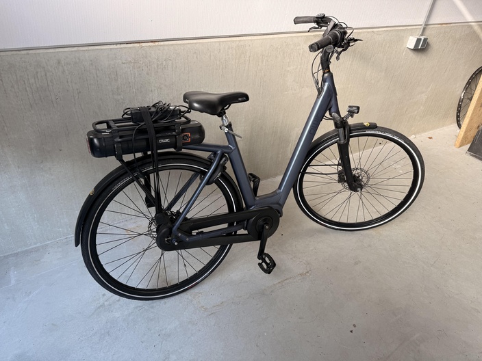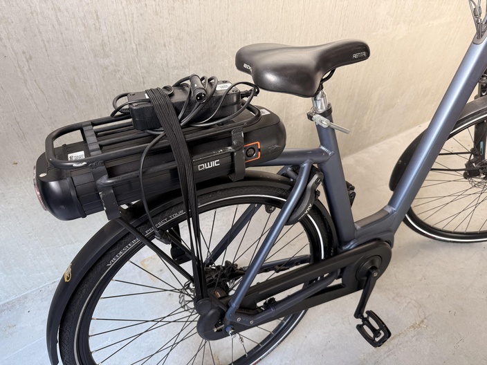 De fiets beschikt over spatborden voor en achter en een bagagedrager aan de achterzijde. Op de bagagedrager is een geïntegreerde accu zichtbaar. Op de accu liggen een oplader en kabels die met een band zijn vastgezet.