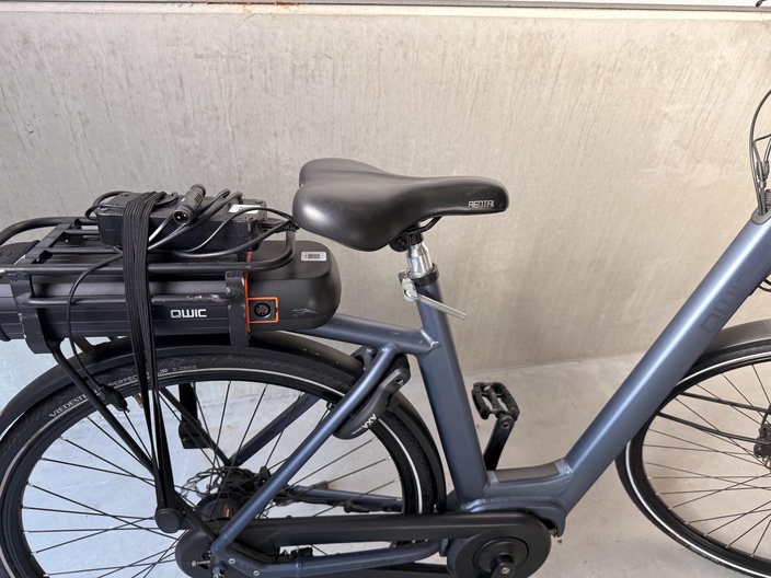 Elektrische fiets van het merk QWIC uitgevoerd in een blauwe kleur met zwarte componenten. De fiets heeft een frame met hoge instap en een rechte bovenbuis. Op de schuine buis van het frame is de merknaam “QWIC” zichtbaar.