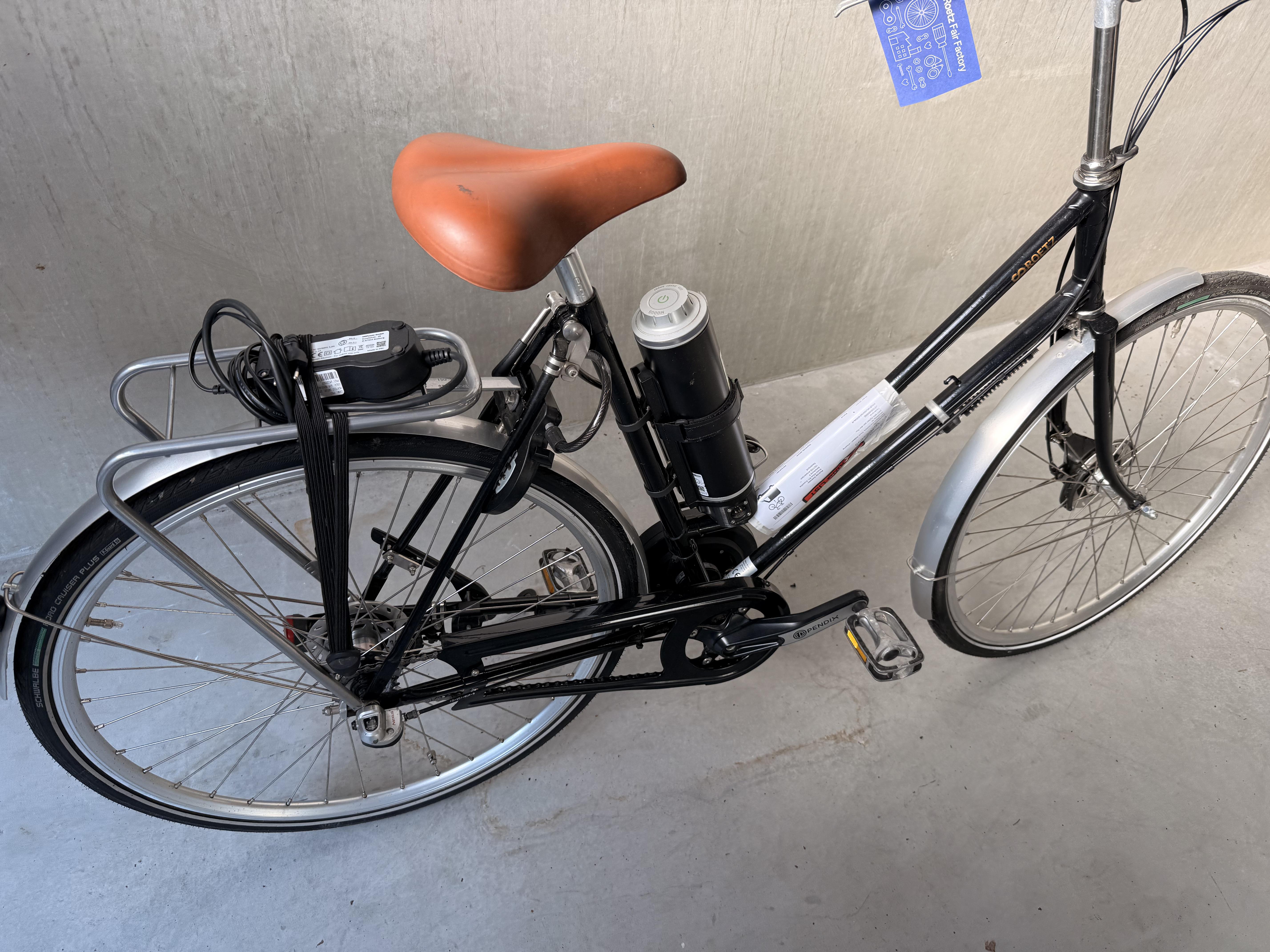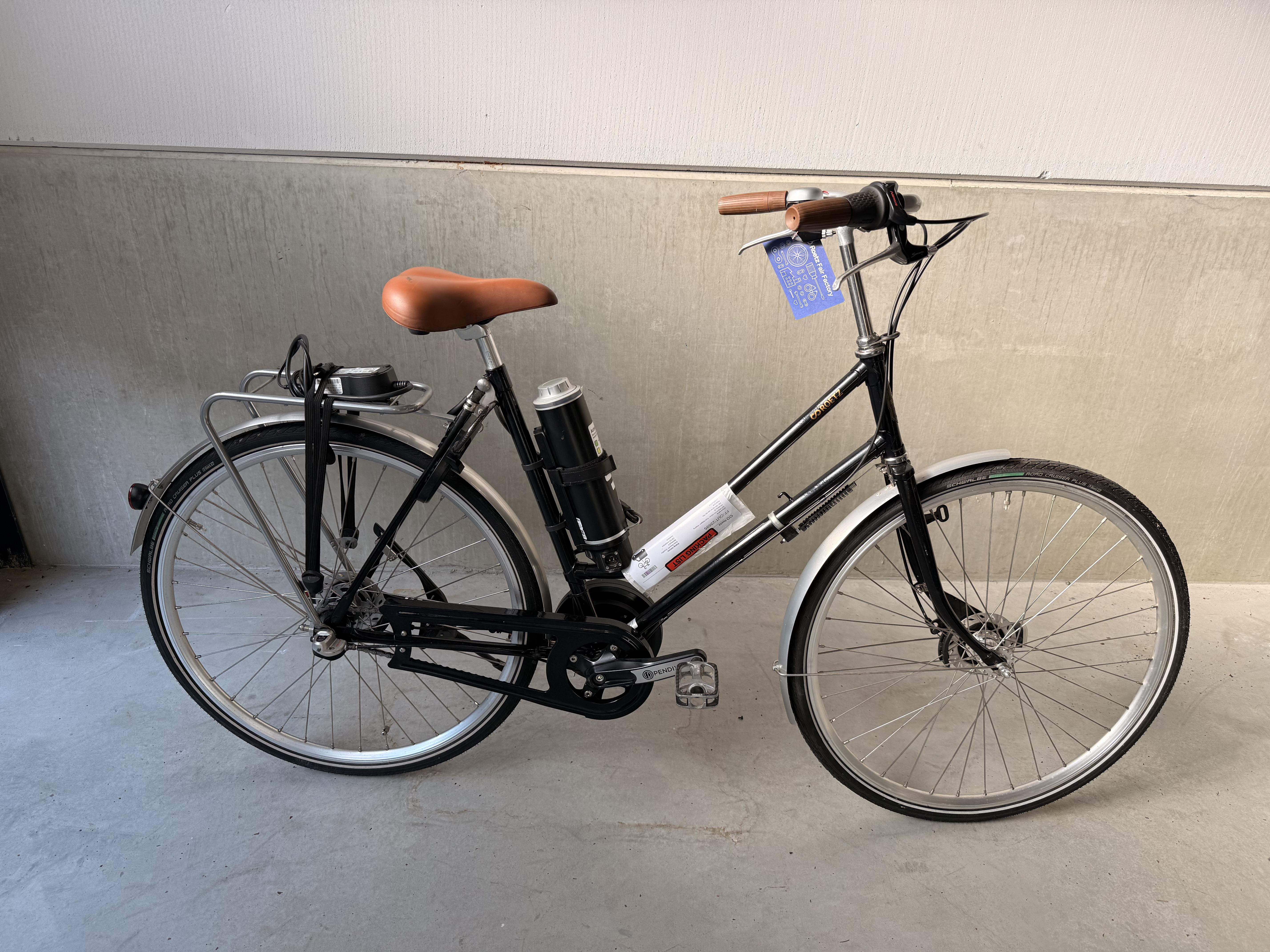 In het midden van het frame is een cilindervormige accu gemonteerd in een houder op de schuine buis. De fiets beschikt over een voorwielmotor. Verder zichtbaar zijn spatborden voor en achter, een bagagedrager aan de achterzijde en een achterlicht.