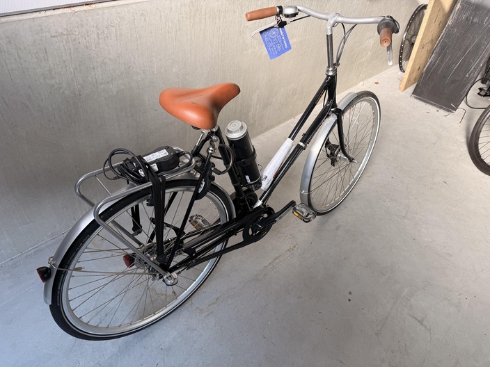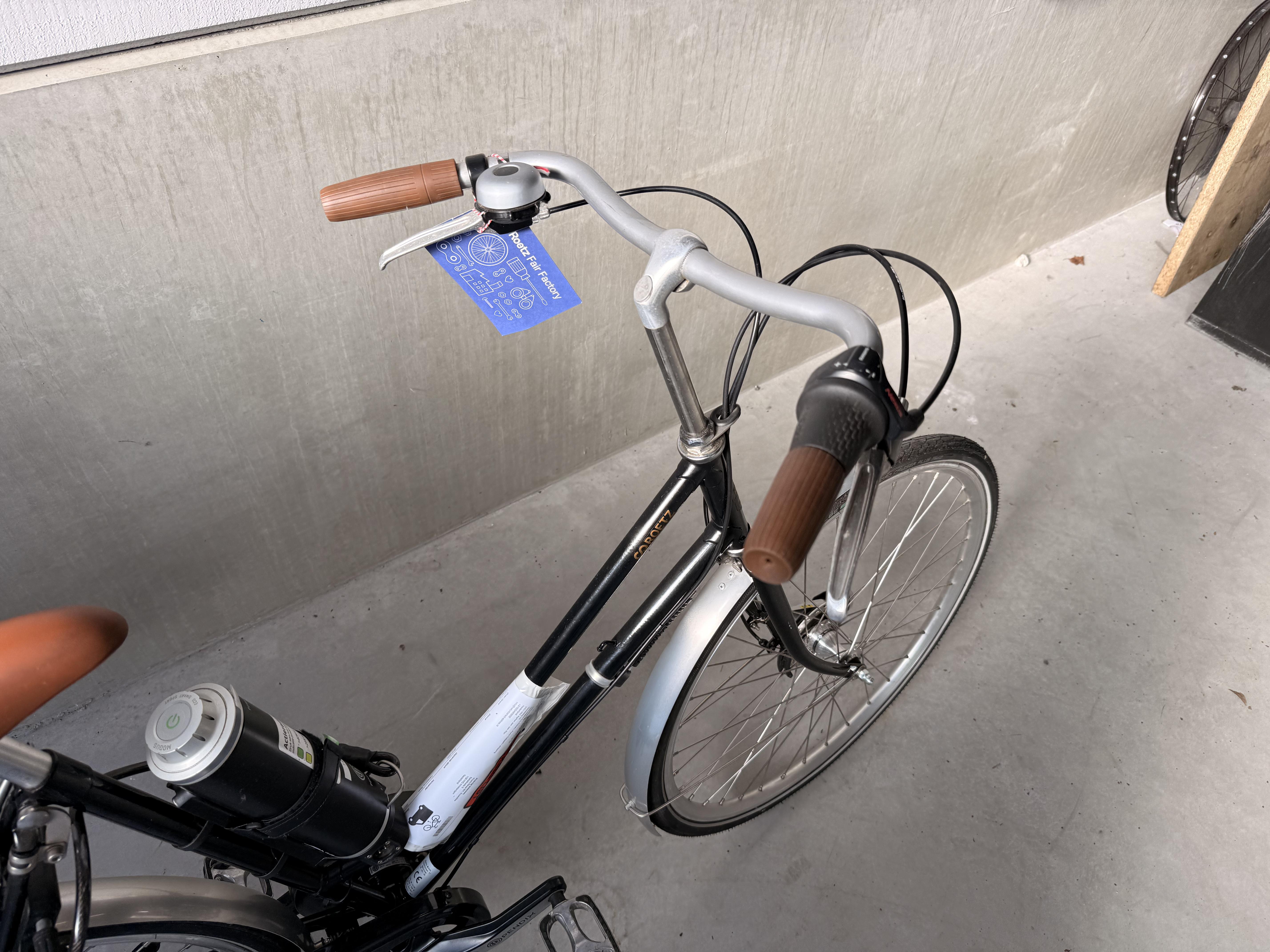 De fiets is voorzien van een stuur met handremmen, een bel en handvatten in bruine kleur. Aan het stuur hangt een labelkaart. Het zadel is eveneens uitgevoerd in een bruine kleur.
